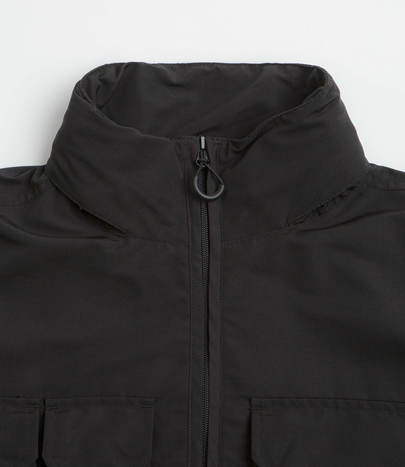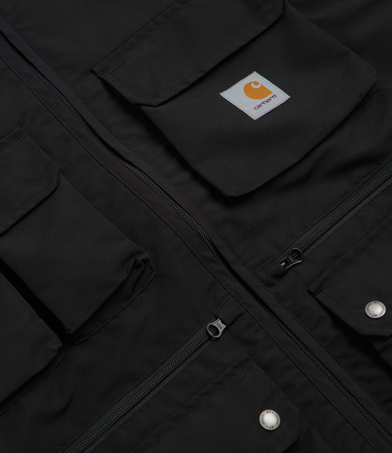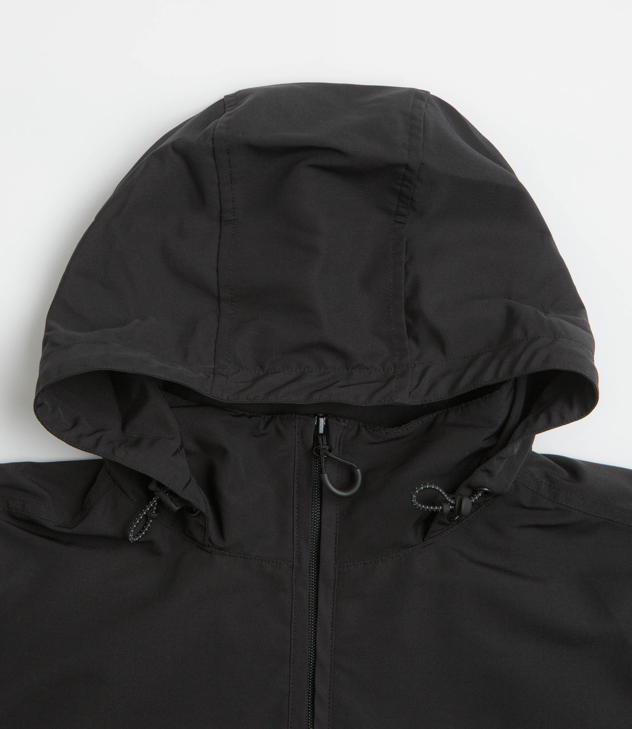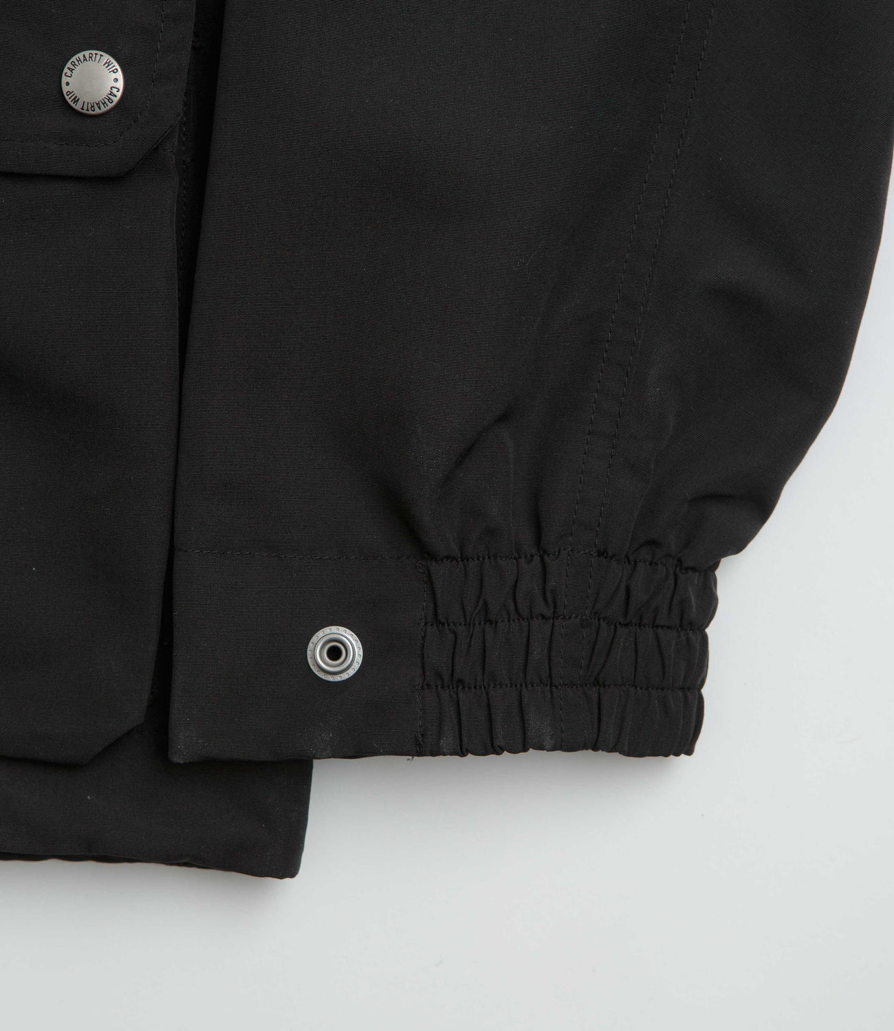 Carhartt Irwin Jacket in Black. Designed with a water-repellent shell and a detachable hood, this Carhartt jacket is made from 100% polyester poplin with a lined inner and sleeves. Featuring a two-way zipper fastening, adjustable cuffs, a rear D-ring attachment and multiple chest pockets, this black Carhartt jacket is finished with woven flag lable branding.