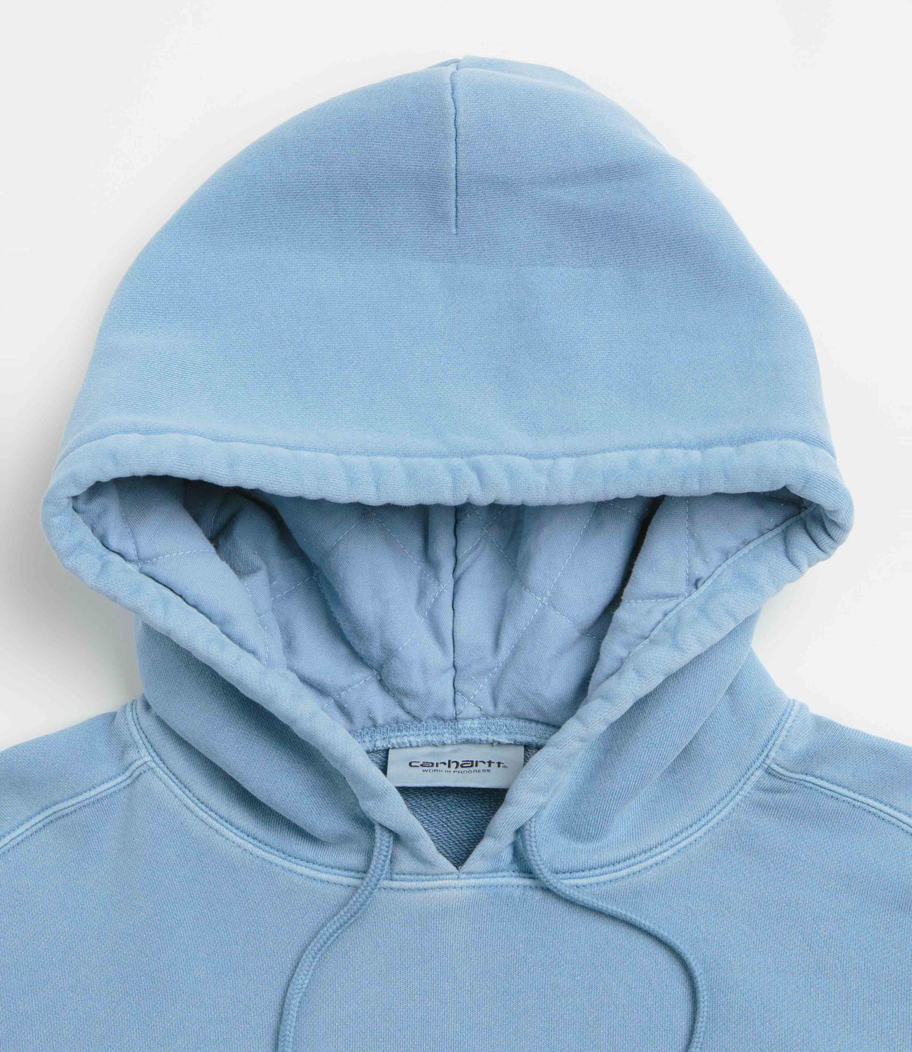 Made from 100% cotton sweat with an unbrushed finish, this Carhartt hoodie is built for everyday ease. The adjustable diamond-quilted hood adds a bit of rugged detail, while dropped shoulders and ribbed cuffs keep the fit relaxed and ready for layering. Pigment dyed in light blue, it’s finished with a kangaroo pocket and signature woven flag label.