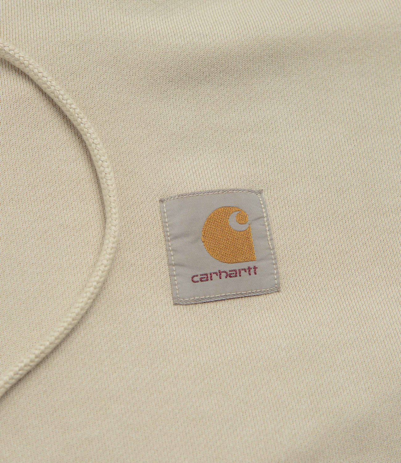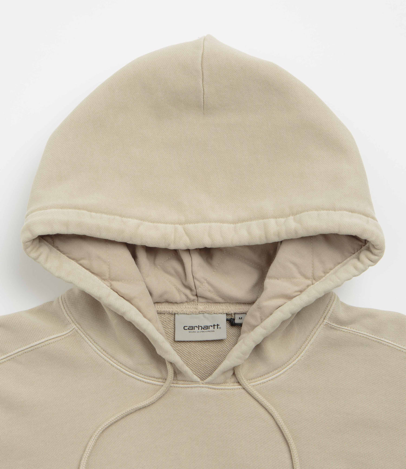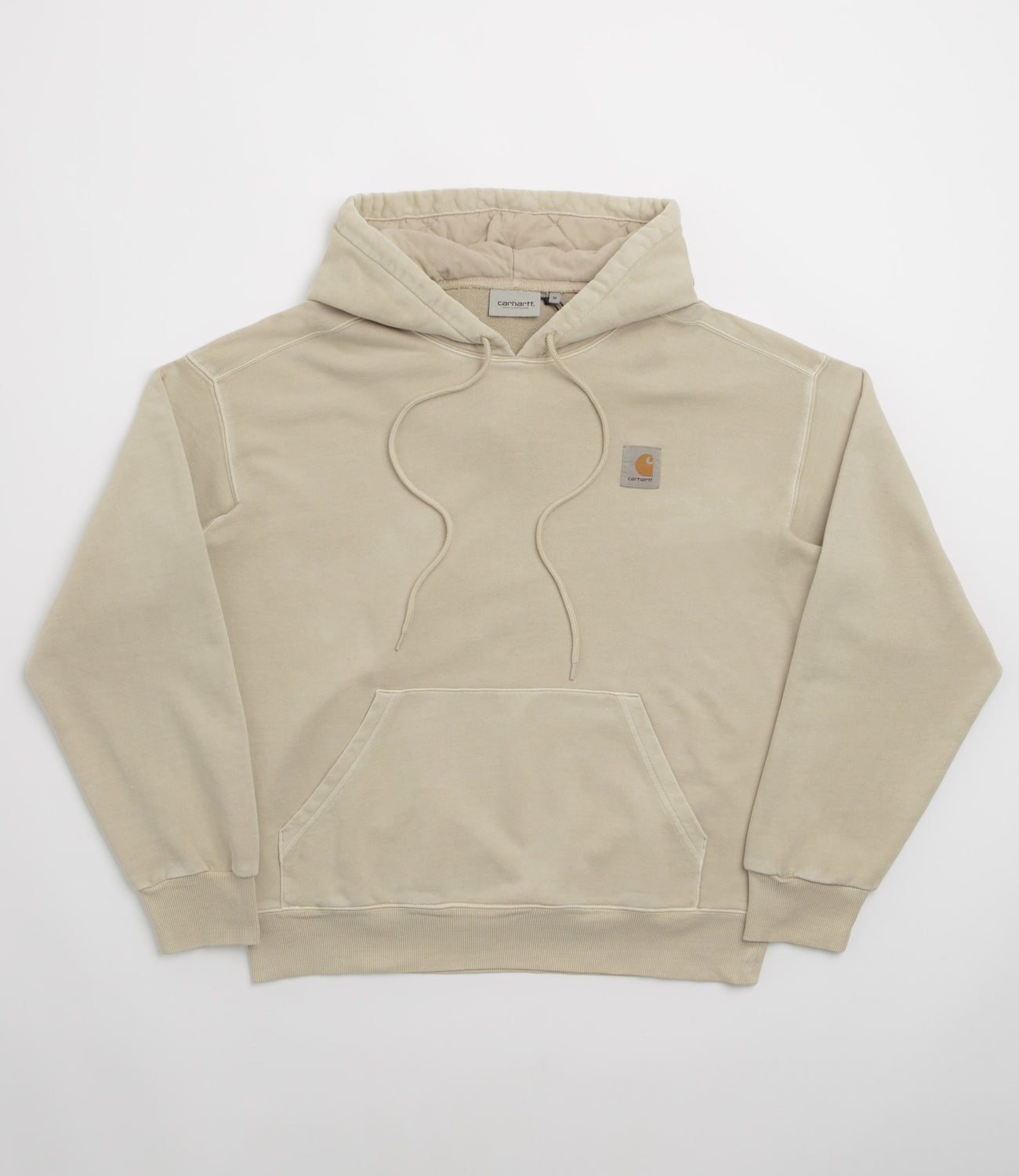 Carhartt Nelson Hoodie in Fleur De Sel. Tailored to a balloon fitting with a pigment dye, this unbrushed Carhartt hoodie is crafted from 100% cotton sweat. Featuring an adjustable diamond-quilted hood, dropped shoulders and a kangaroo front pocket, this khaki Carhartt hoodie is finished with ribbed cuffs and woven flag label branding.