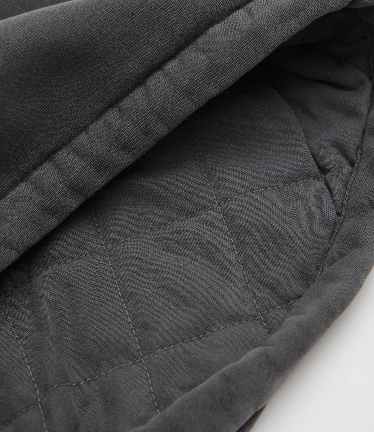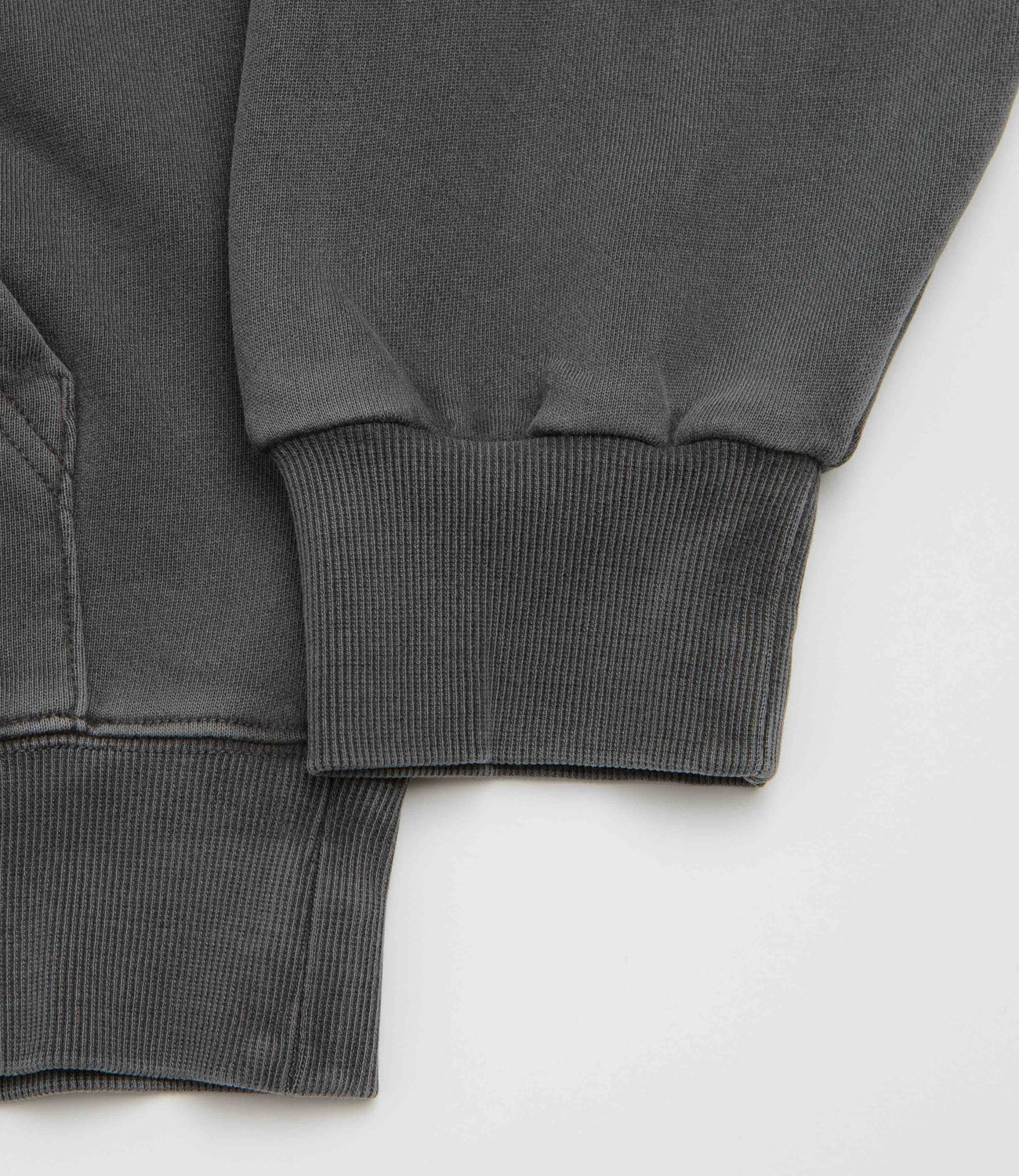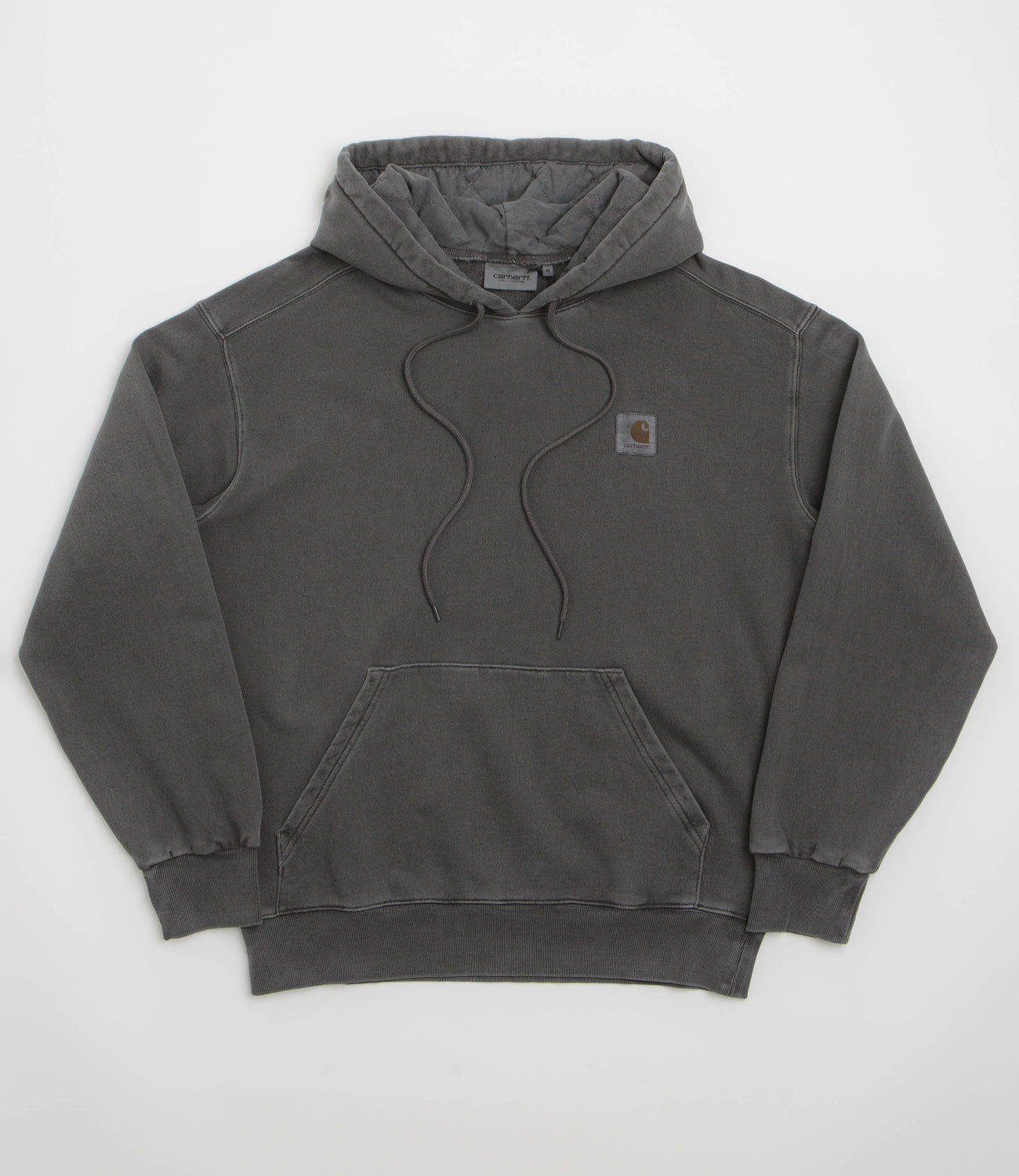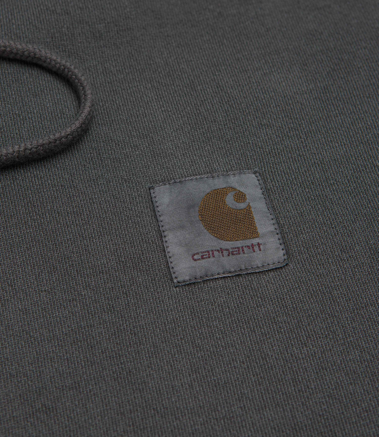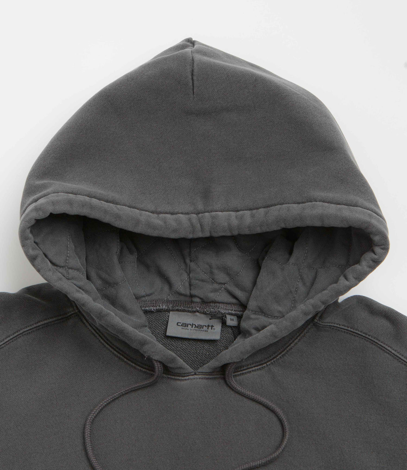 Carhartt Nelson Hoodie in Graphite. Pigment dyed and made from 100% cotton sweat, this balloon fitting Carhartt hoodie is designed with an adjustable diamond-quilted hood. Featuring dropped shoulders, ribbed cuffs and a kangaroo front pocket, this grey Carhartt hoodie is finished with a woven elastic hem and flag label branding.