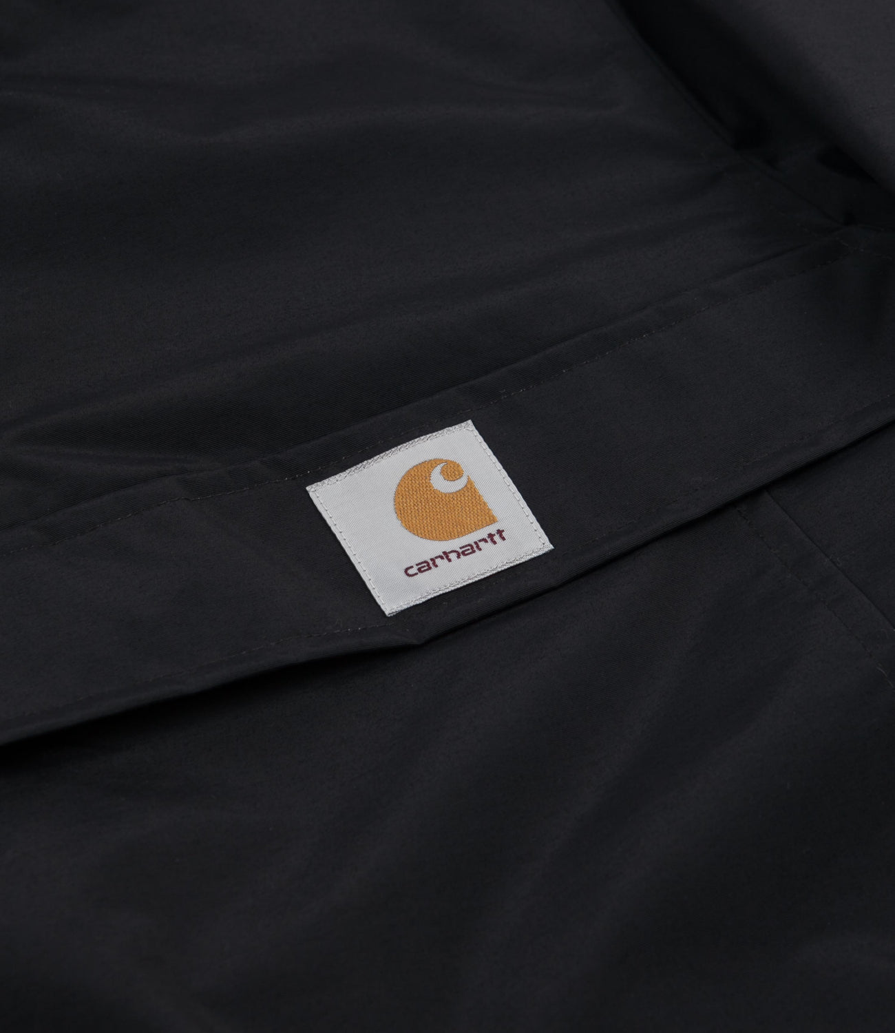Carhartt Nimbus Pullover Jacket in Black. Crafted from 100% nylon Supplex® and tailored to a regular fitting, this black Carhartt jacket is styled with a water-repellent teflon exterior with a fleece lined inner. Featuring adjustable cuffs, an adjustable hemline and a practical side zipper opening, this pullover jacket also features a dual toggle hood with a concealed quarter-length zipper. Finished with tonal stitched seams, zippered pockets and with an embroidered flag label across the centre chest yoke.