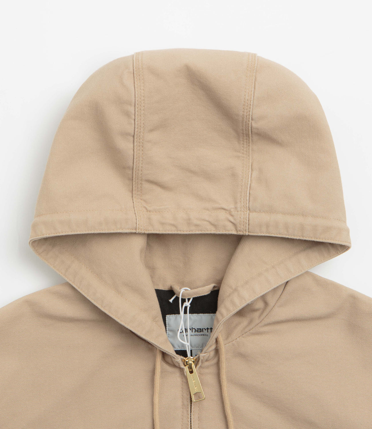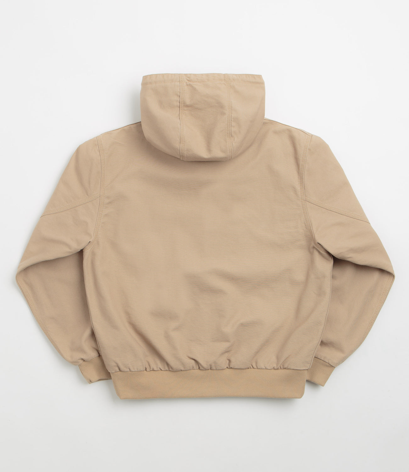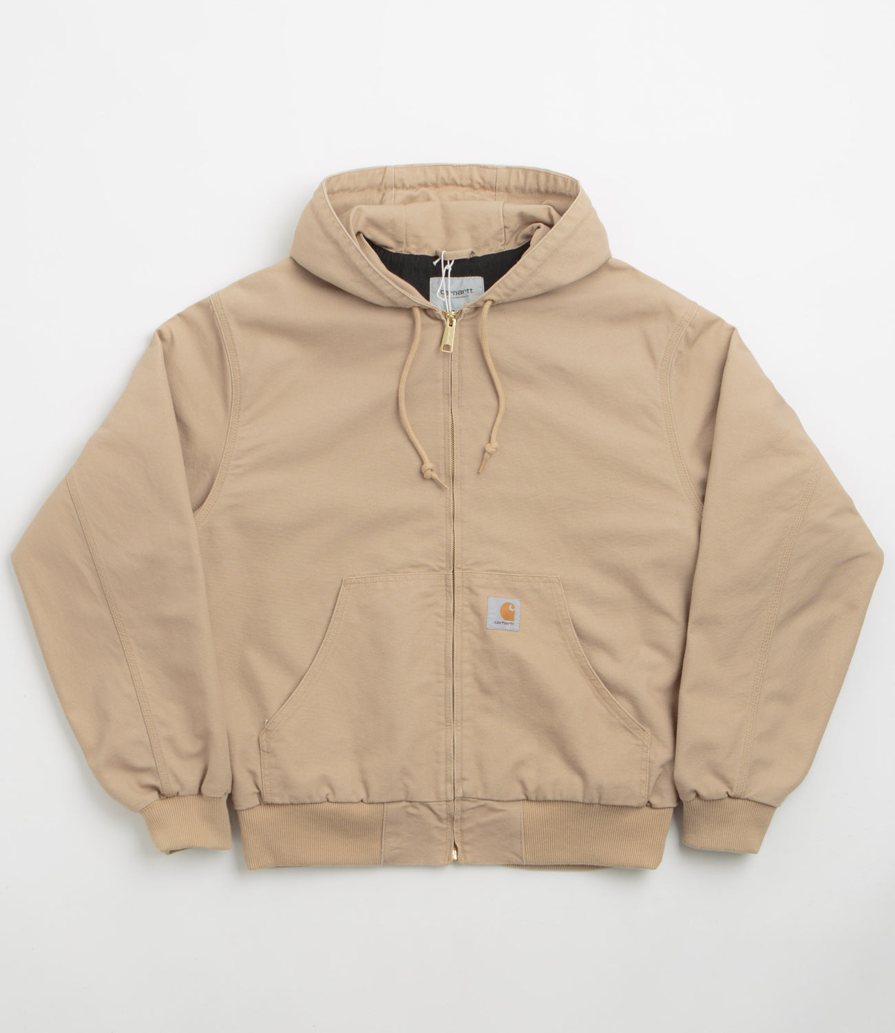 Carhartt OG Active Jacket in Dusty Hamilton Brown Rinsed. Tailored to an original loose fitting, this Carhartt jacket is made from 100% organic cotton ‘Dearborn’ canvas. Featuring a lined body, triple stitched seams and an adjustable drawstring hood, this brown Carhartt jacket is finished with a full length zipper fastening, ribbed cuffs, two front pockets and woven flag label branding.