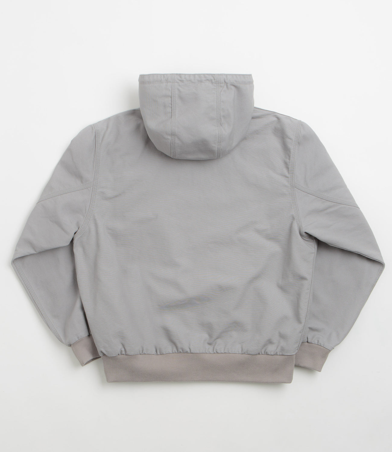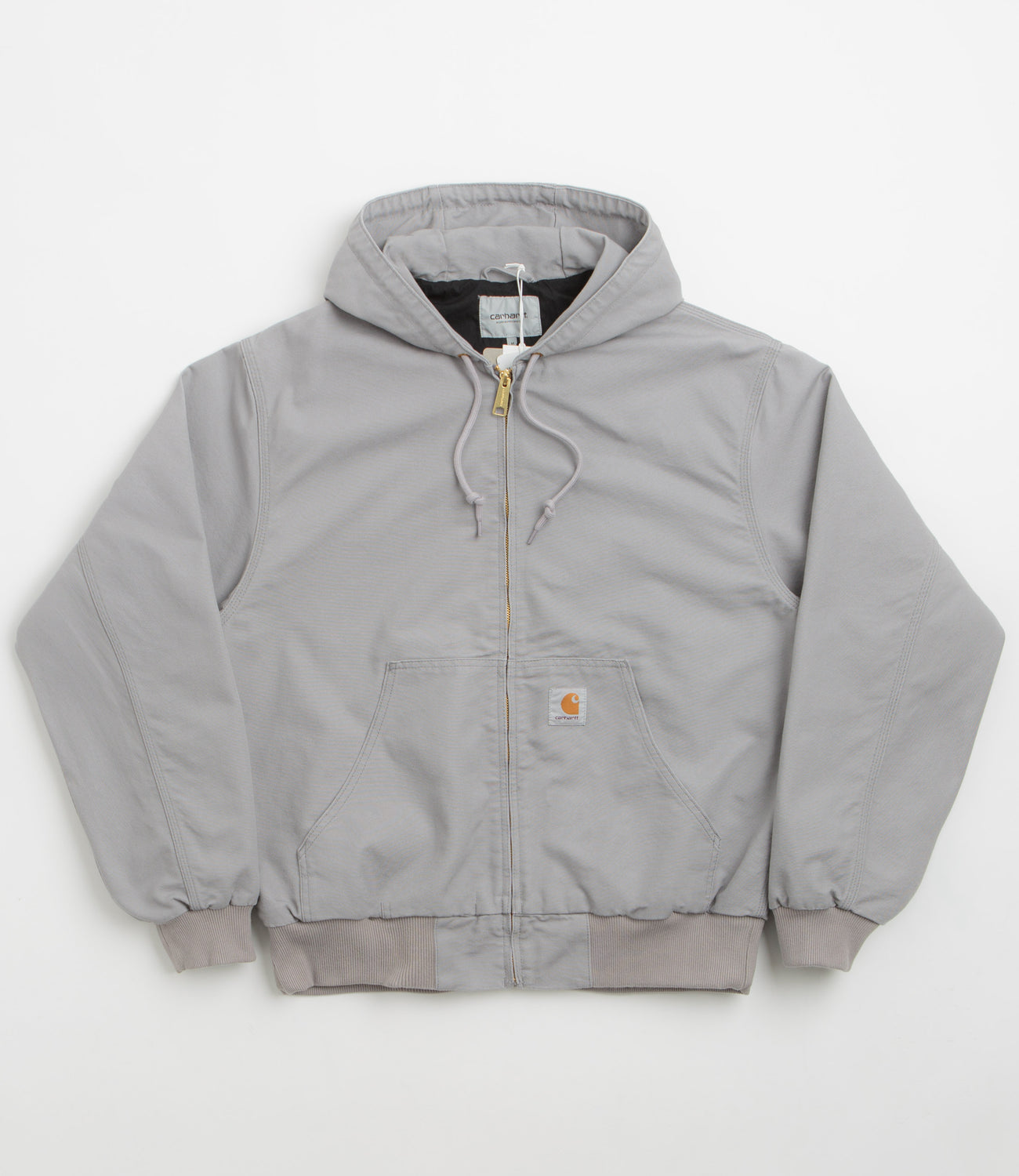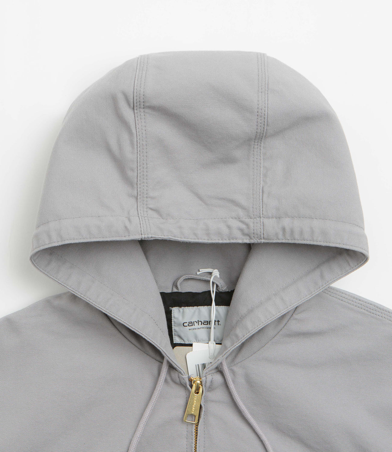 Carhartt OG Active Jacket in Yosemite Rinsed. Made from 100% organic cotton ‘Dearborn’ canvas, this loose fitting Carhartt jacket is designed with a rinsed fabric construction. Featuring a poplin lined body, an adjustable hood, a full length zipper fastening and ribbed cuffs, this grey beige Carhartt jacket is finished with two front pockets and woven flag label branding.