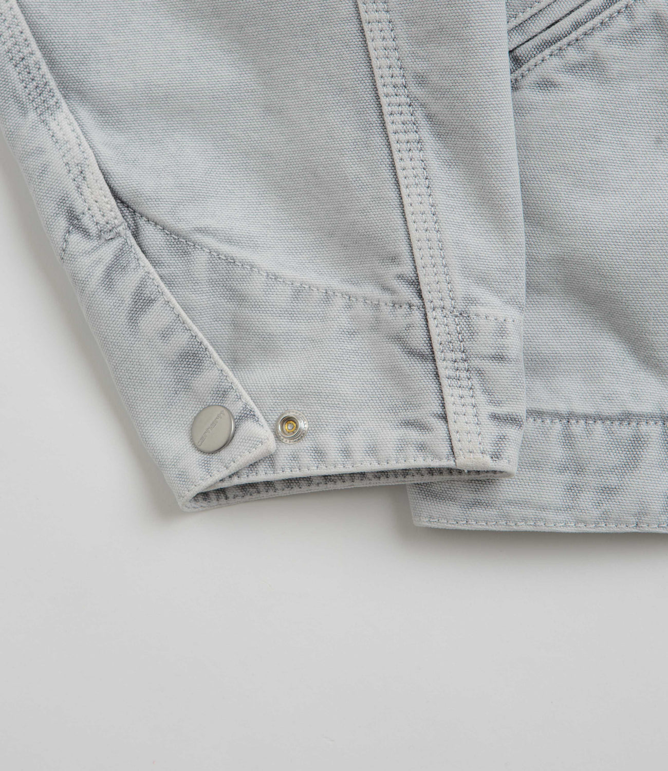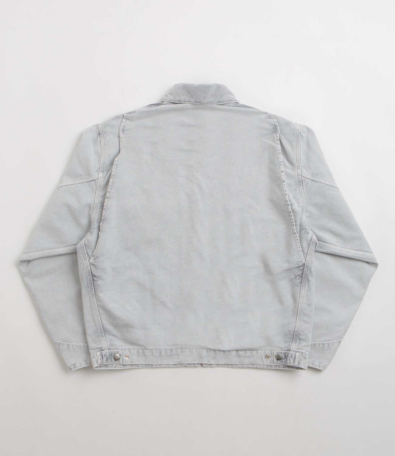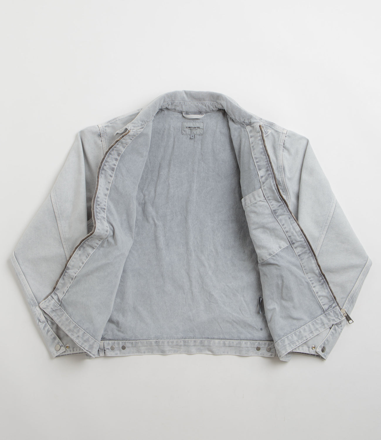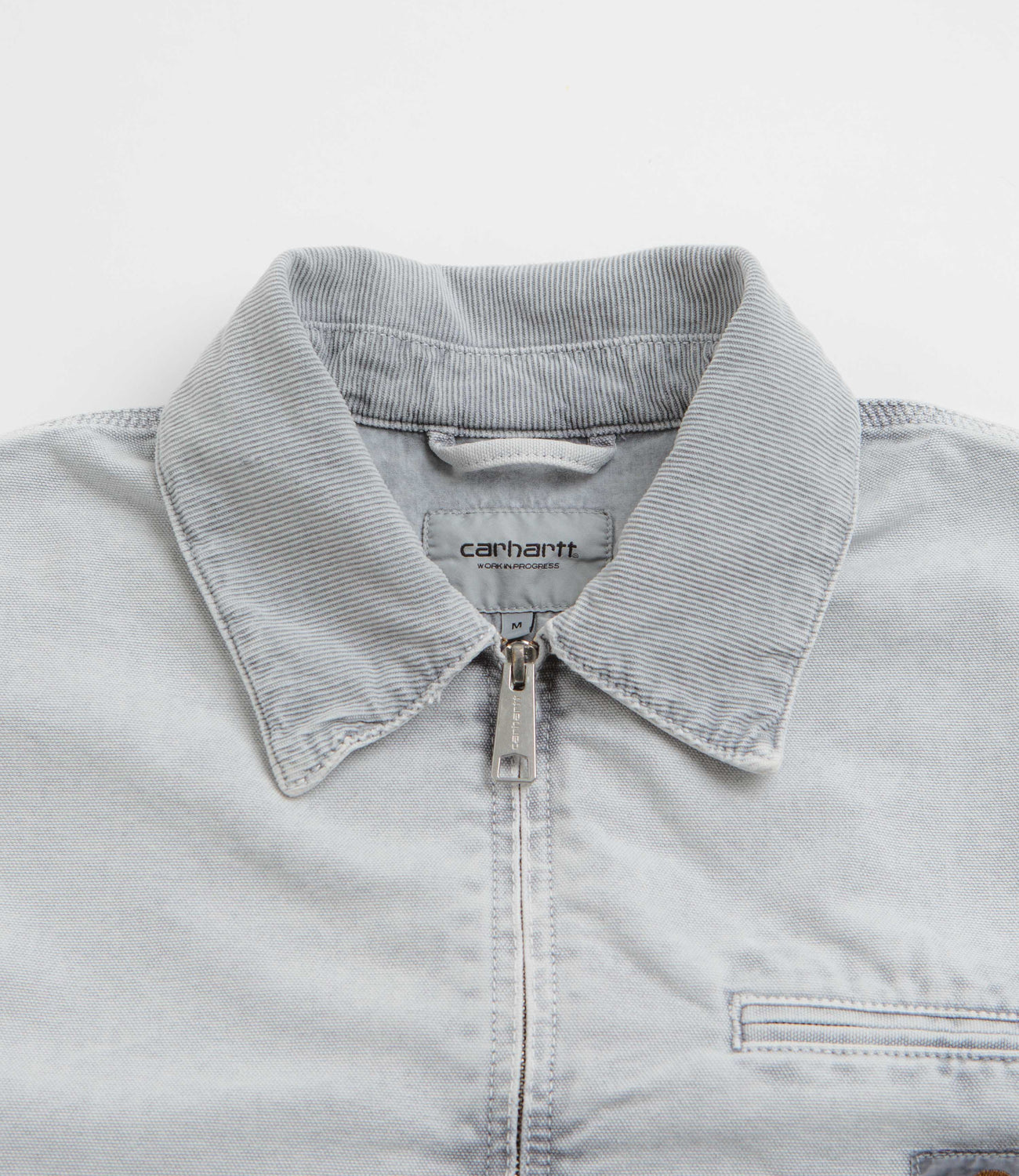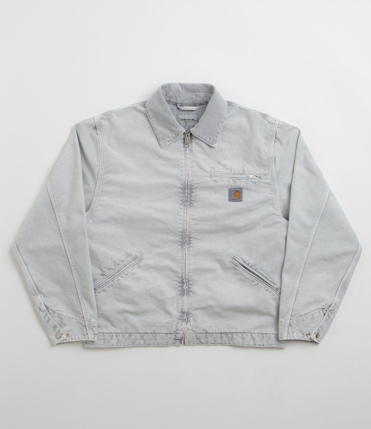 Carhartt OG Detroit Jacket in Black and Black Chalk Wash. Loose fitting with a chalk wash, this Carhartt jacket is made from 100% organic cotton ‘Dearborn’ canvas with nylon-lined sleeves. Workwear inspired with a corduroy stand collar, a full length zipper fastening and a single zippered chest pocket, this black Carhartt jacket is finished with two waist pockets, adjustable cuffs, an adjustable hem and flag label branding.