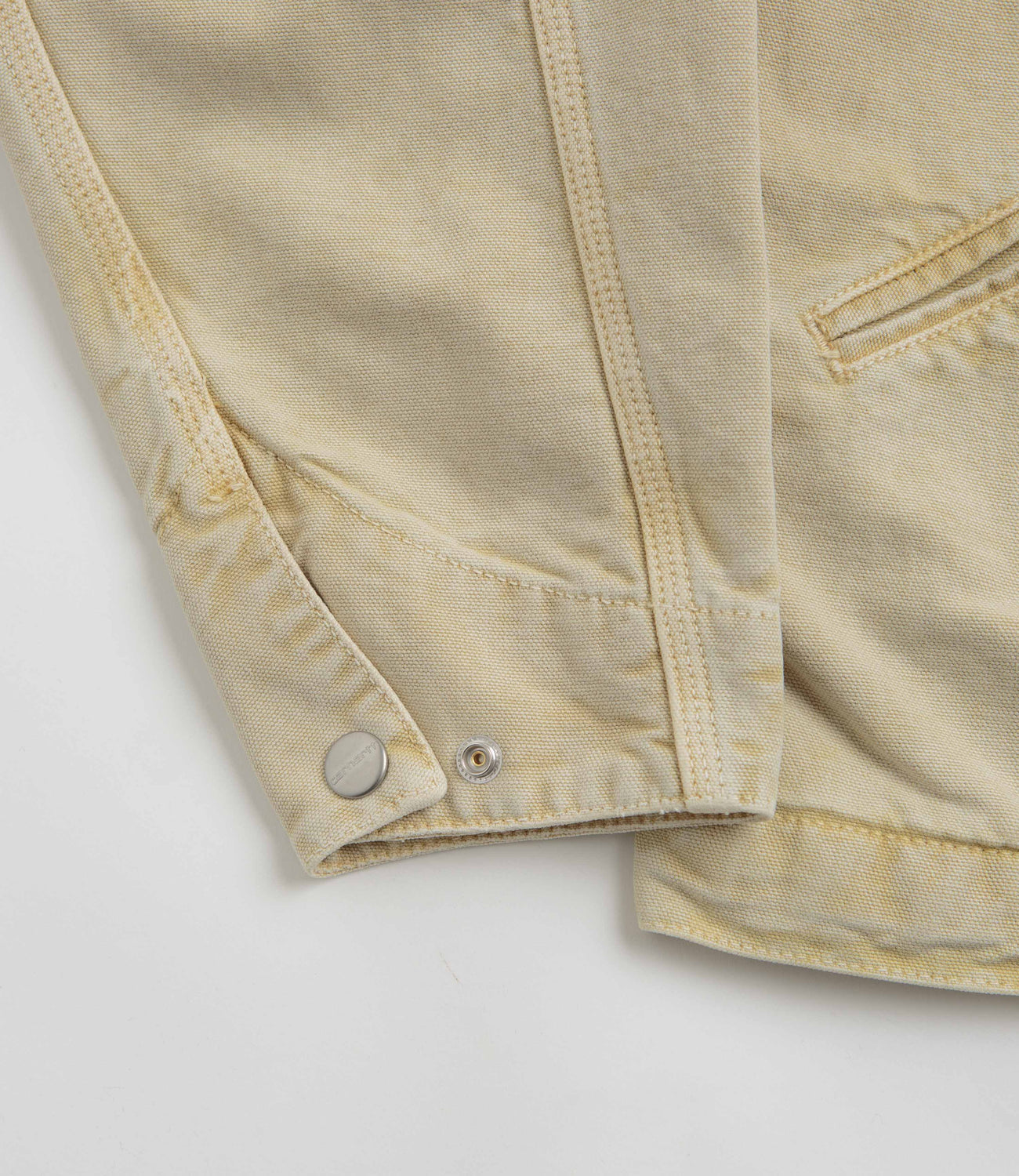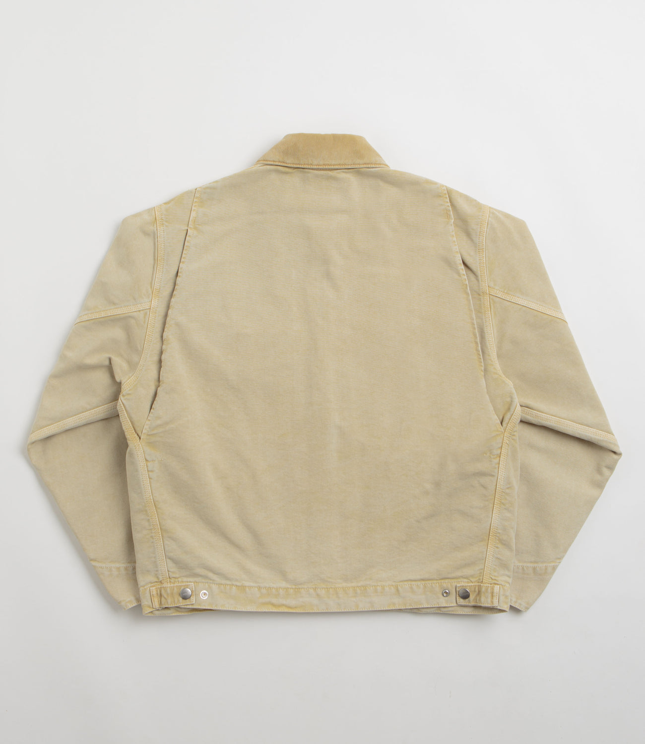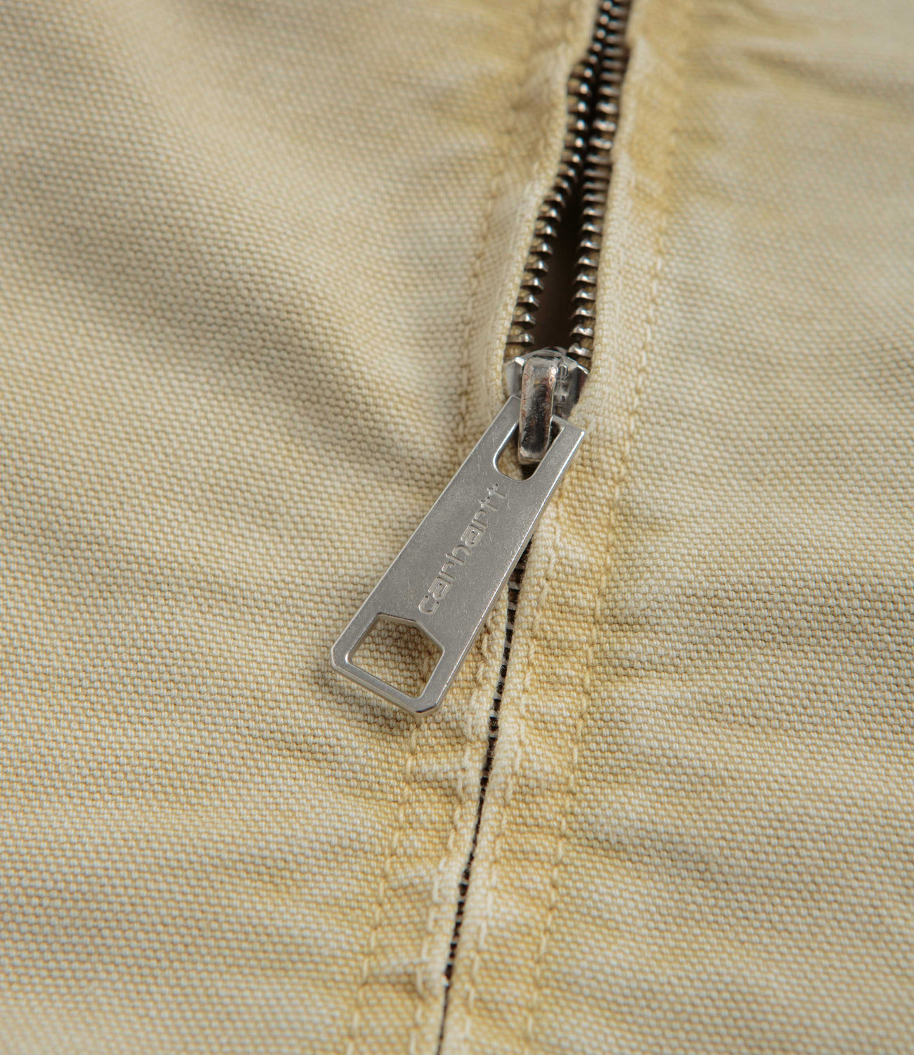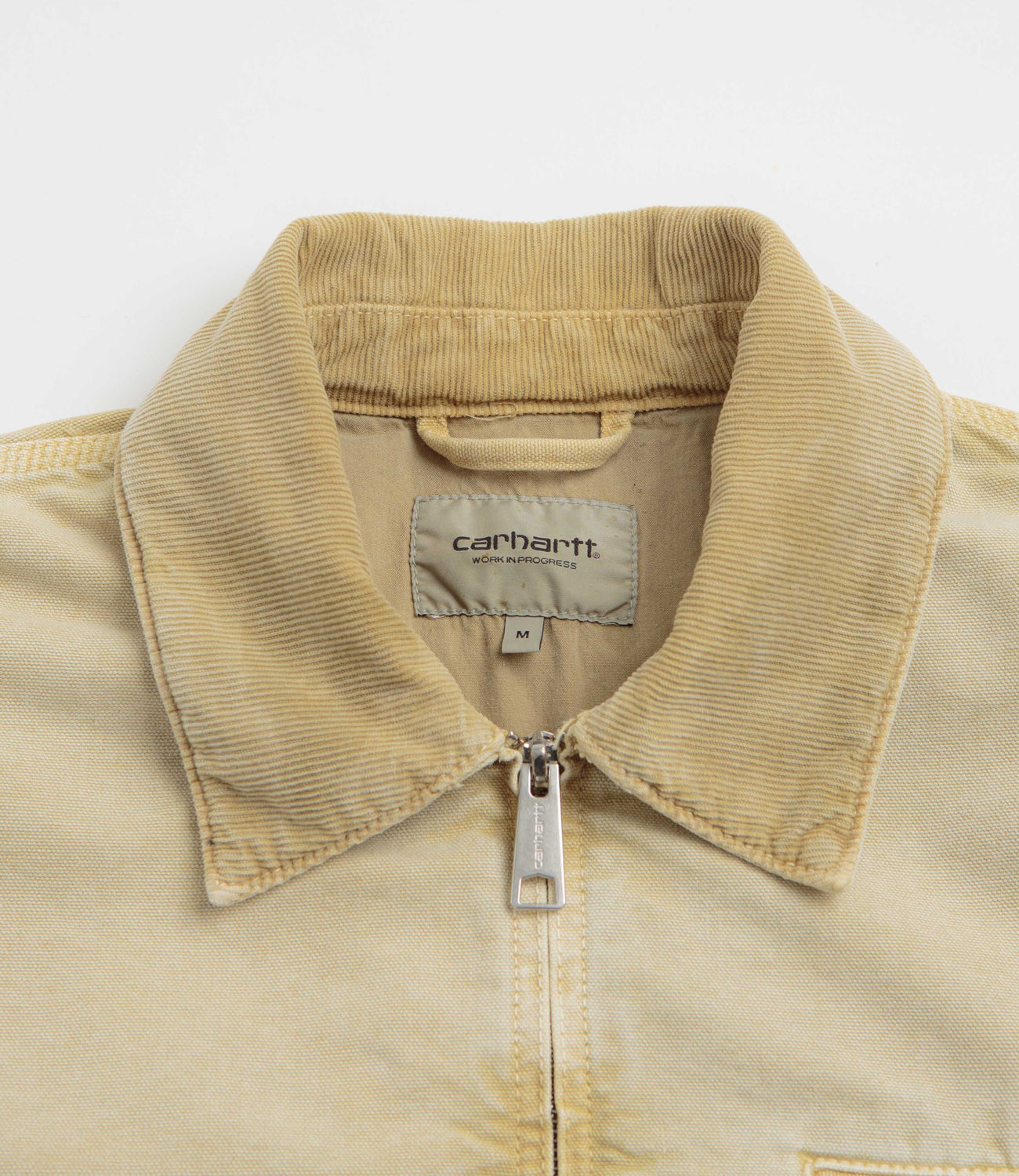 Carhartt OG Detroit Jacket in Dusty Hamilton Brown and Dusty Hamilton Brown Chalk Wash. Workwear inspired with a chalk wash and nylon-lined sleeves, this loose fitting Carhartt jacket is made from 100% organic cotton ‘Dearborn’ canvas. Featuring a corduroy stand collar, a full length zipper fastening and a single zippered chest pocket, this khaki brown Carhartt jacket is finished with two waist pockets, adjustable cuffs, an adjustable hem and flag label branding.