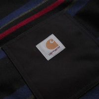 Carhartt Oregon Jacket in Starco Stripe and Black. Regular fitting and made from a polyester, acrylic and wool-flannel blend, this workwear inspired Carhartt jacket is styled with a yarn dyed fabrication. Featuring a diamond quilted lining with a corduroy collar, this blue check Carhartt jacket also features a full length button fastening, adjustable cuffs and canvas details. Finished with two waist pockets, two chest pockets and with woven flag label branding.