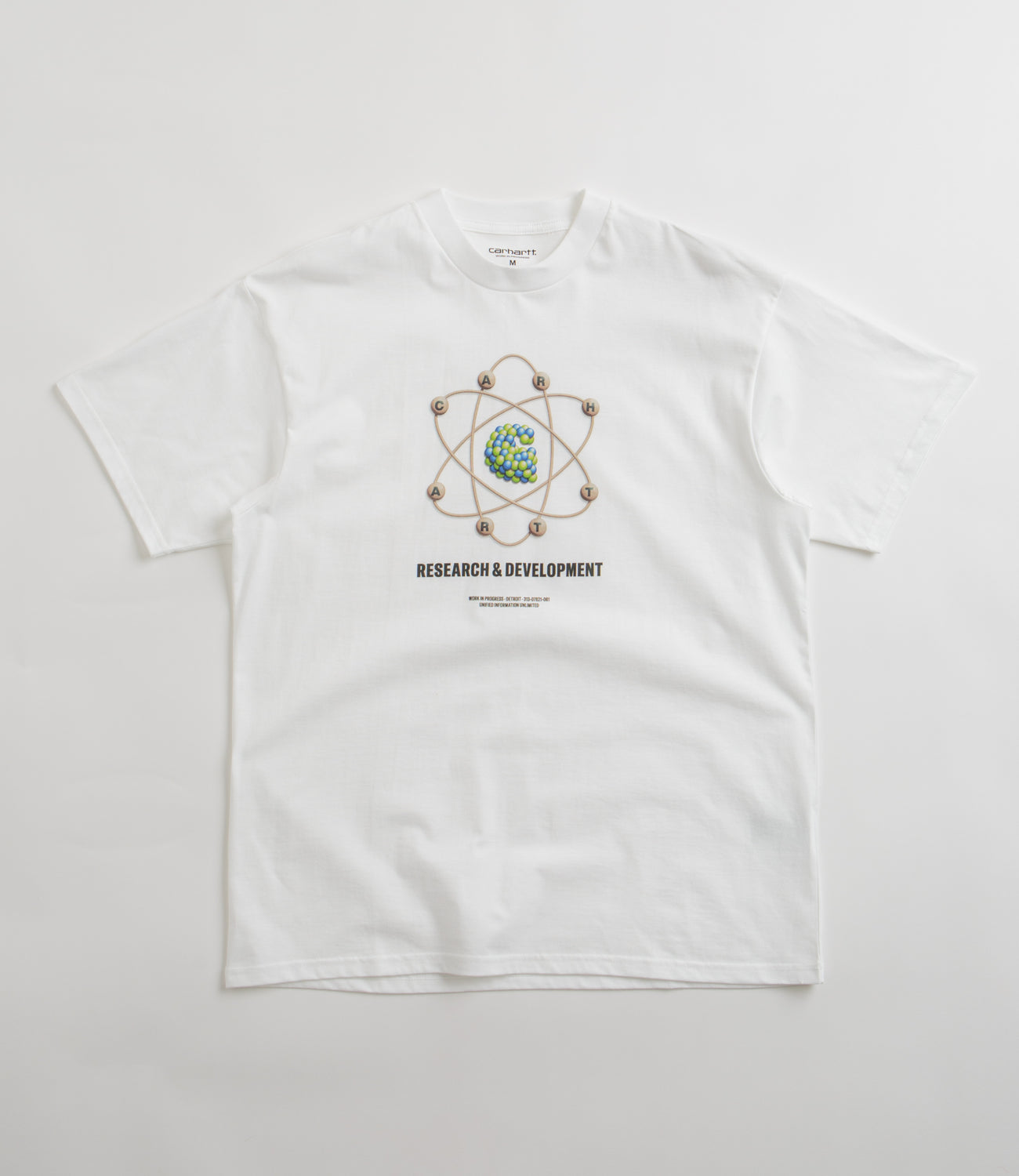 Carhartt R&D T-Shirt in White. Part of the brand’s latest release, this loose fitting Carhartt t-shirt is made from 100% organic cotton. Featuring a flexible rib knit collar and a reinforced hem, this white Carhartt t-shirt is finished with a printed centre chest graphic.