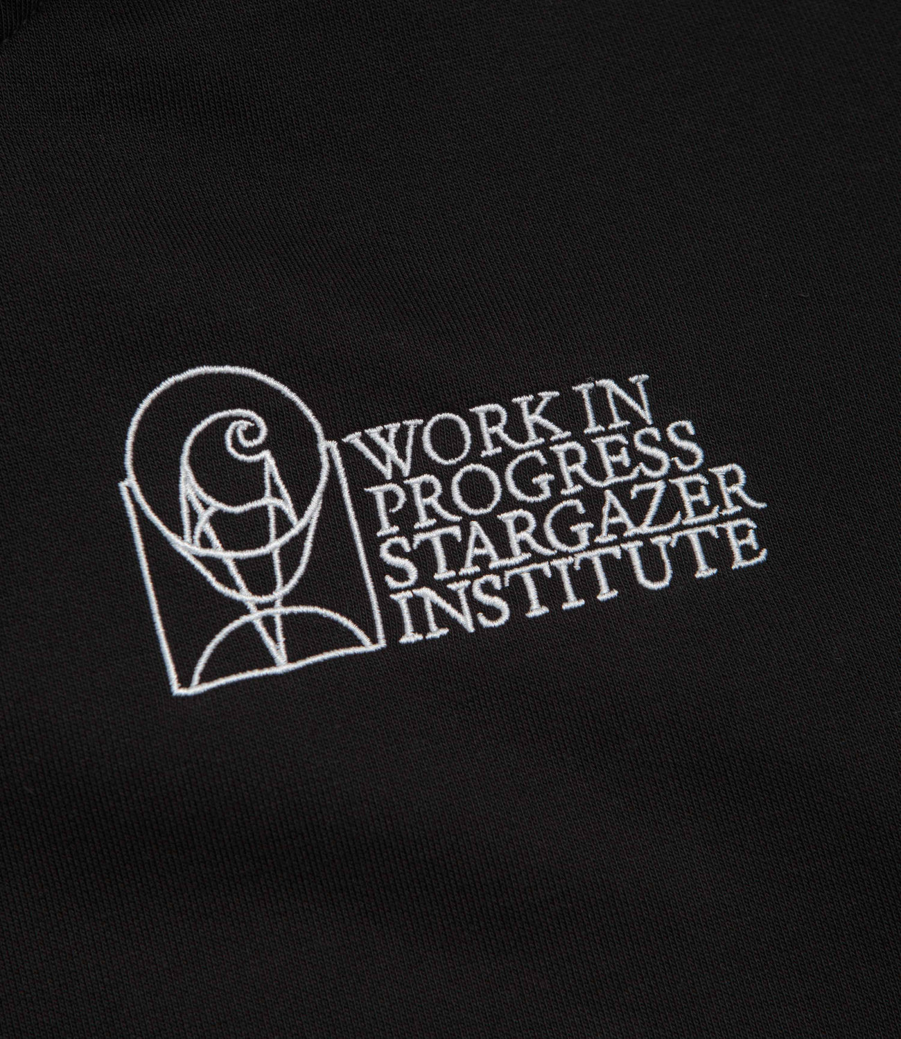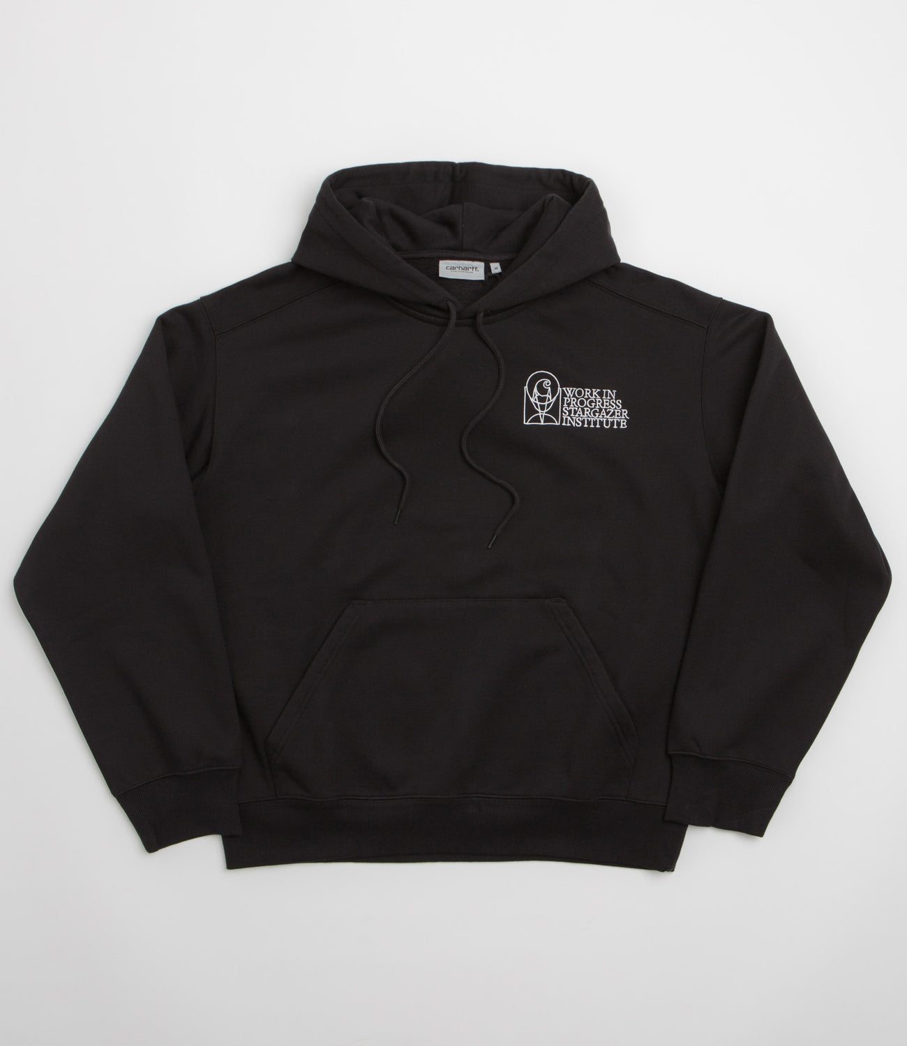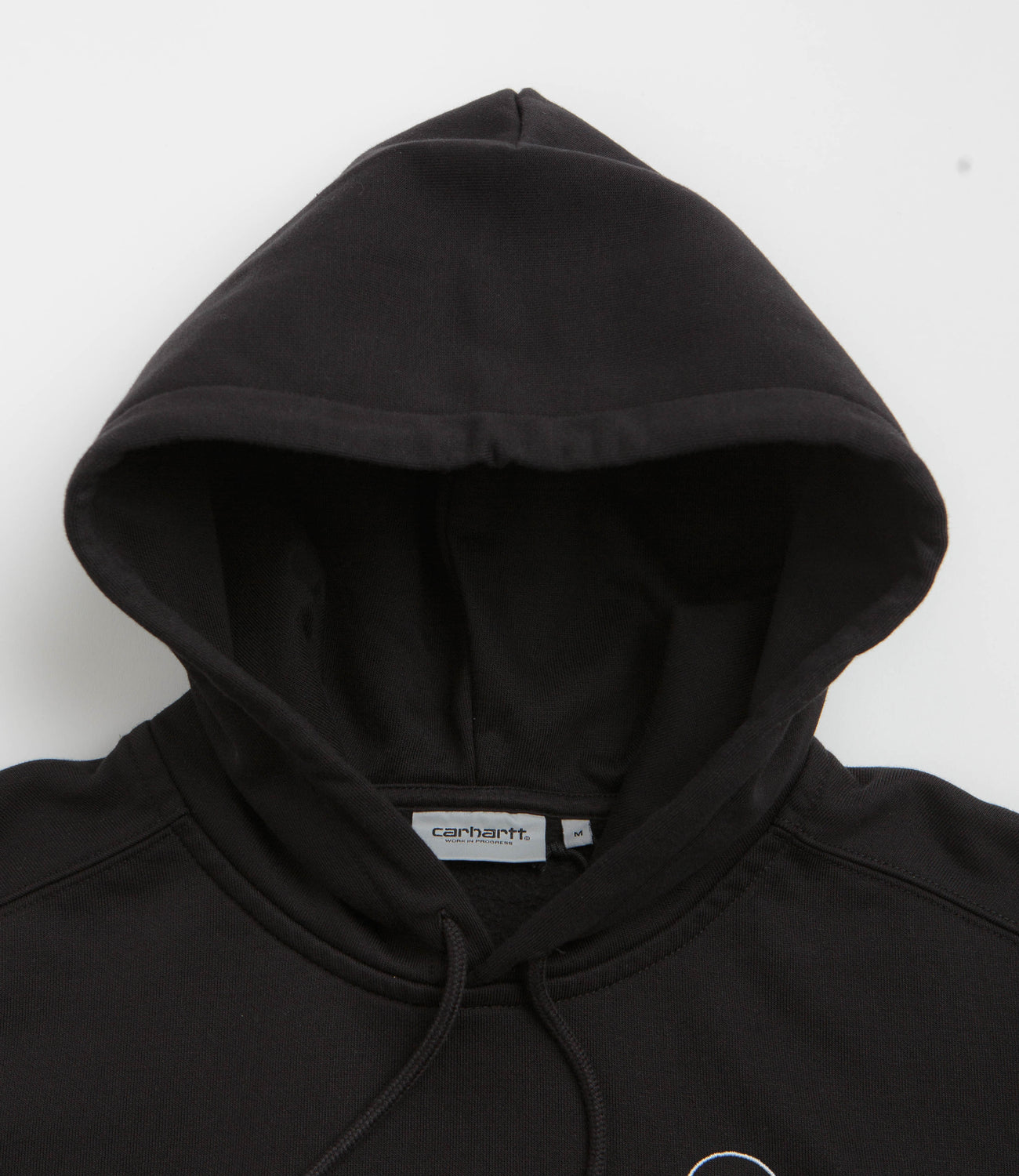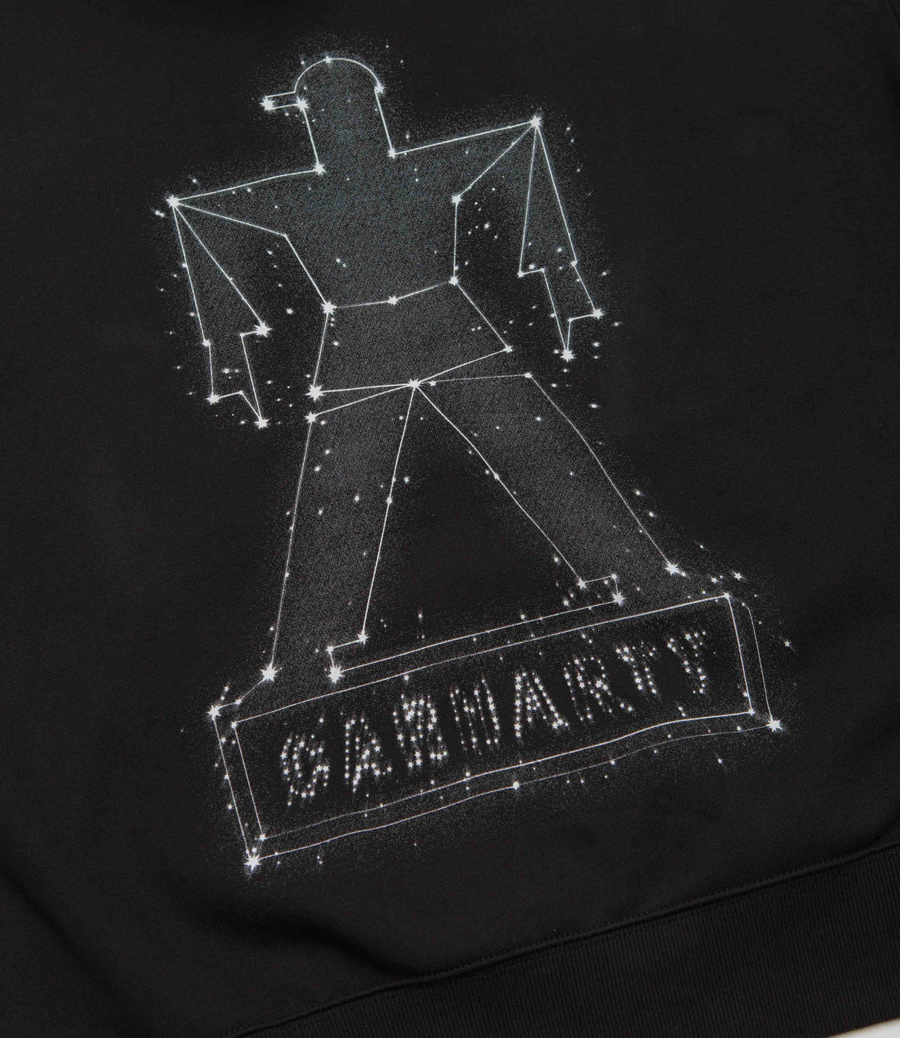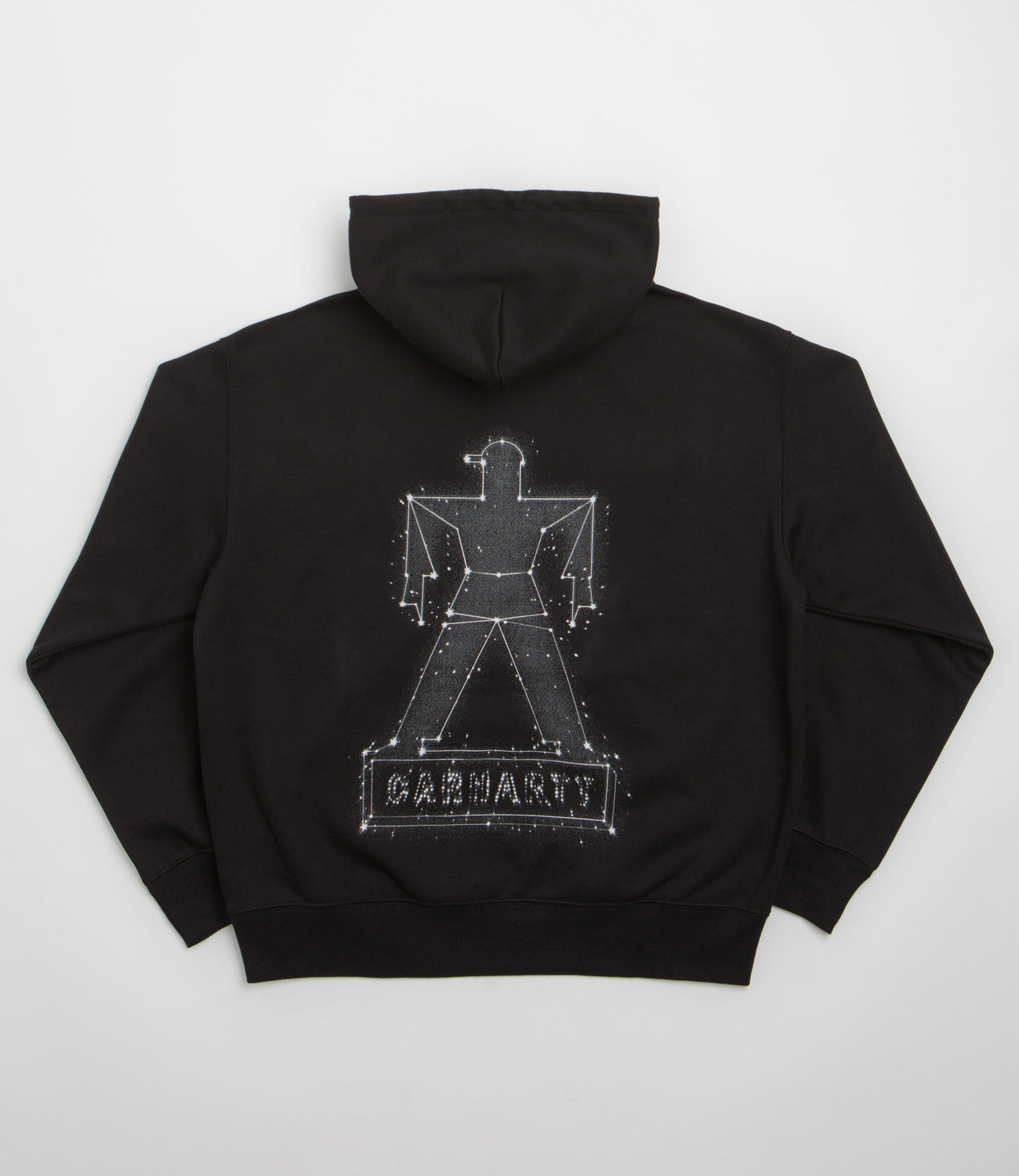 Carhartt Stargazer Hoodie in Black and White. Loose fitting with a balloon-style cut, this Carhartt hoodie is made from a cotton-polyester blend. Featuring an adjustable drawstring hood, ribbed cuffs and a kangaroo front pocket, this black Carhartt hoodie is finished with embroidered branding and a printed rear graphic.