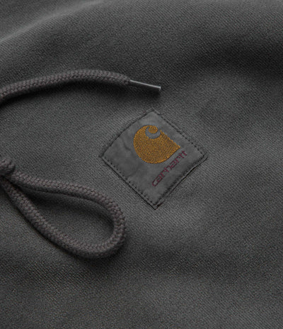 Carhartt Vista Hoodie in Graphite. Garment dyed and tailored to a balloon style fitting, this colour block Carhartt hoodie is styled with a brushed lining and a quilted hood. Featuring ribbed cuffs, dropped shoulders and a kangaroo front pocket, this grey Carhartt hoodie is finished with a kangaroo front pocket and with an overdyed woven flag label.
