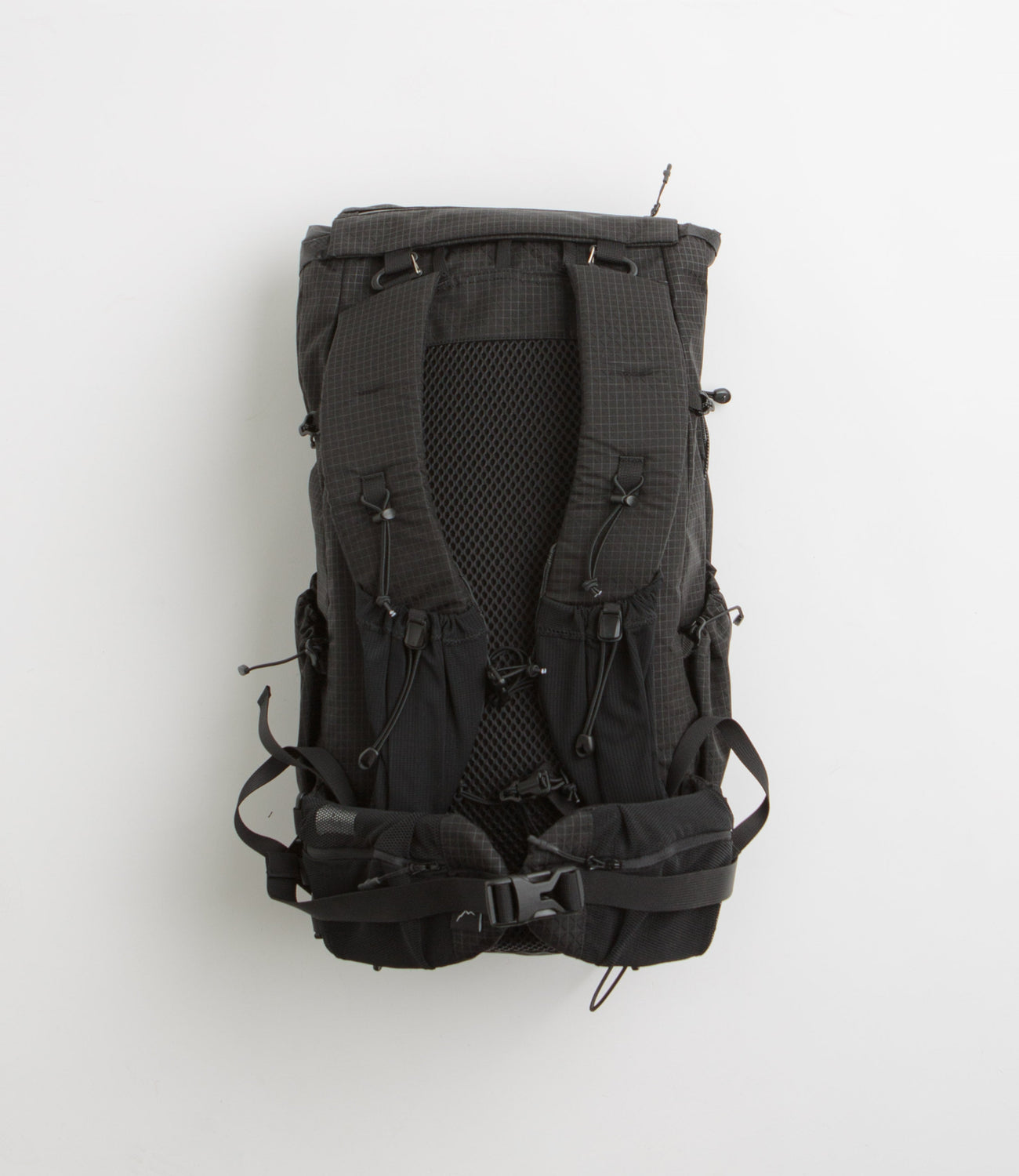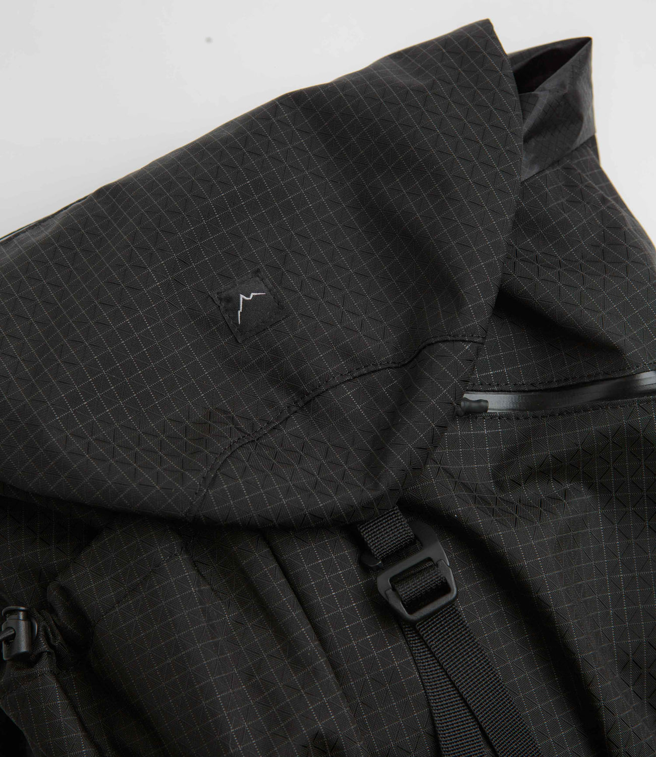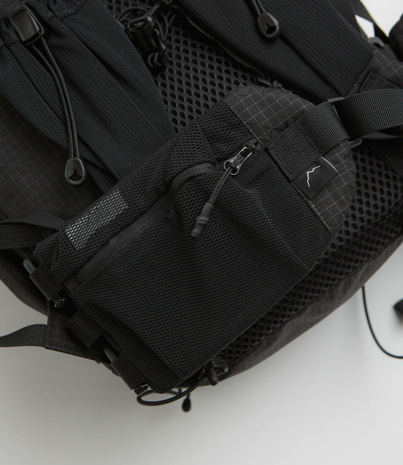 Cayl Juheul B-Grid Bag in Black. Designed with a storage capacity of up to 25-litres, this Cayl backpack is crafted from 210D nylon Robic with a B-Grid mesh construction. Featuring 3D Air Mesh details, a reversible lid, six storage pockets and a removable back foam pad, this black Cayl backpack is finished with a cushioned foam waist belt, an adjustable shoulder strap and woven flag label branding.