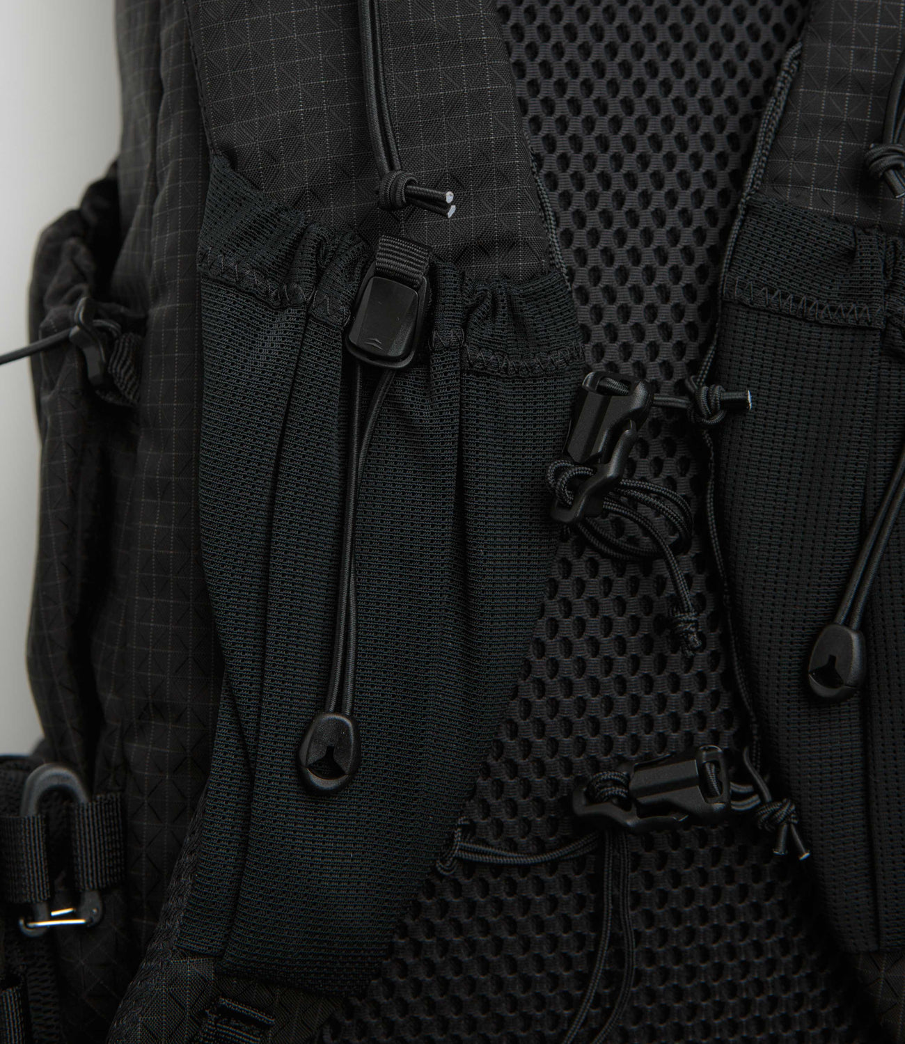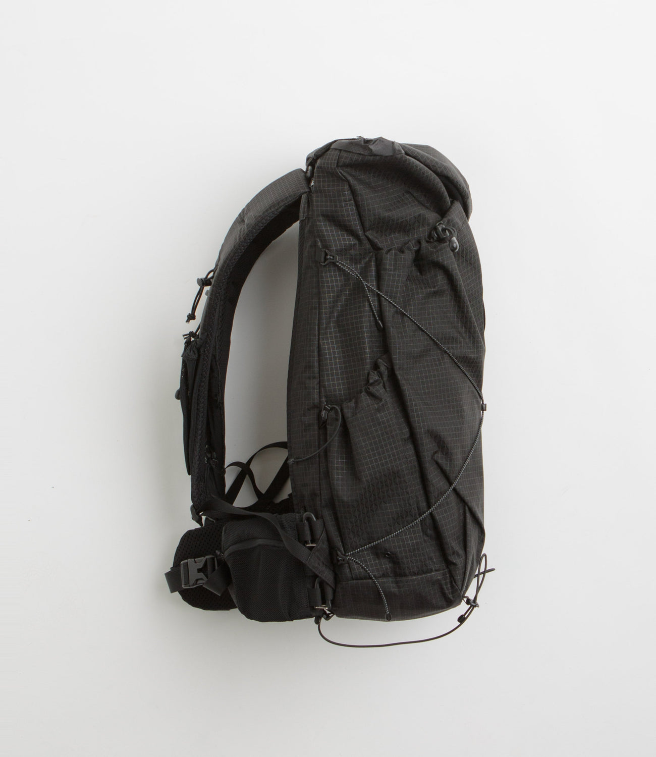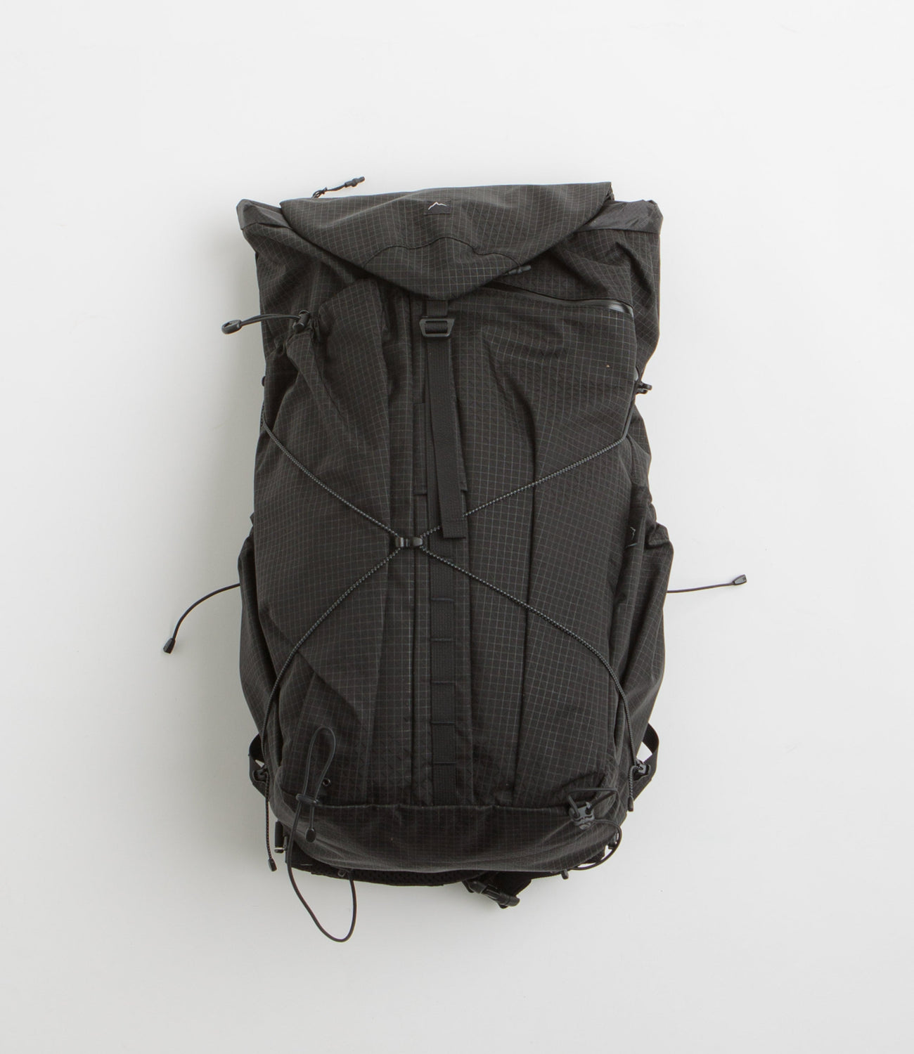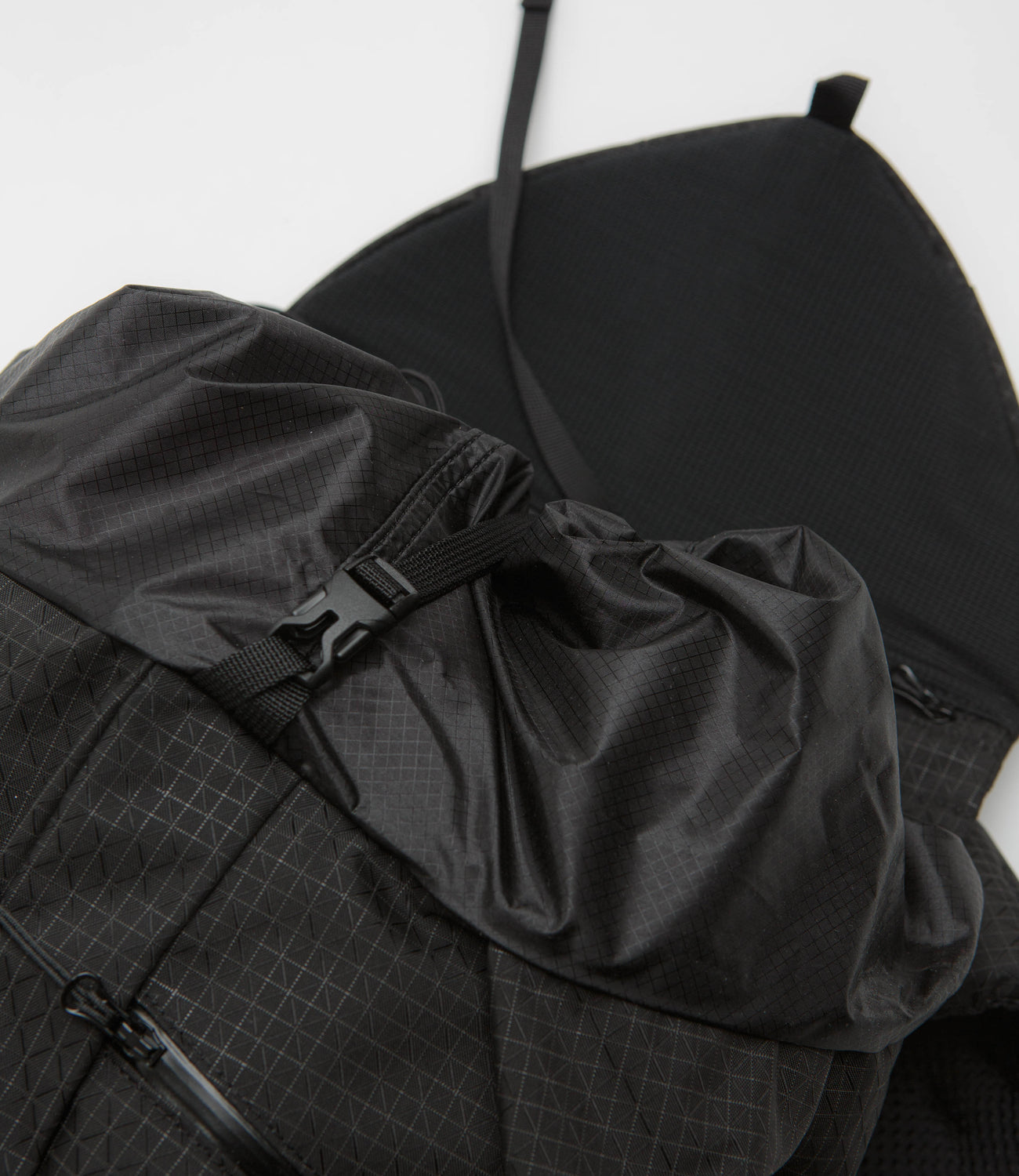 Cayl Juheul B-Grid Bag in Black. Designed with a storage capacity of up to 25-litres, this Cayl backpack is crafted from 210D nylon Robic with a B-Grid mesh construction. Featuring 3D Air Mesh details, a reversible lid, six storage pockets and a removable back foam pad, this black Cayl backpack is finished with a cushioned foam waist belt, an adjustable shoulder strap and woven flag label branding.