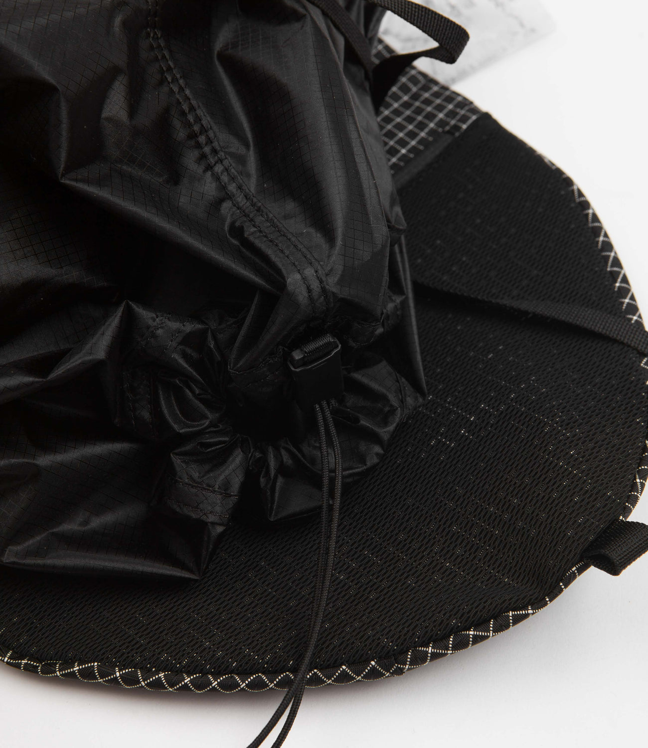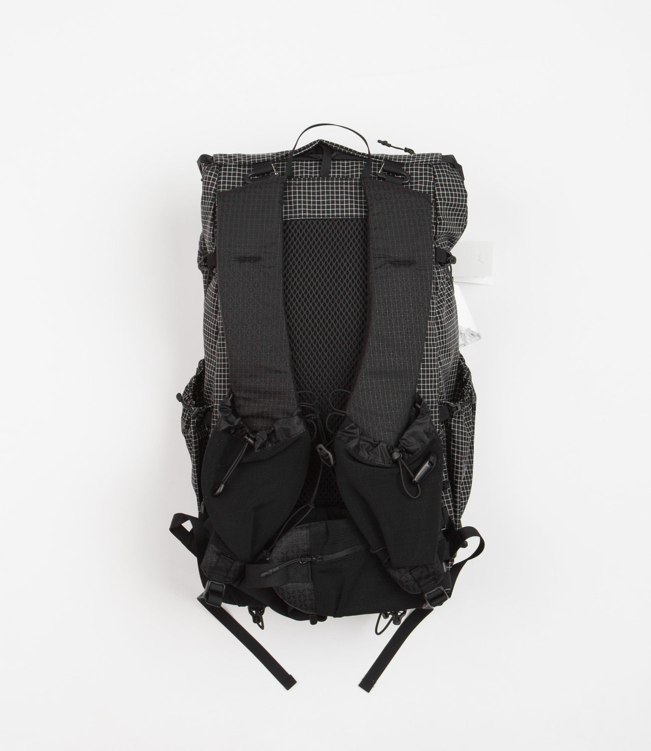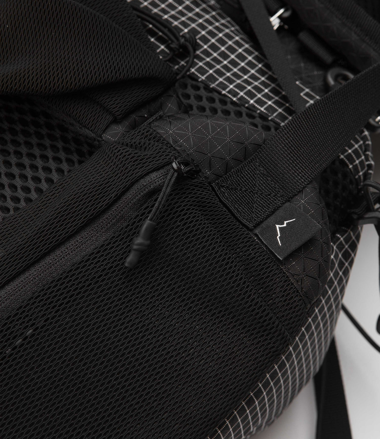Cayl Juheul Grid Bag in Black. Crafted from nylon Robic 210D fabric with 3D air mesh panels, this versatile Cayl backpack is designed with a storage capacity of up to 25 litres. Featuring a reversible and detachable lid, a removable back foam panel and a secure main storage compartment, this black Cayl grid bag also features an inner zipper pocket, 5 additional pockets and a cushioned waist belt with further built-in storage. Finished with ergonomic shoulder straps, integrated bottle holders, quick access bungee webbing and with woven flag label branding.