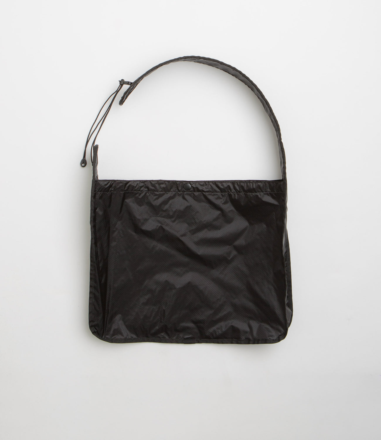 Cayl Light Packable Cross Bag in Black. Single sized and designed with an adjustable carry strap, this Cayl bag is crafted from 100% nylon Cordura ripstop. Packable with a snap-secured fastening and an inner zipped pocket, this black Cayl bag is finished with woven flag label branding.
