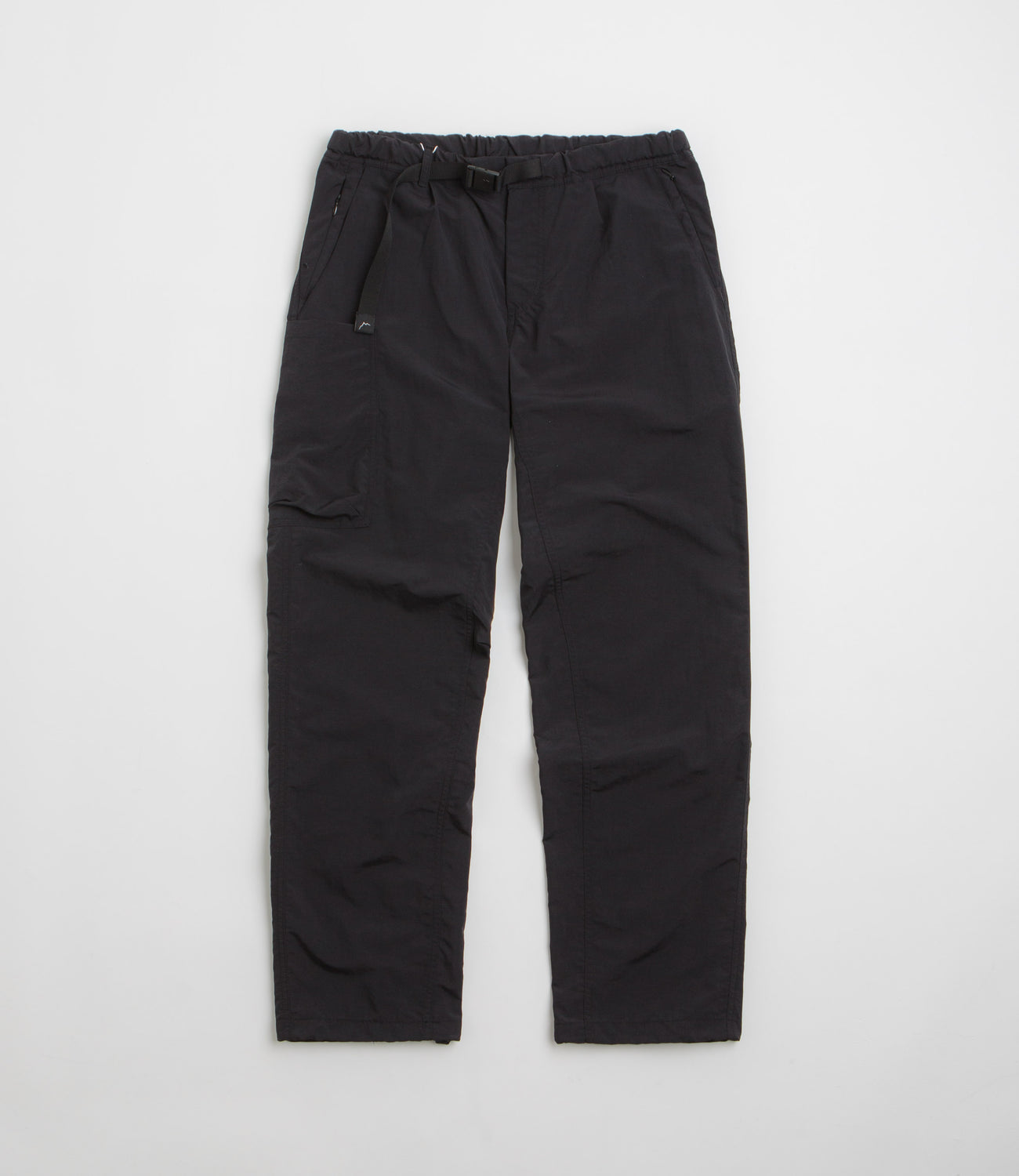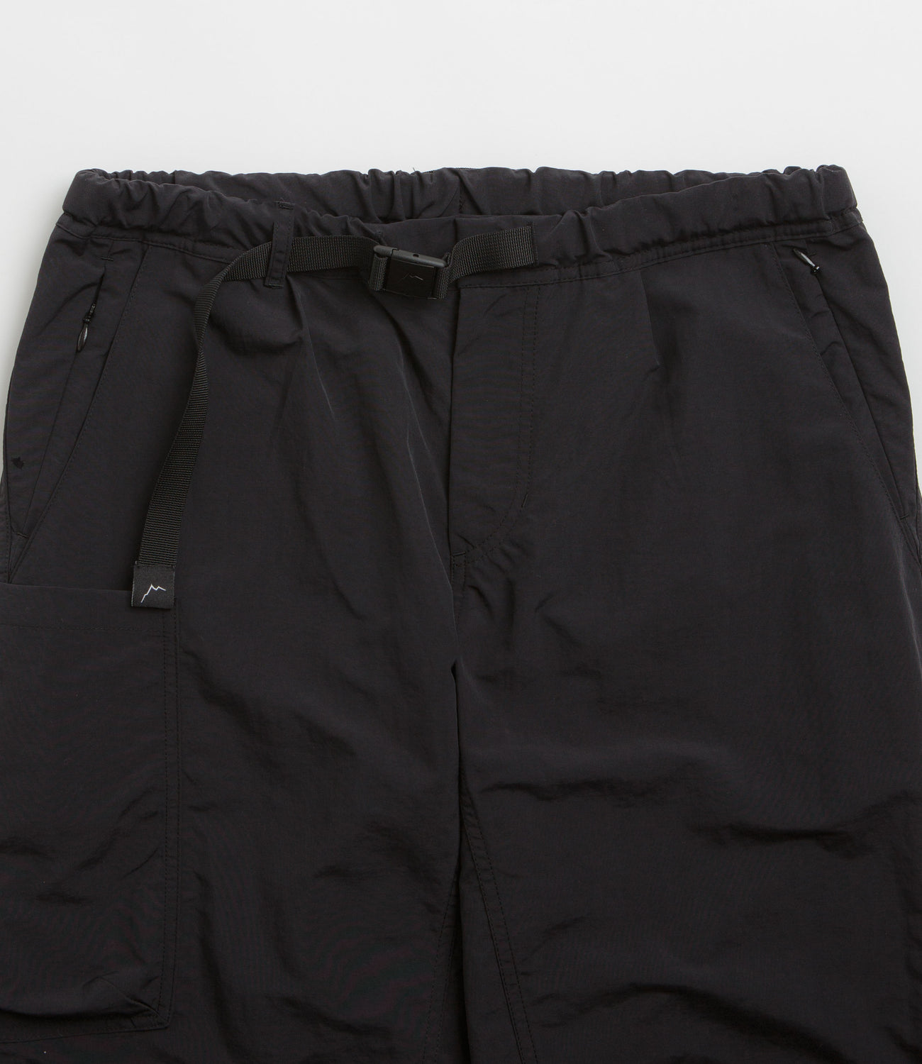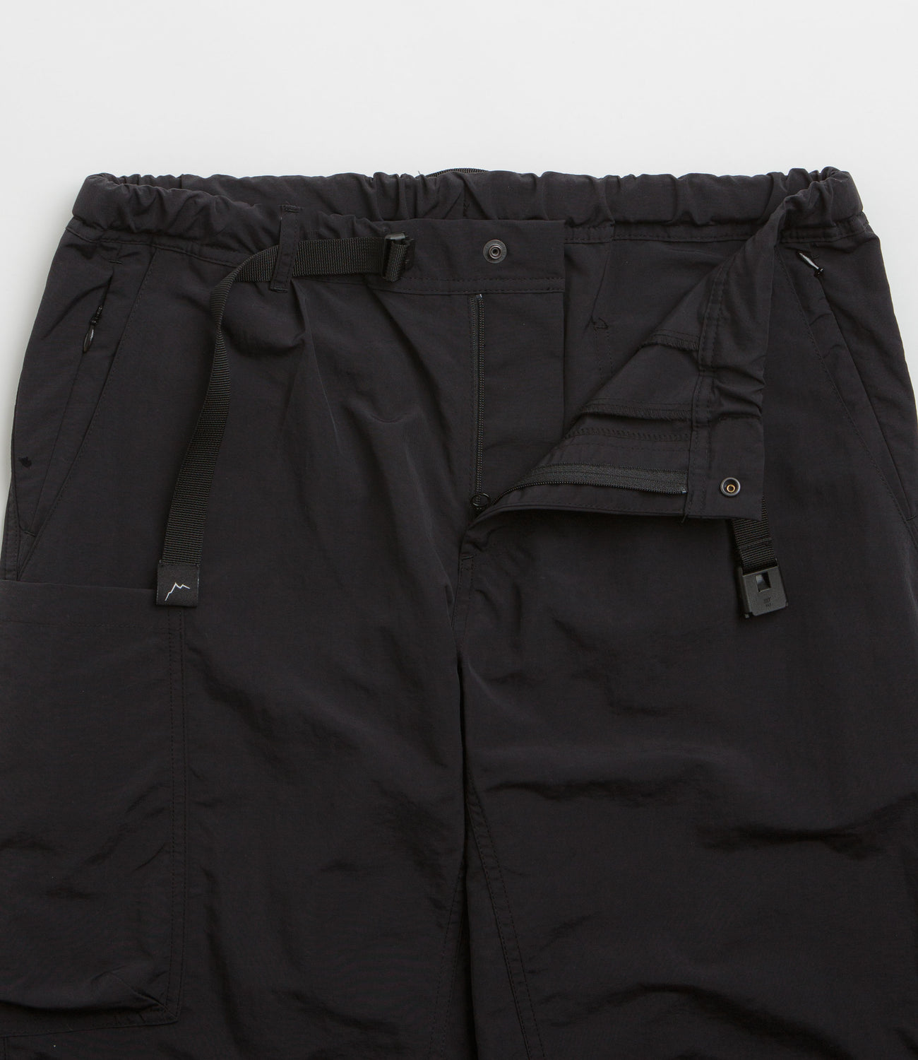 Cayl Multi Pocket Wide Pants in Black. Wide fitting with toggle-cord adjustable cuffs, these Cayl pants are crafted from 100% nylon Supplex. Featuring a DWR coated exterior, an elasticated waistband and an integrated webbing belt, these black Cayl pants are finished with two side pockets, two rear pockets, additional utility pockets, a gusseted crotch and flag label branding.