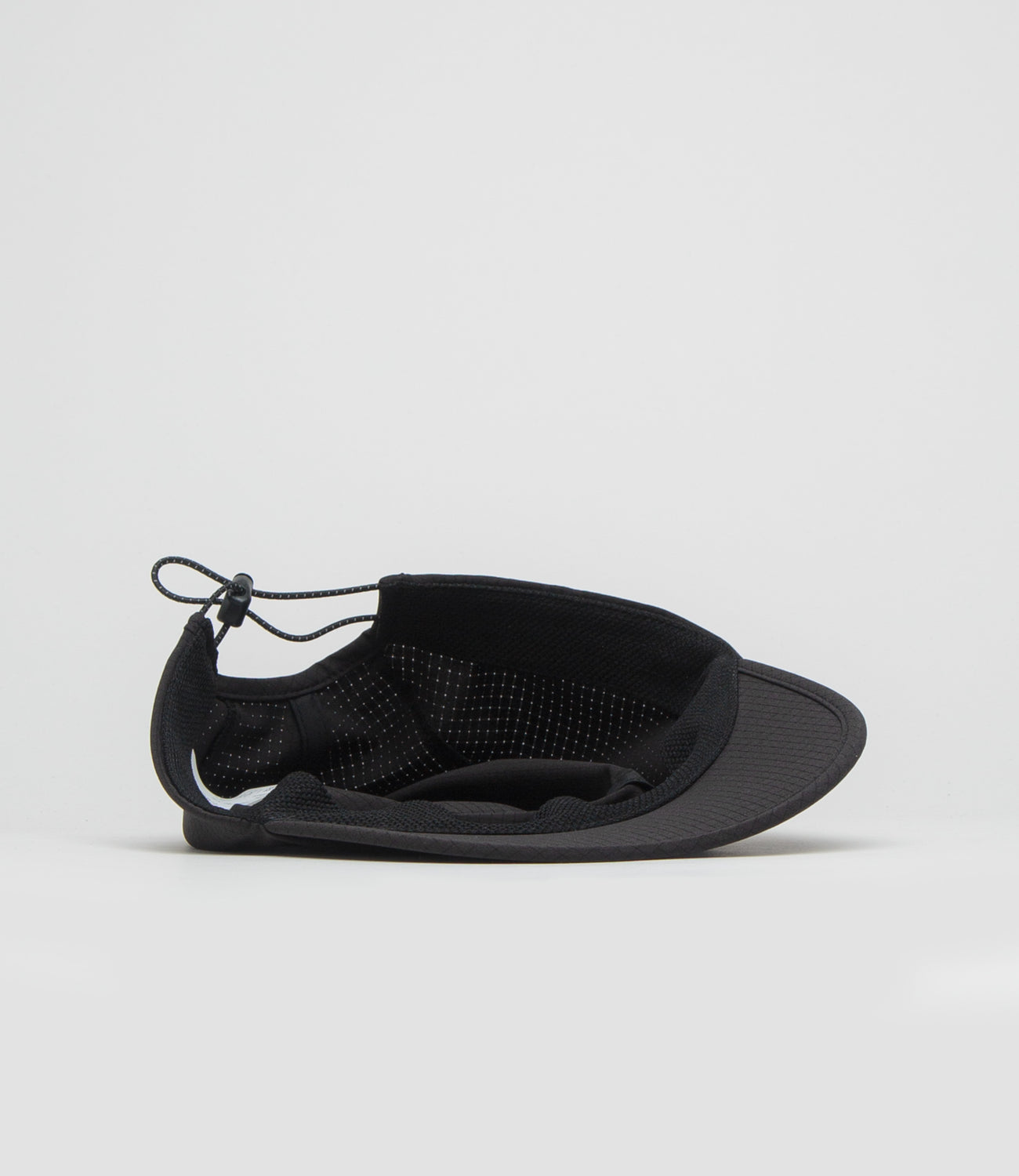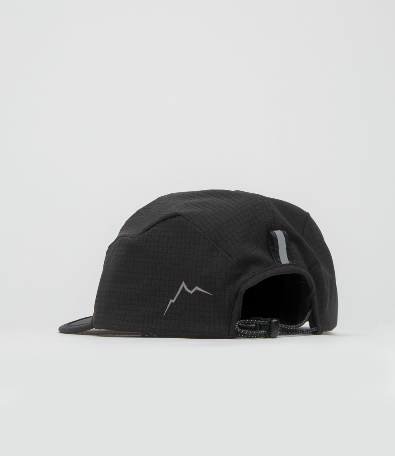 Cayl SB Flow Cap in Black. Single sized and crafted from a polyester-polyurethane blend, this five panel Cayl cap is designed with a water-repellent exterior. Finished in black with a Coolmax headband, a slightly curved short peak, an adjustable toggle-cord rear fastening and a retroreflective printed logo.