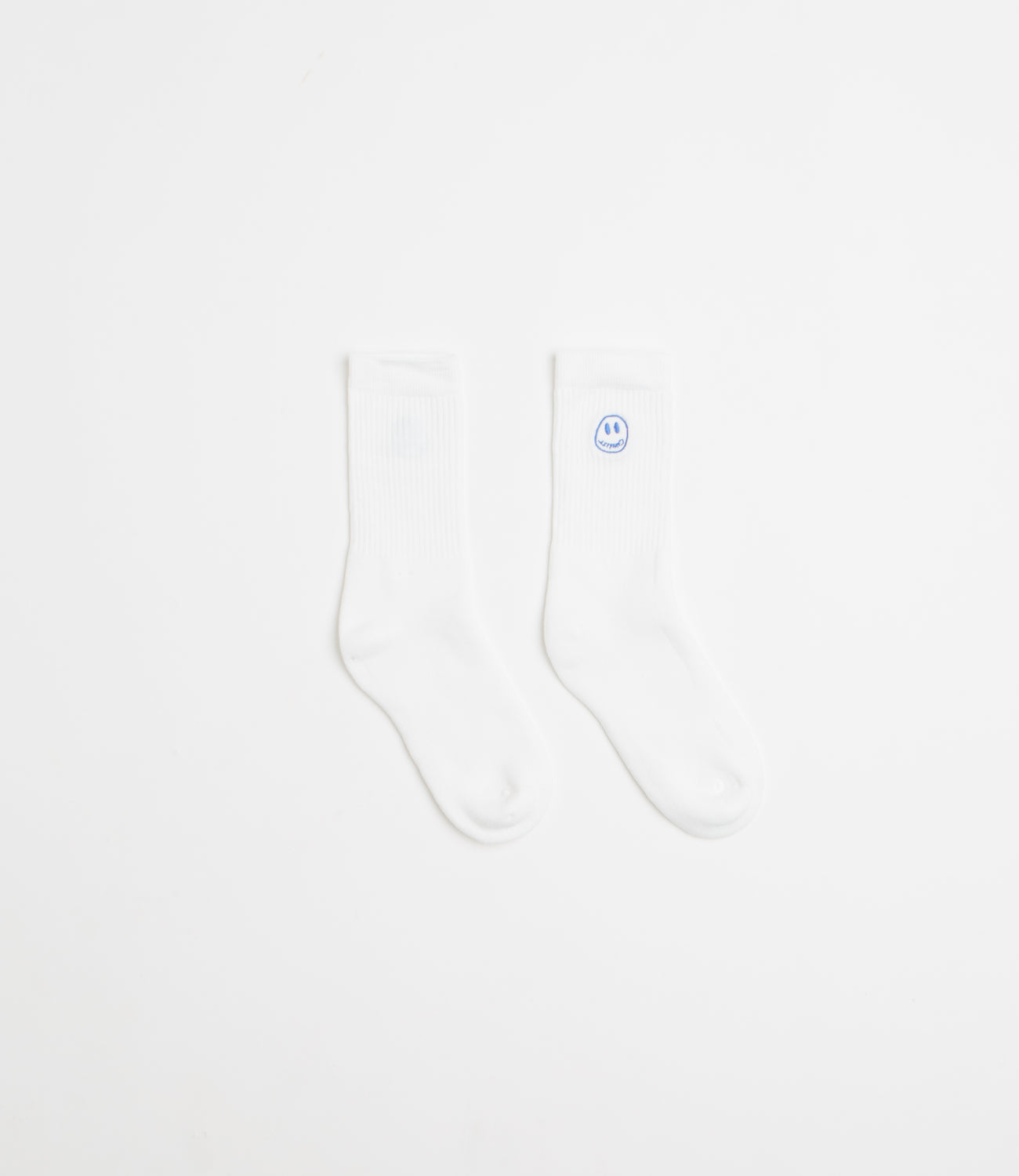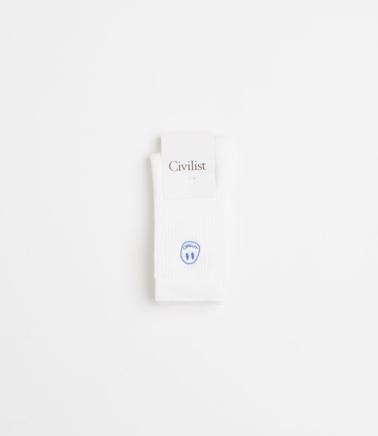 Civilist Mono Smiler Socks in White and Royal. Made from a cotton-polyamide blend, these Civilist socks are cut to crew length. Finished in white with rib knit cuffs and embroidered branding.