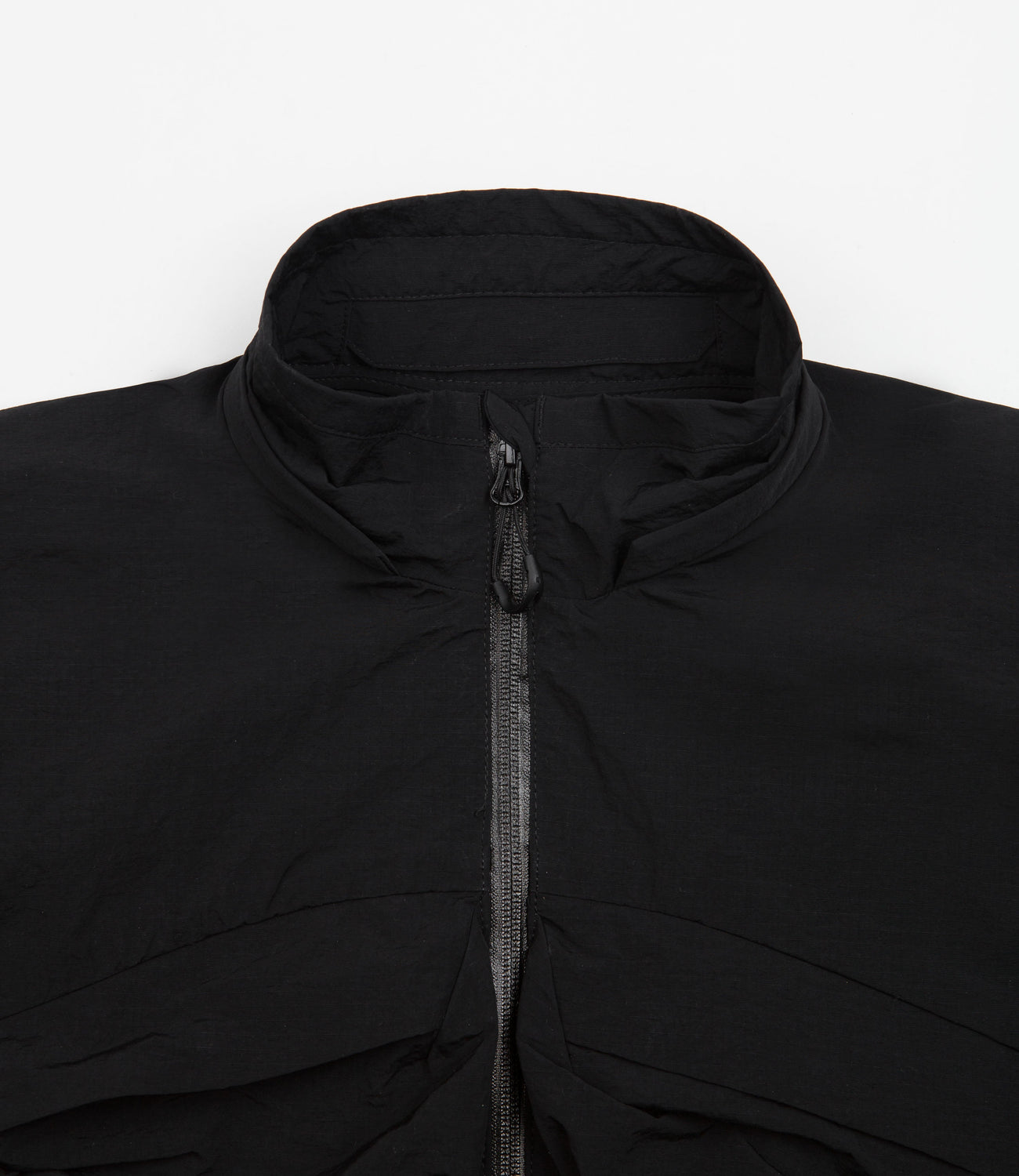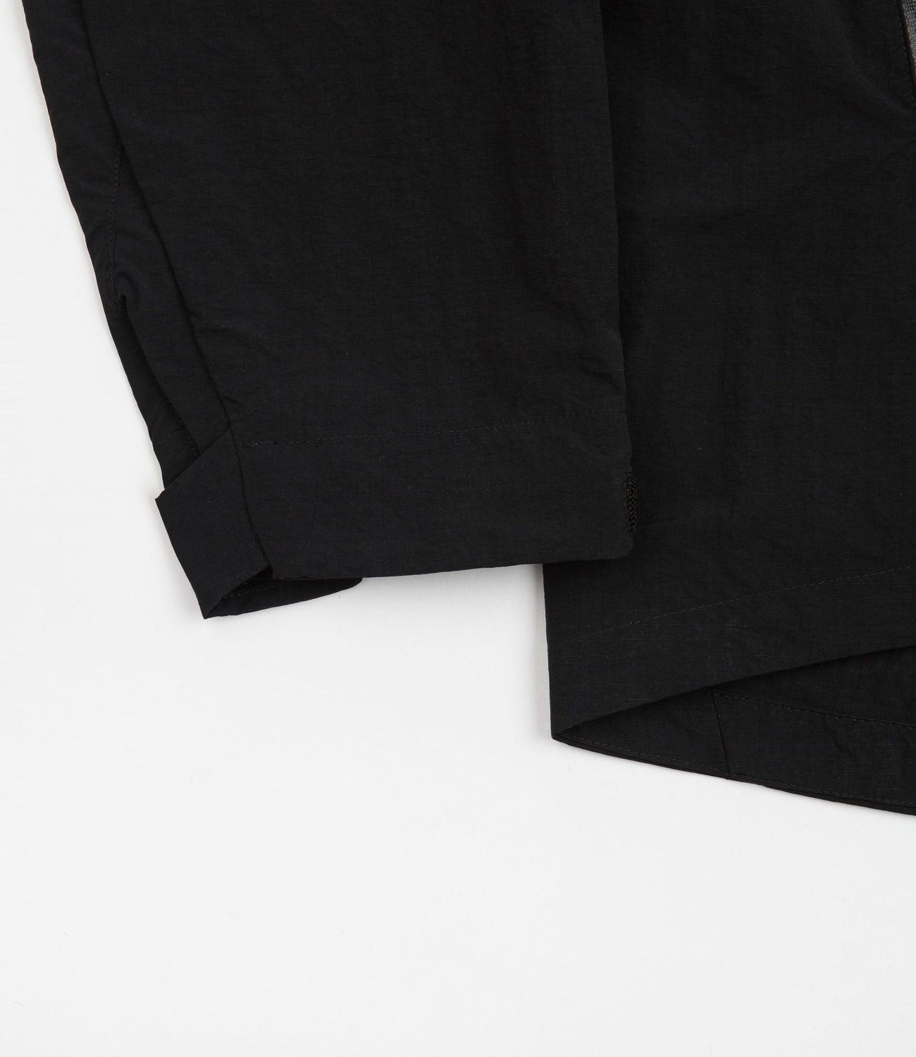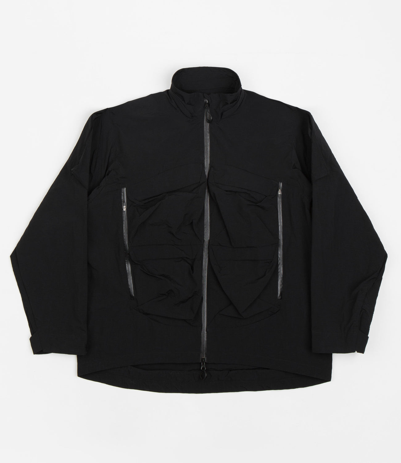 CMF Outdoor Garment Sling Shot Jacket in Black. Tailored to a loose fitting from 100% nylon ripstop, this CMF Outdoor Garment jacket is designed with fully taped seams and a water-repellent twinkle fabric construction. Featuring a full length two-way YKK zipper, adjustable cuffs and a high low hemline, this black CMF Outdoor Garment jacket is finished with 3D chest pockets, zippered front pockets, additional sleeve pockets and with screen printed branding.