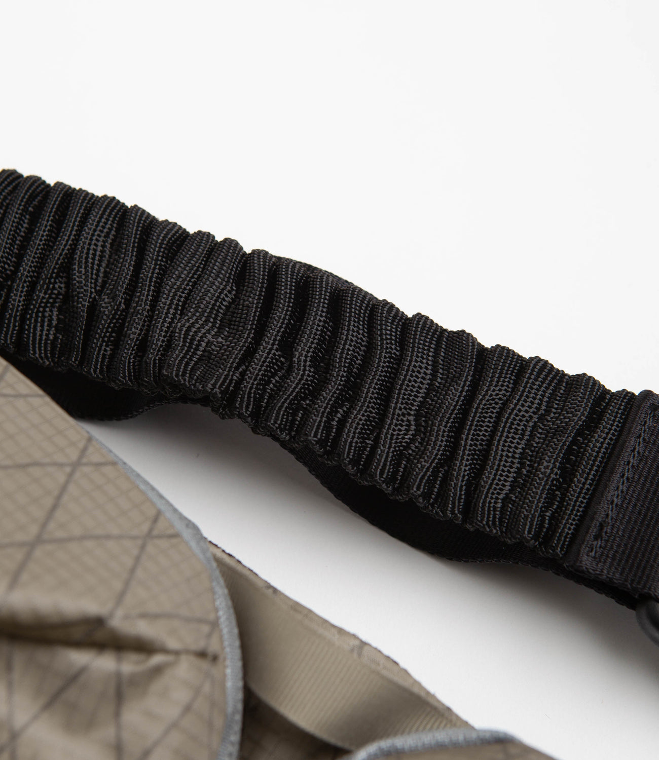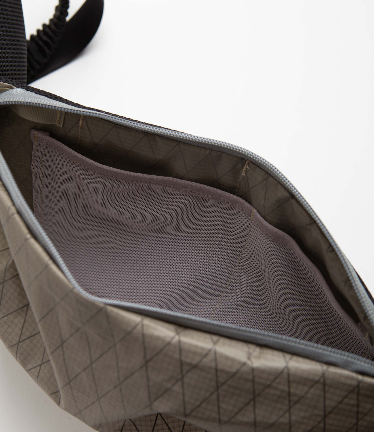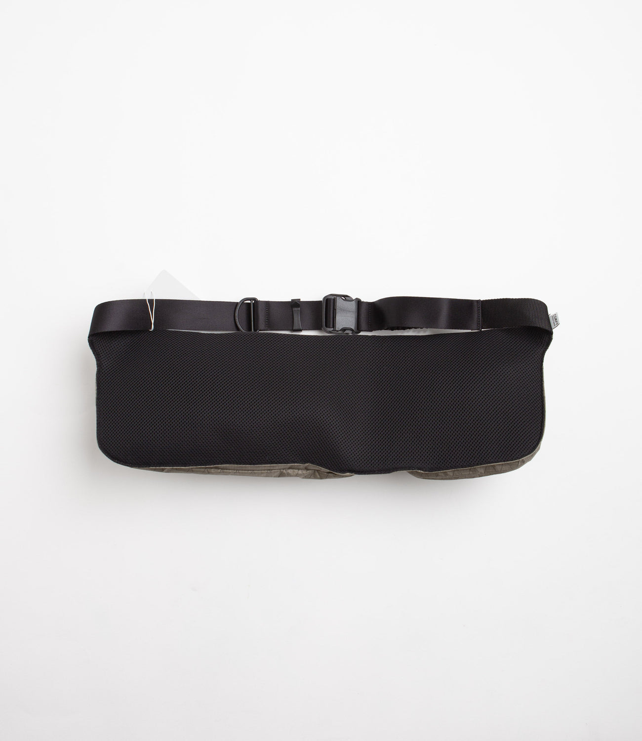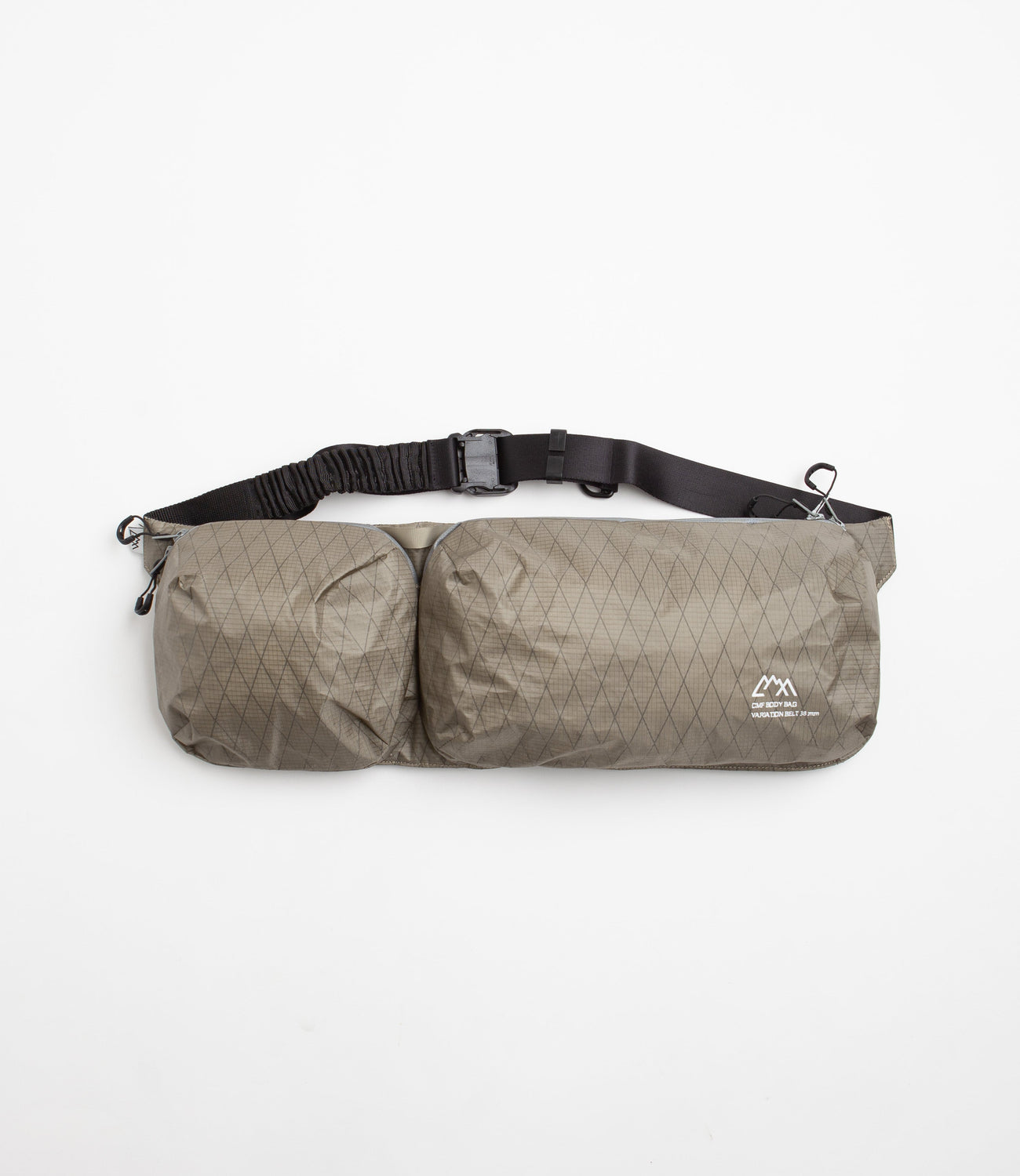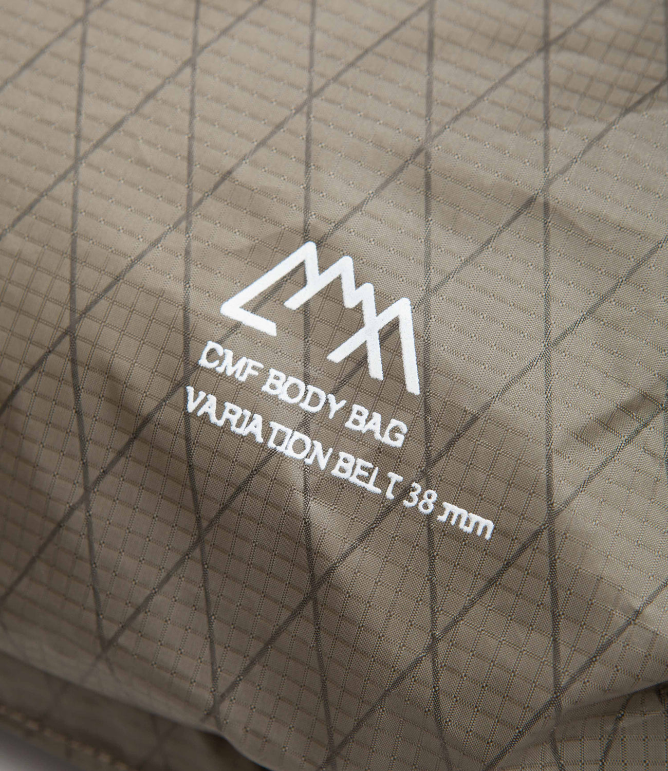 CMF Outdoor Garment XPac Body Bag in Graige. Designed to wrap-around the body, this single sized CMF Outdoor Garment body bag is crafted from 100% nylon with a triple-layer XPac construction. Featuring two zippered pockets with fully taped seams, this beige grey CMF bag is finished with screen printed branding, a woven flag label and with an adjustable bungee cord belt.