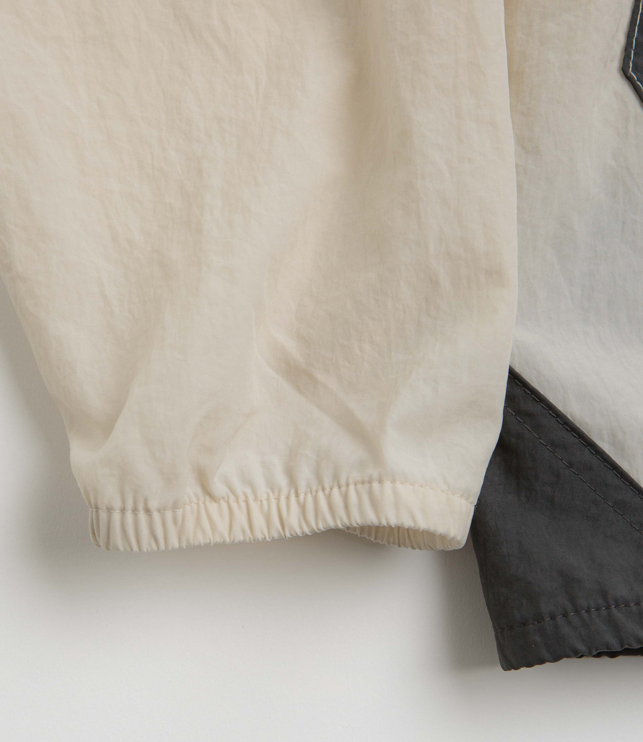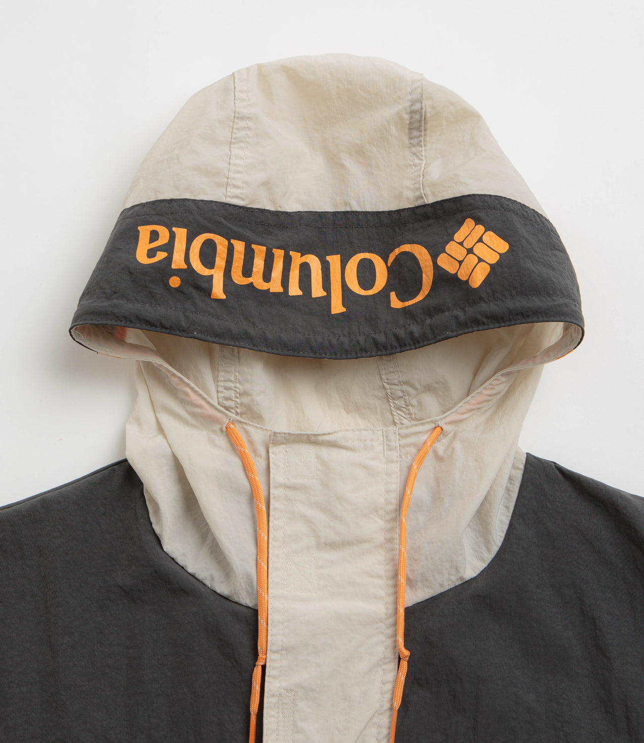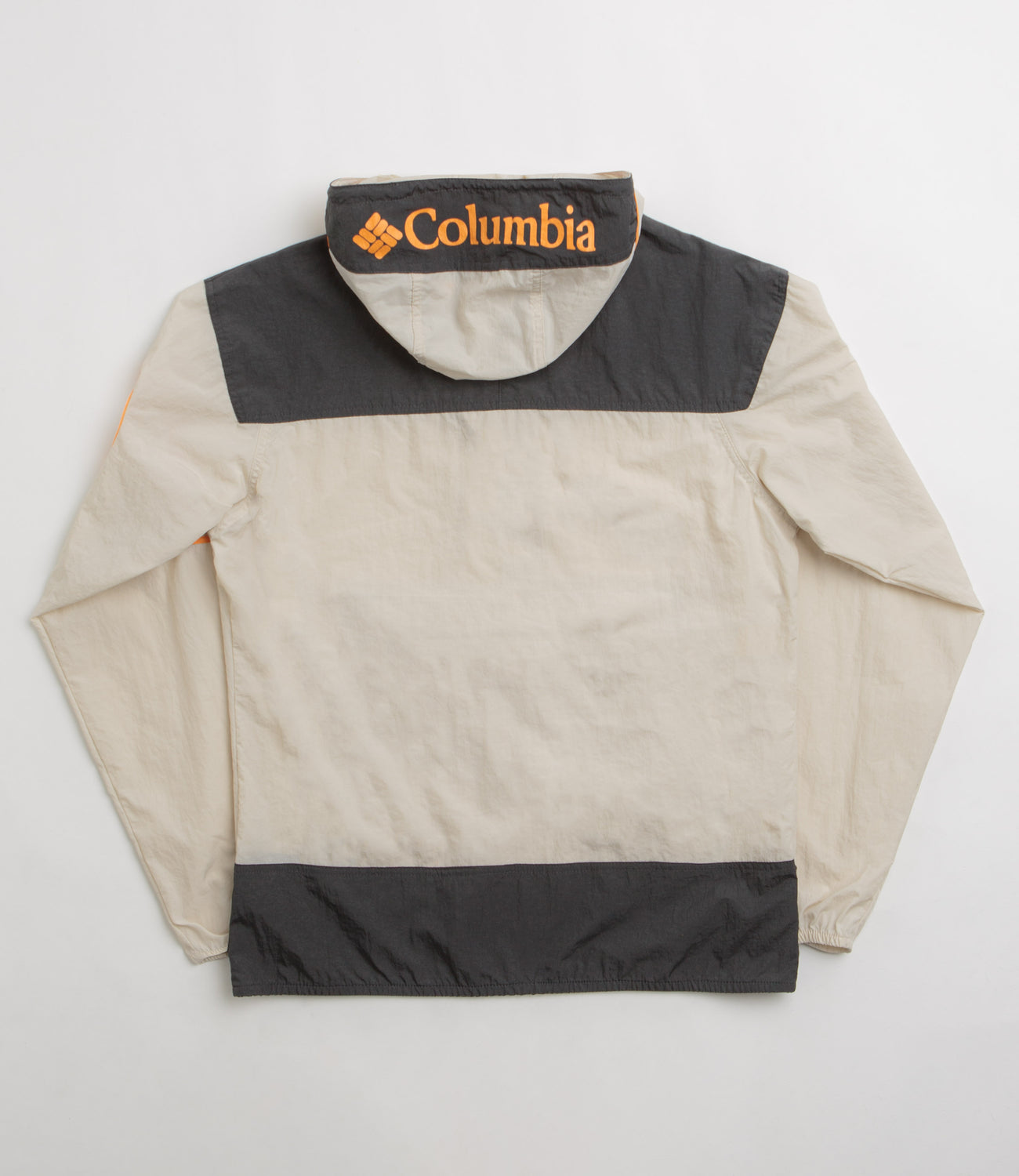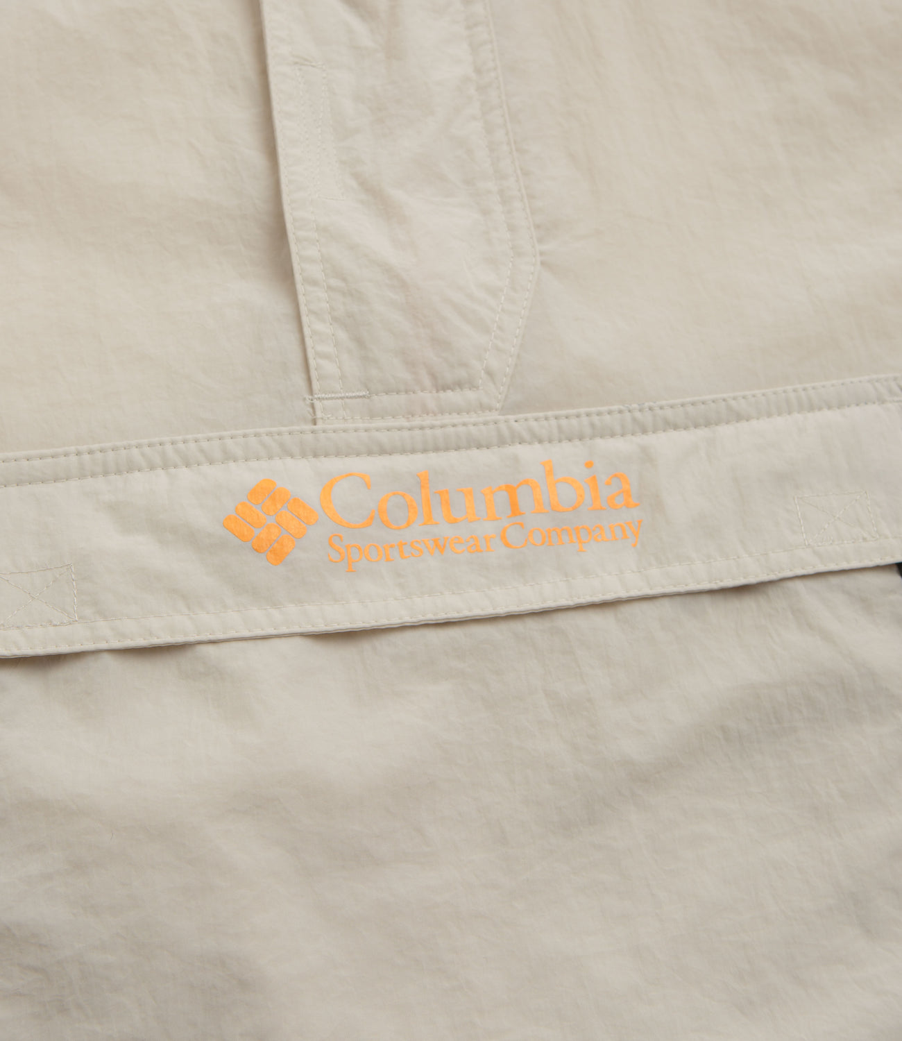 Columbia Challenger Windbreaker Anorak in Dark Stone and Shark. Made from 100% nylon with Omni-Shield™ advanced technology and a drawcord adjustable hood, this Columbia jacket is designed with a half-length zipper fastening. Finished in khaki beige with a kangaroo front pocket, elasticated cuffs and printed logo branding.