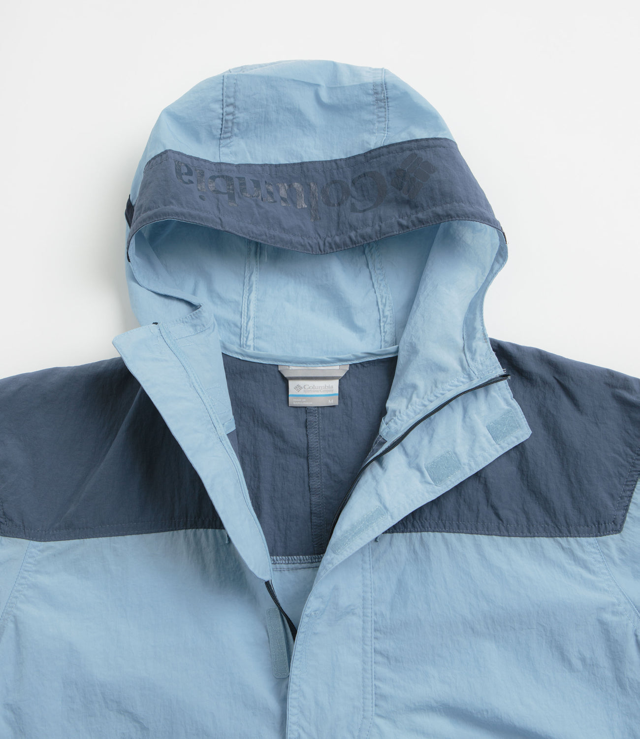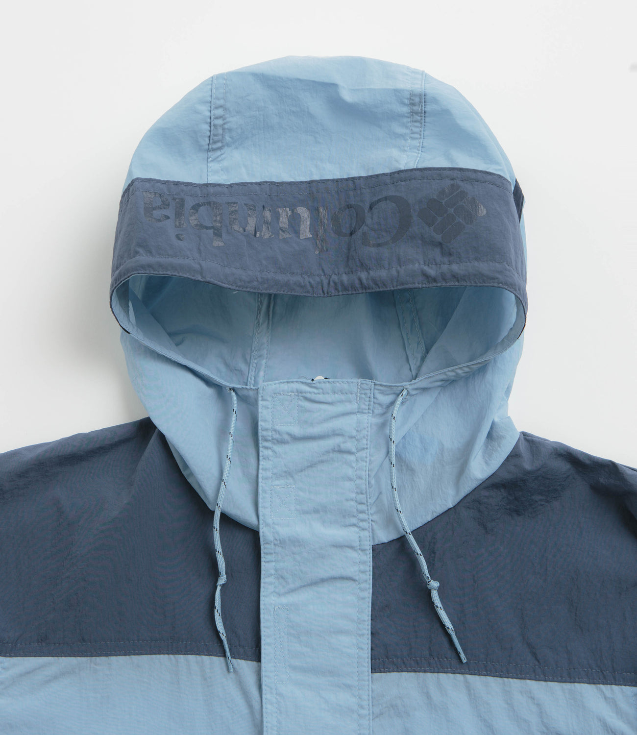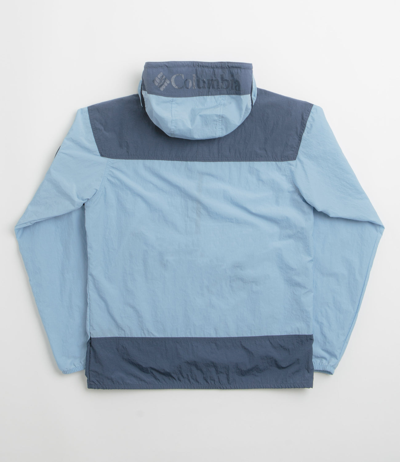 Columbia Challenger Windbreaker Anorak in Ripple Blue and Dark Mountain. Designed with contrast panels and Omni-Shield™ advanced technology, this regular fitting Columbia anorak is made from 100% nylon. Featuring a drawcord adjustable hood, a half-length zipper fastening, elasticated cuffs and a kangaroo front pocket, this blue Columbia jacket is finished with printed logo branding.