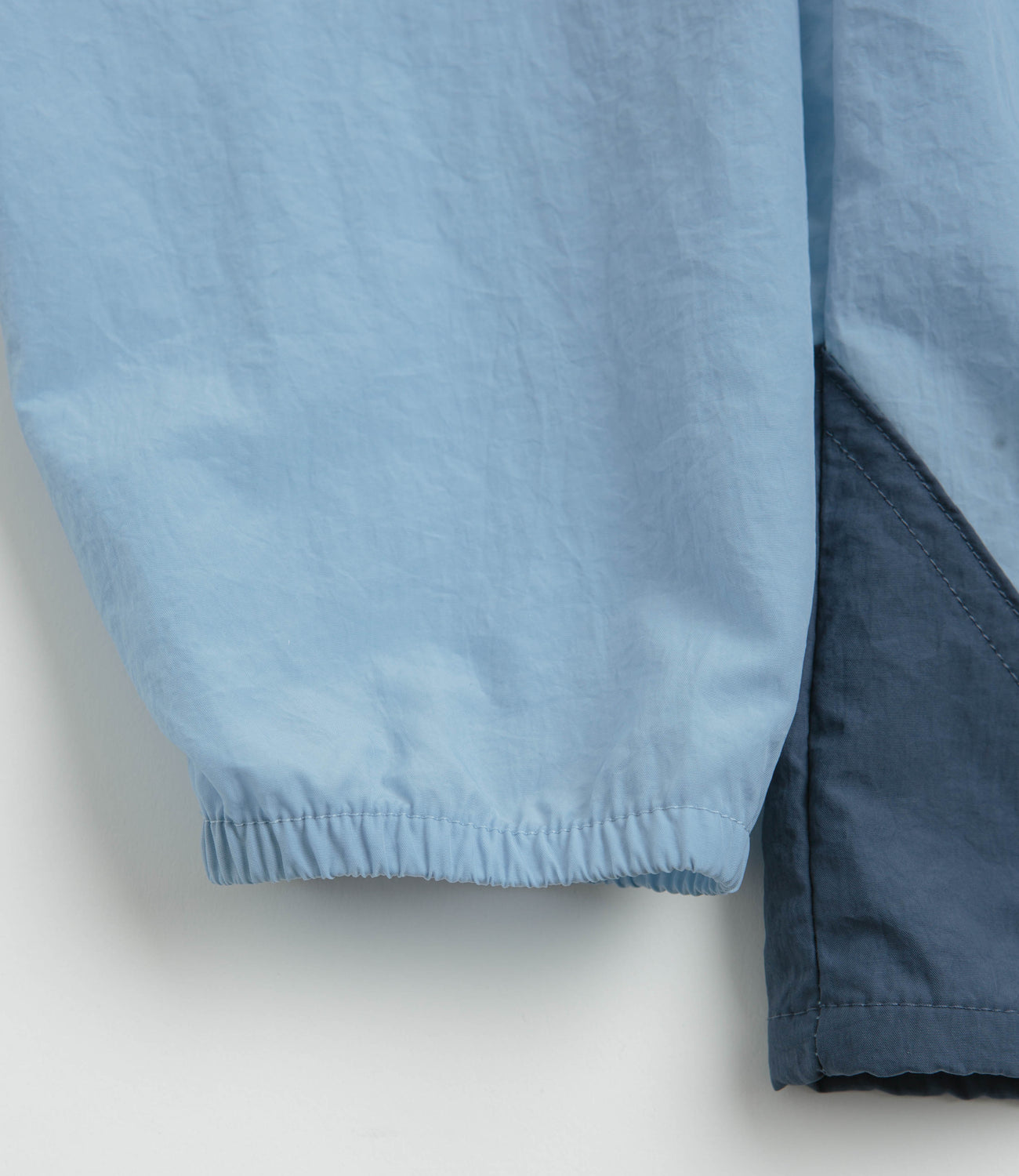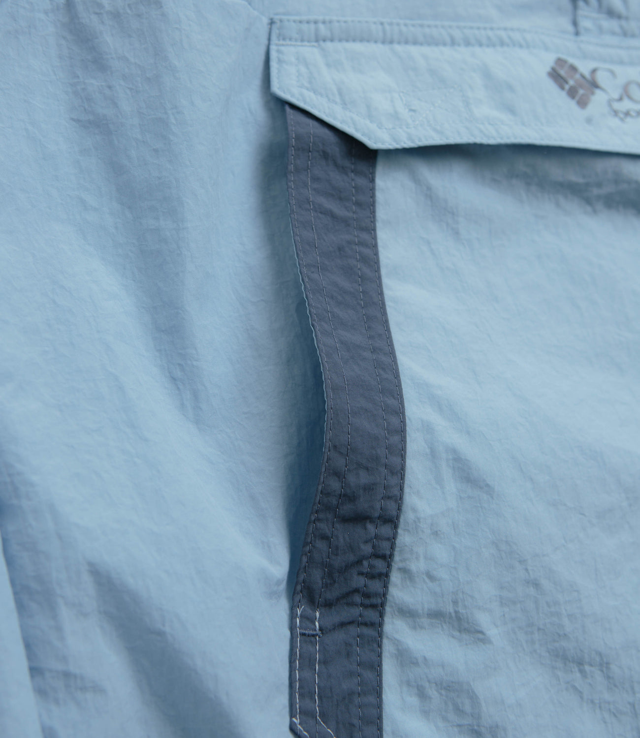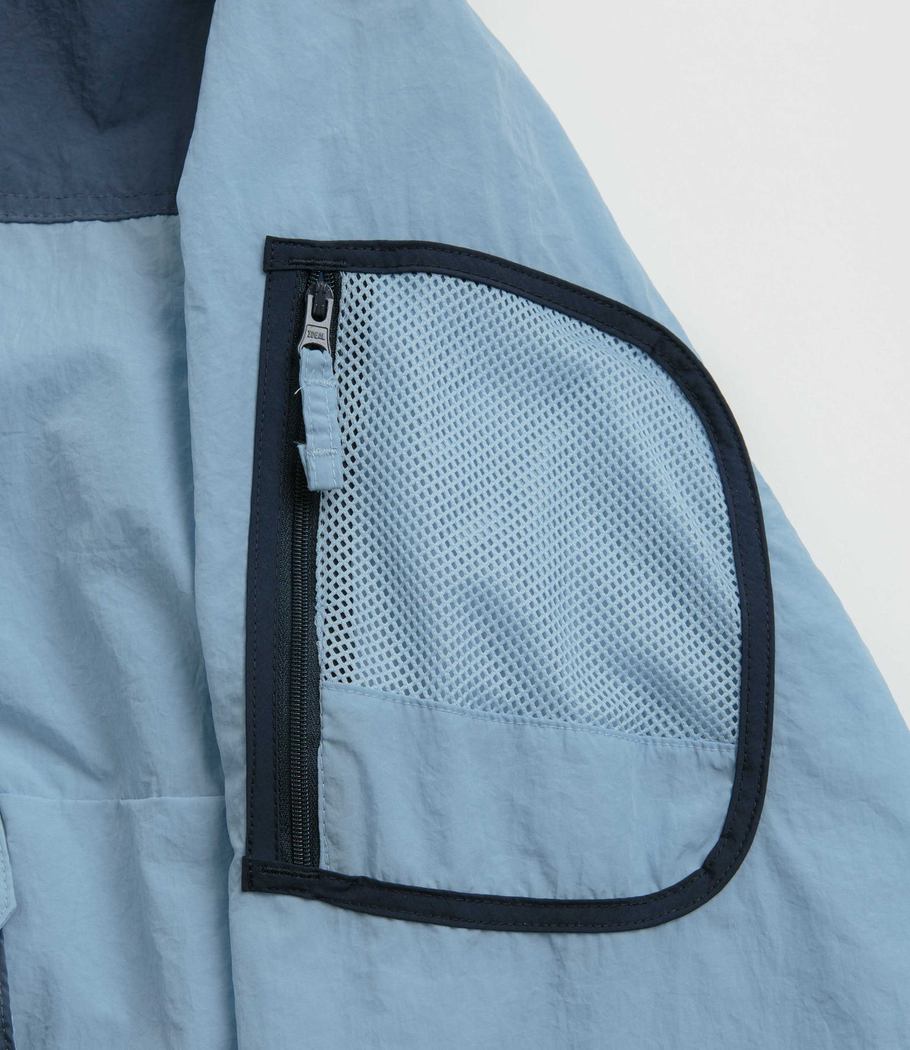 Columbia Challenger Windbreaker Anorak in Ripple Blue and Dark Mountain. Designed with contrast panels and Omni-Shield™ advanced technology, this regular fitting Columbia anorak is made from 100% nylon. Featuring a drawcord adjustable hood, a half-length zipper fastening, elasticated cuffs and a kangaroo front pocket, this blue Columbia jacket is finished with printed logo branding.