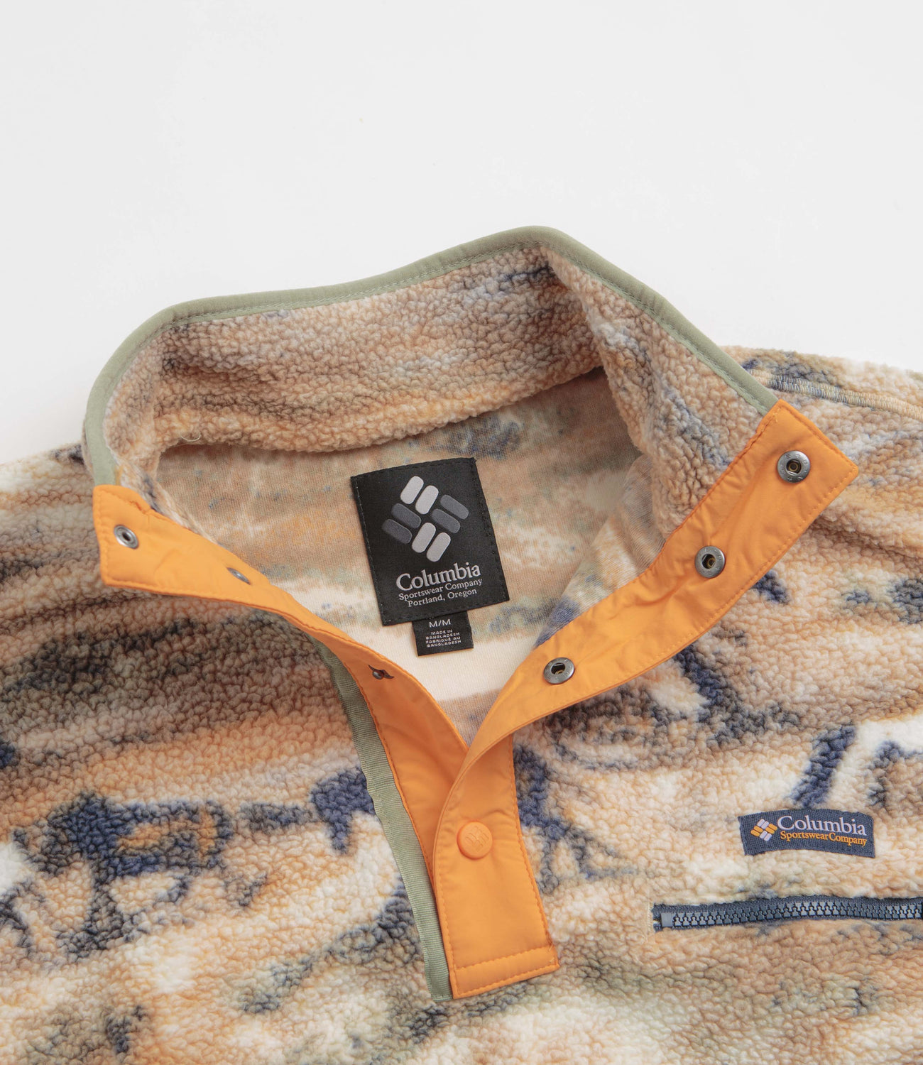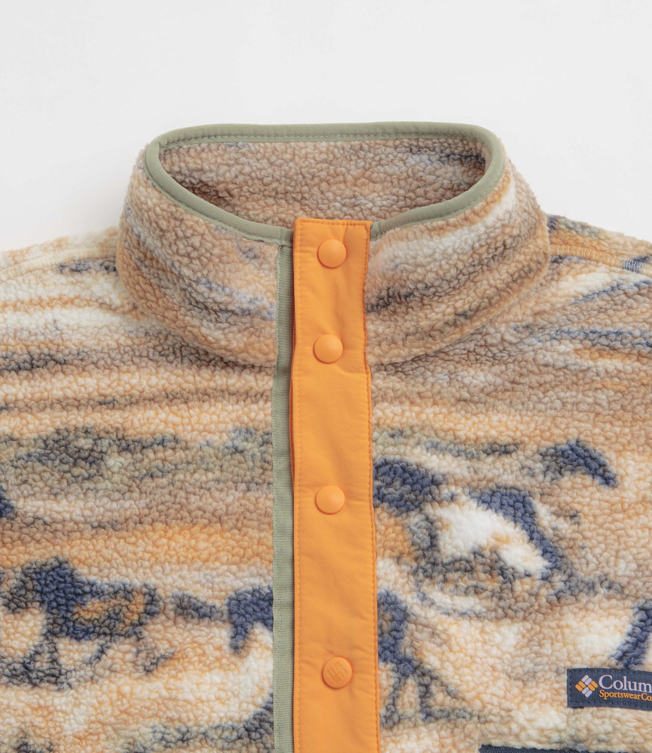 Columbia Helvetia II Printed Half Snap Fleece in Lemon Wash Roaming. Designed with an all-over pattern, this regular fitting Columbia fleece is made from 100% polyester Sherpa pile. Featuring a high-rise collar, a snap placket fastening and elasticated cuffs, this khaki yellow Columbia fleece is finished with a zippered chest pocket and flag label branding.