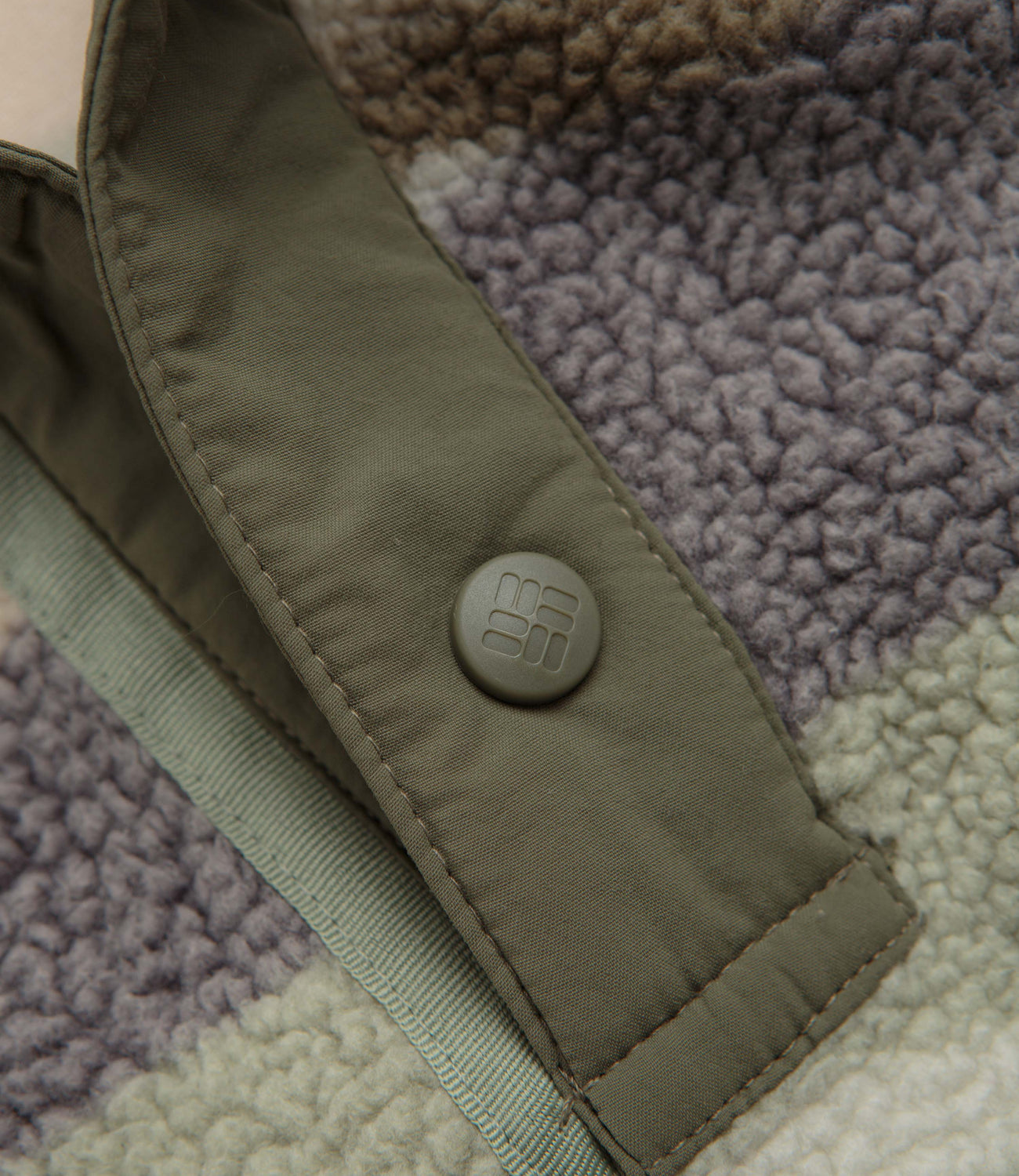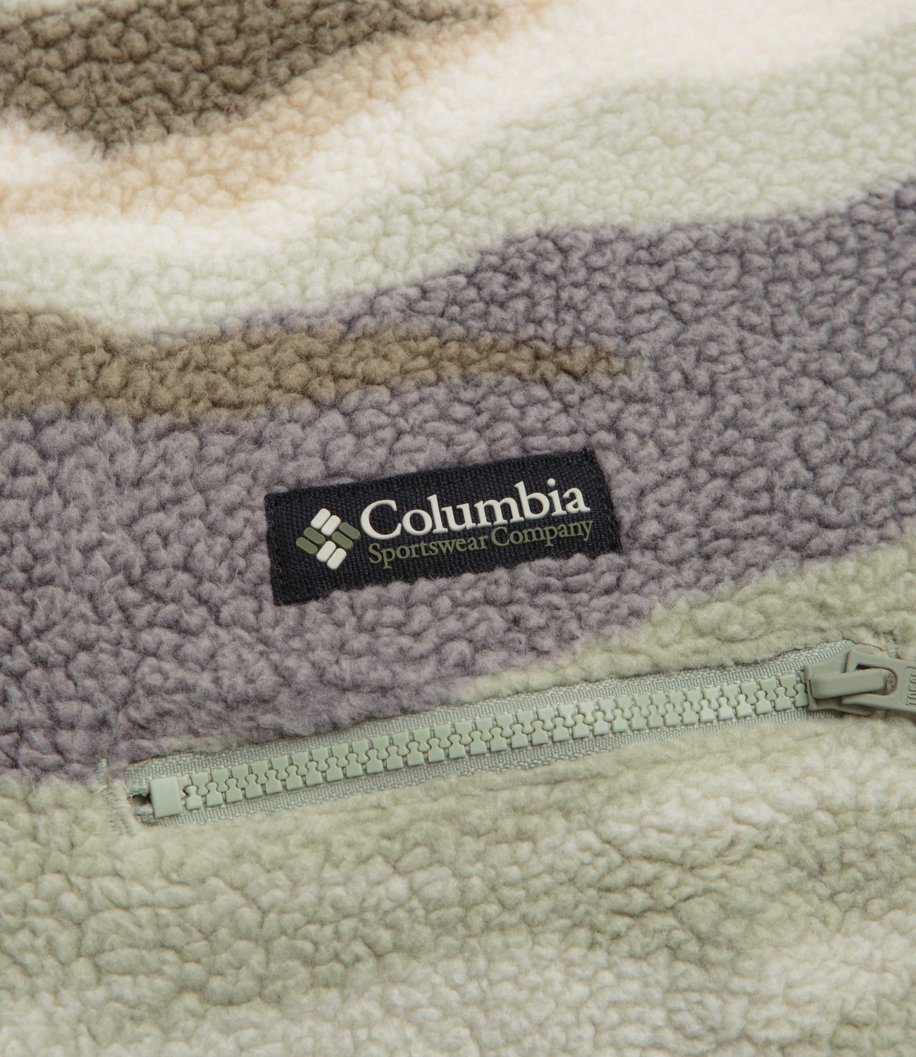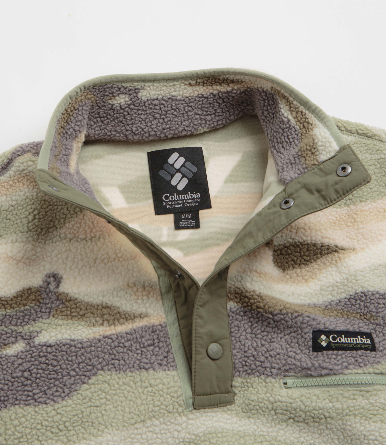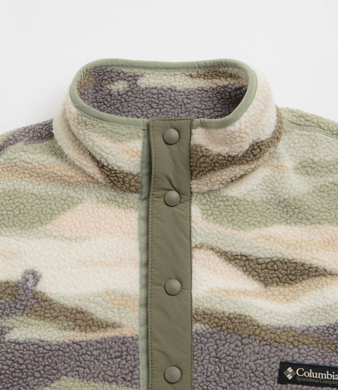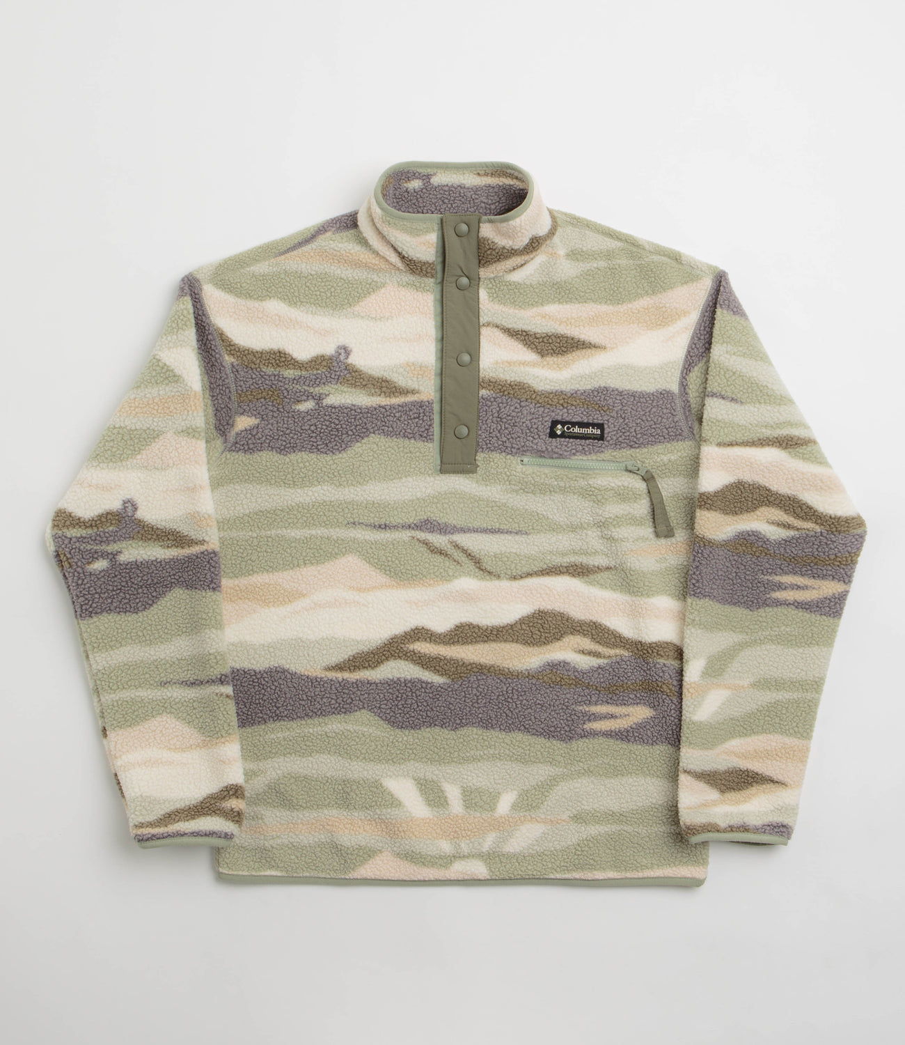 Columbia Helvetia II Printed Half Snap Fleece in Safari Rogue Valley. Regular fitting and designed with an all-over landscape pattern, this Columbia fleece is made from 100% polyester Sherpa pile. Featuring a high-rise collar, a snap placket fastening and elasticated cuffs, this khaki green Columbia fleece is finished with a zippered chest pocket and flag label branding.
