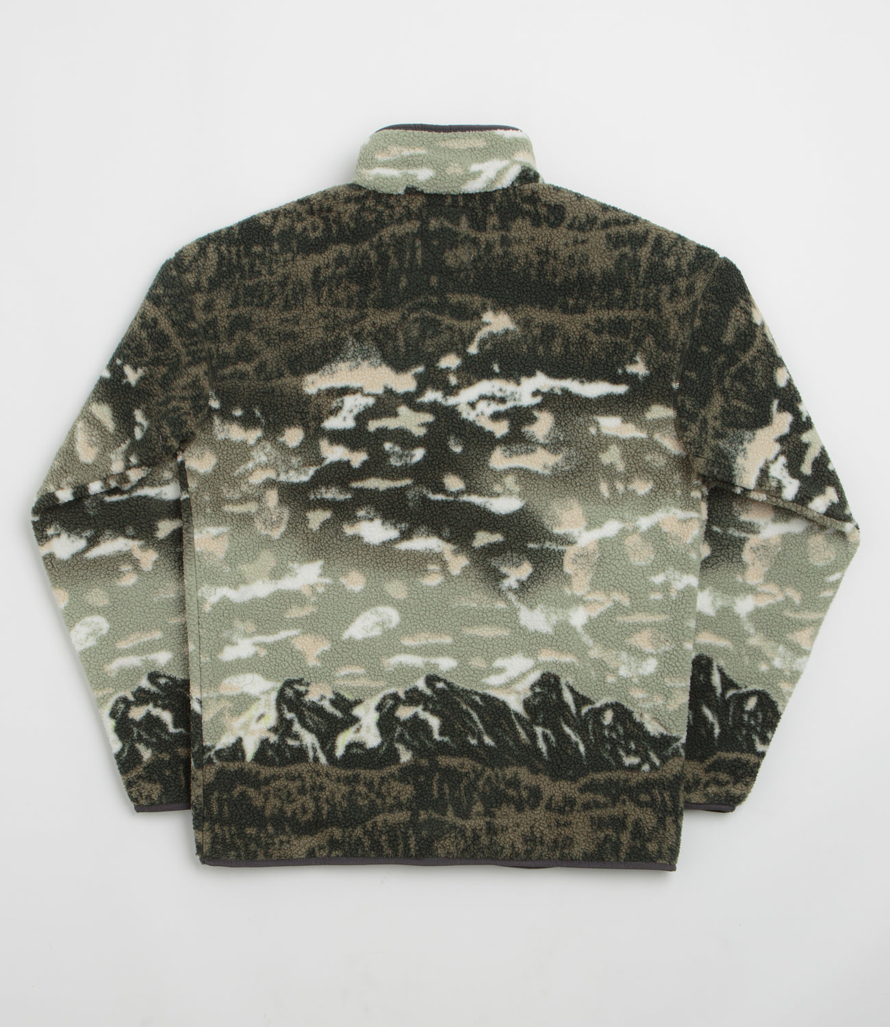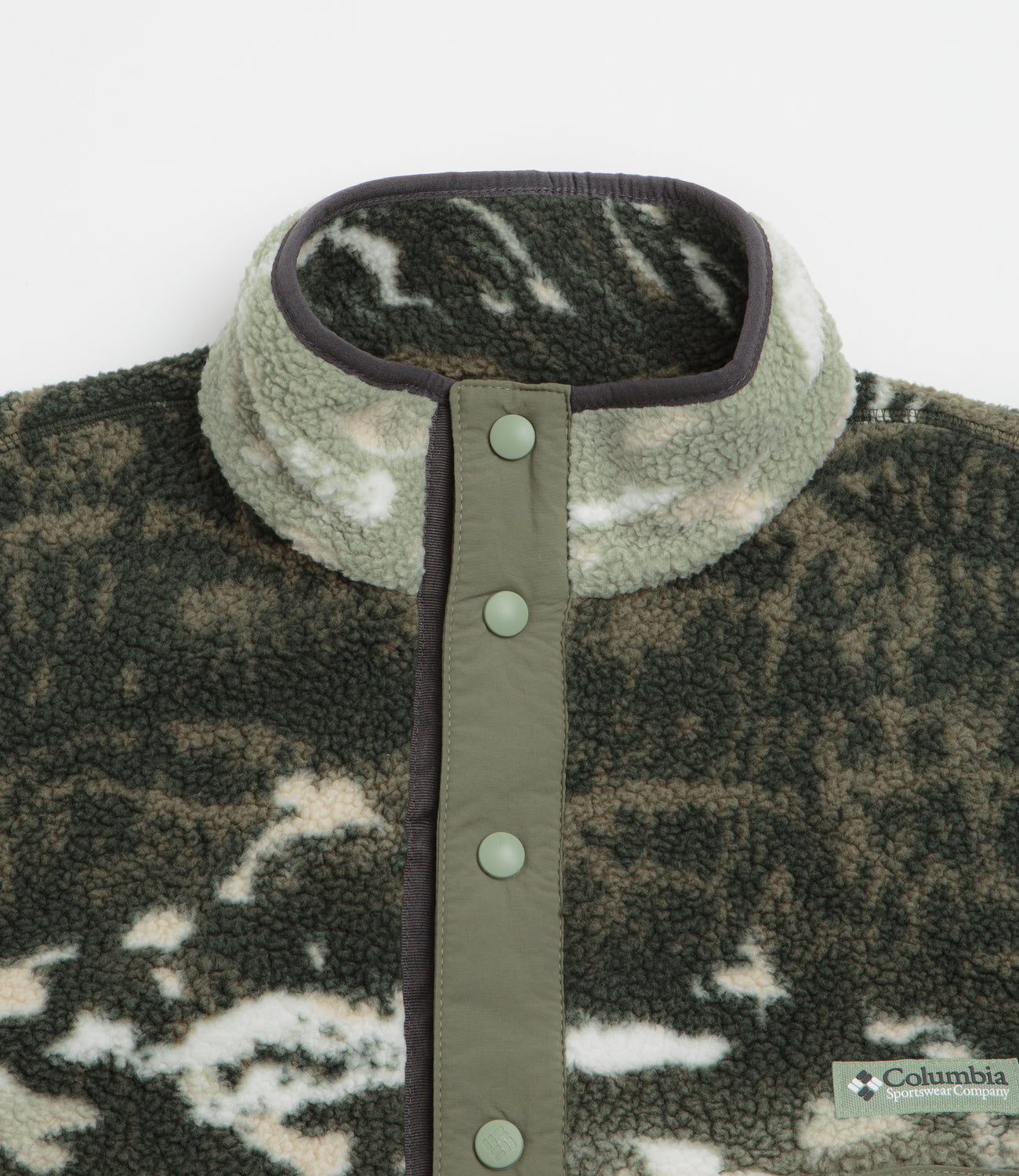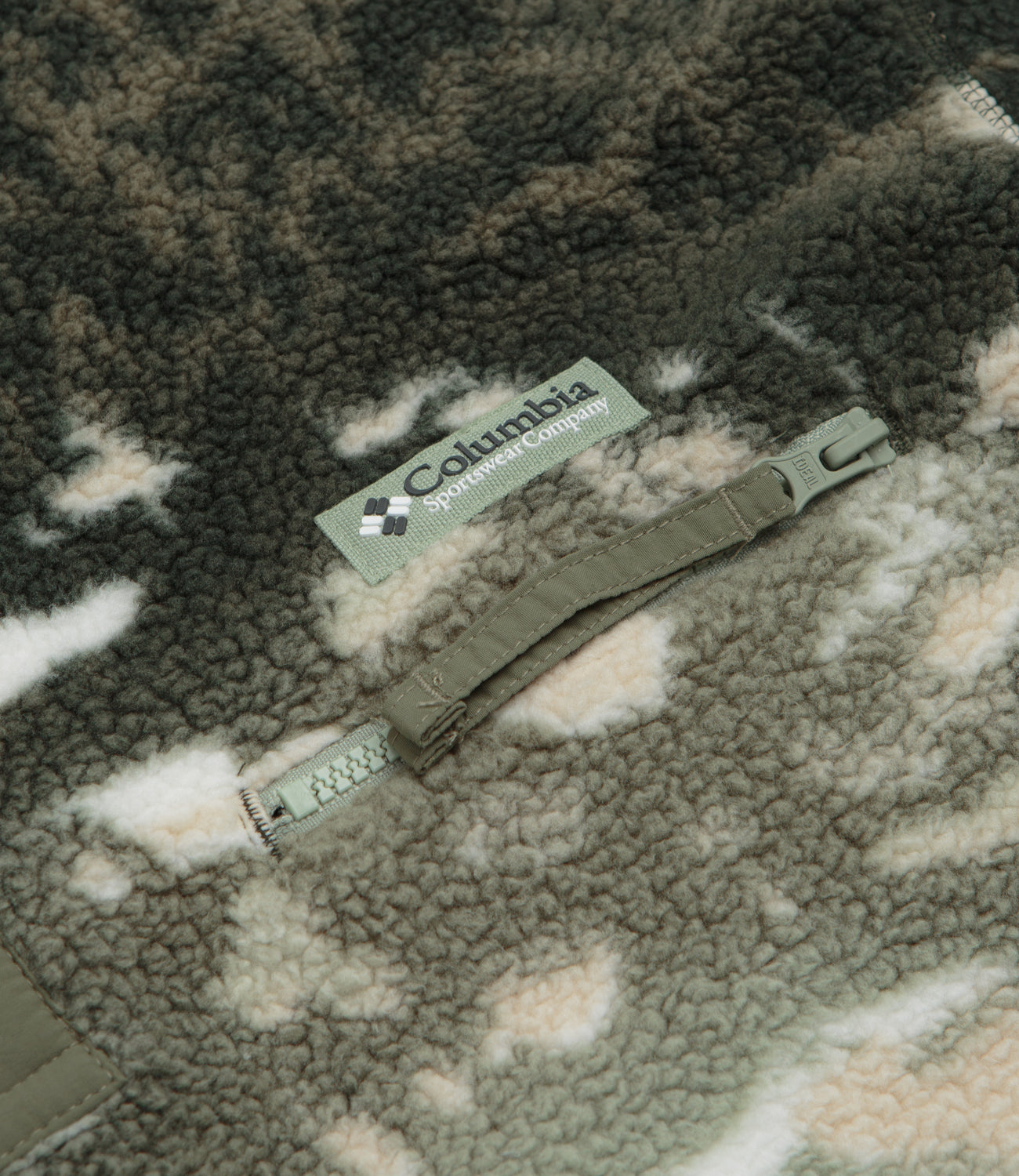 Columbia Helvetia II Printed Half Snap Fleece in Safari and Sisters. Designed with an all-over sublimation print, this regular fitting Columbia fleece is made from 100% polyester Sherpa pile with contrasting nylon details. Featuring a snap-placket fastening, elasticated cuffs and a zippered chest pocket, this khaki green Columbia fleece is finished with a kangaroo front pocket and woven flag label branding.