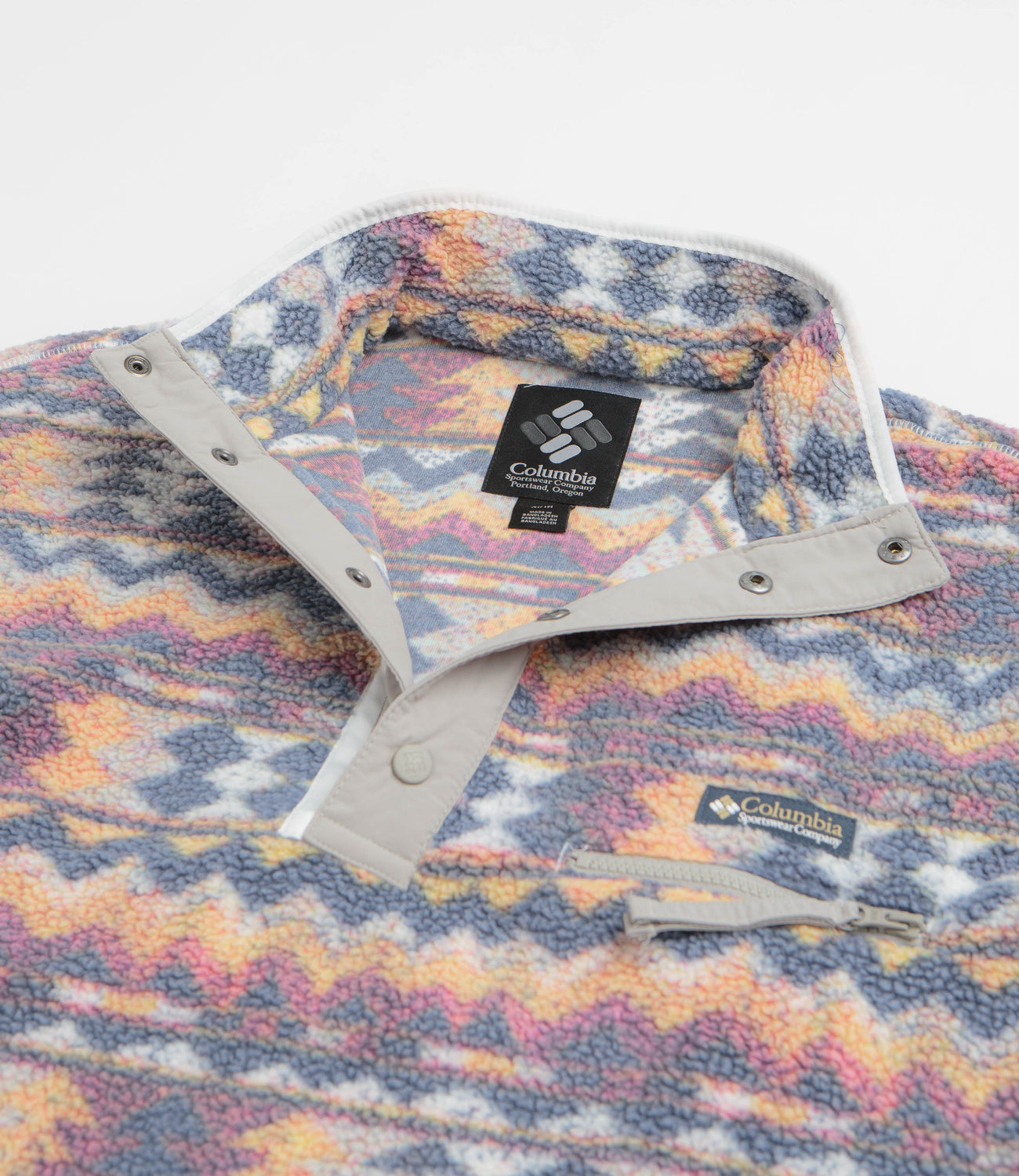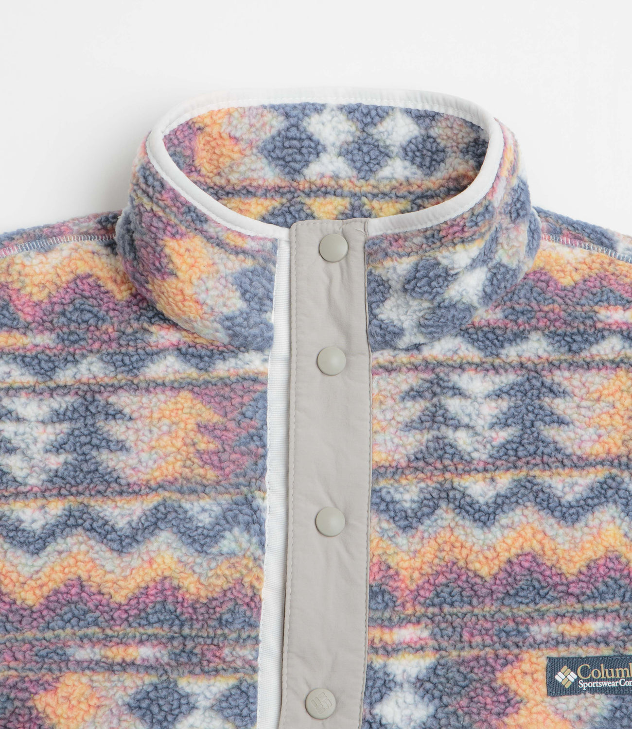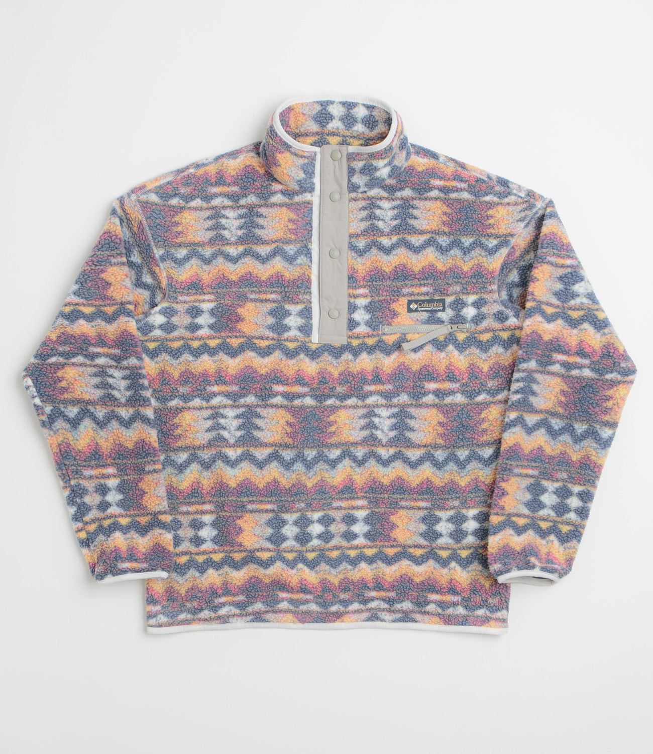 Warm, practical, and made for fresh air escapes - this Columbia fleece uses soft sherpa with an all-over print to keep things both functional and easy on the eye. Nylon panelling boosts durability, while the stand collar and snap placket help lock in heat. Finished with elasticated trims and a zippered chest pocket for the essentials.