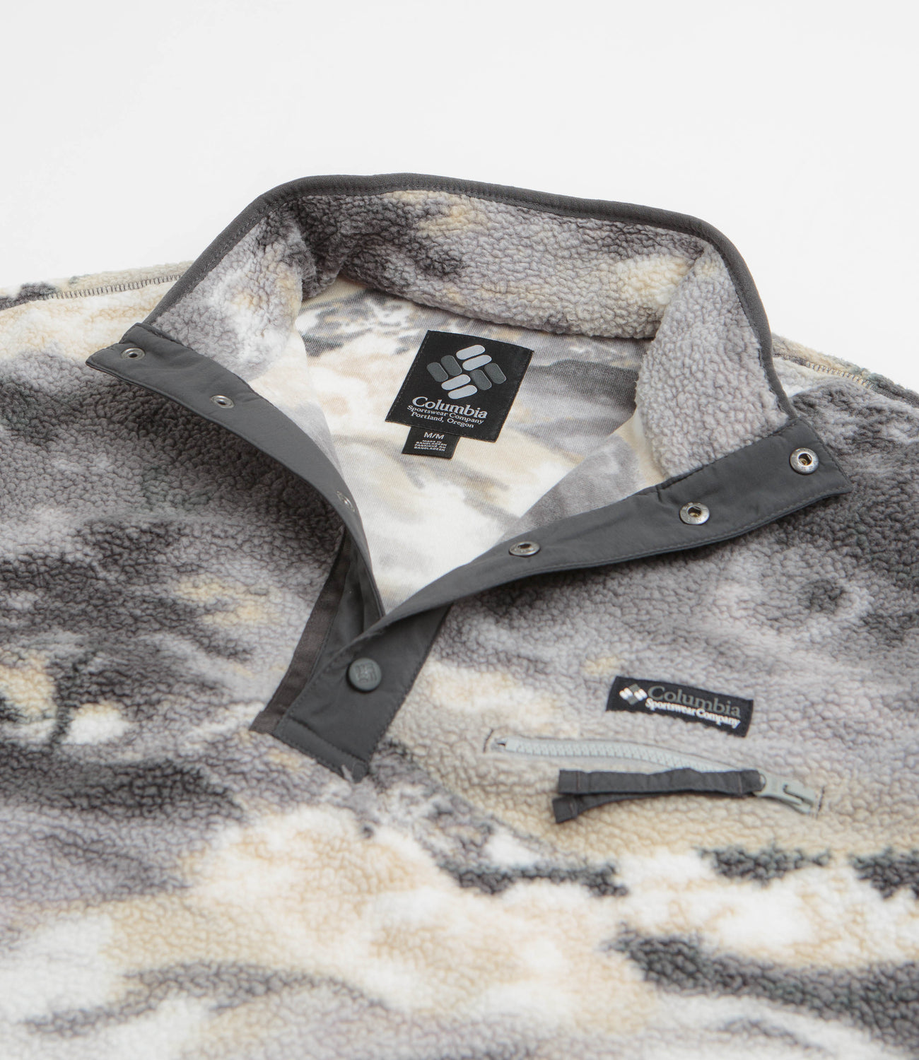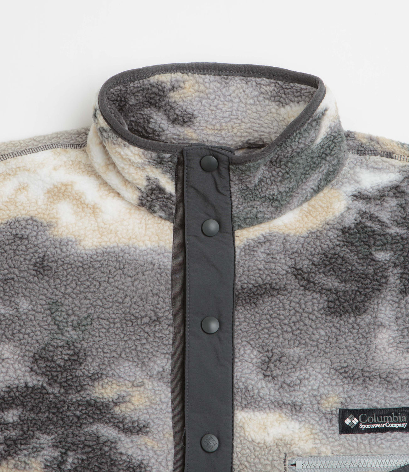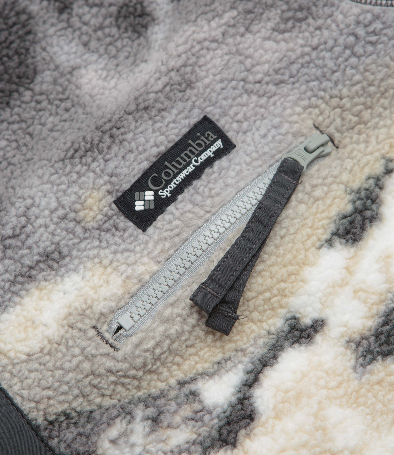Built for colder days on the move, this Columbia fleece keeps things warm with soft sherpa and a bold all-over print. Nylon panels add extra strength where it counts, while the snap placket and stand collar make it easy to adjust when the weather shifts. Elasticated cuffs and hem help lock in heat, with a zippered chest pocket for stashing the small stuff.