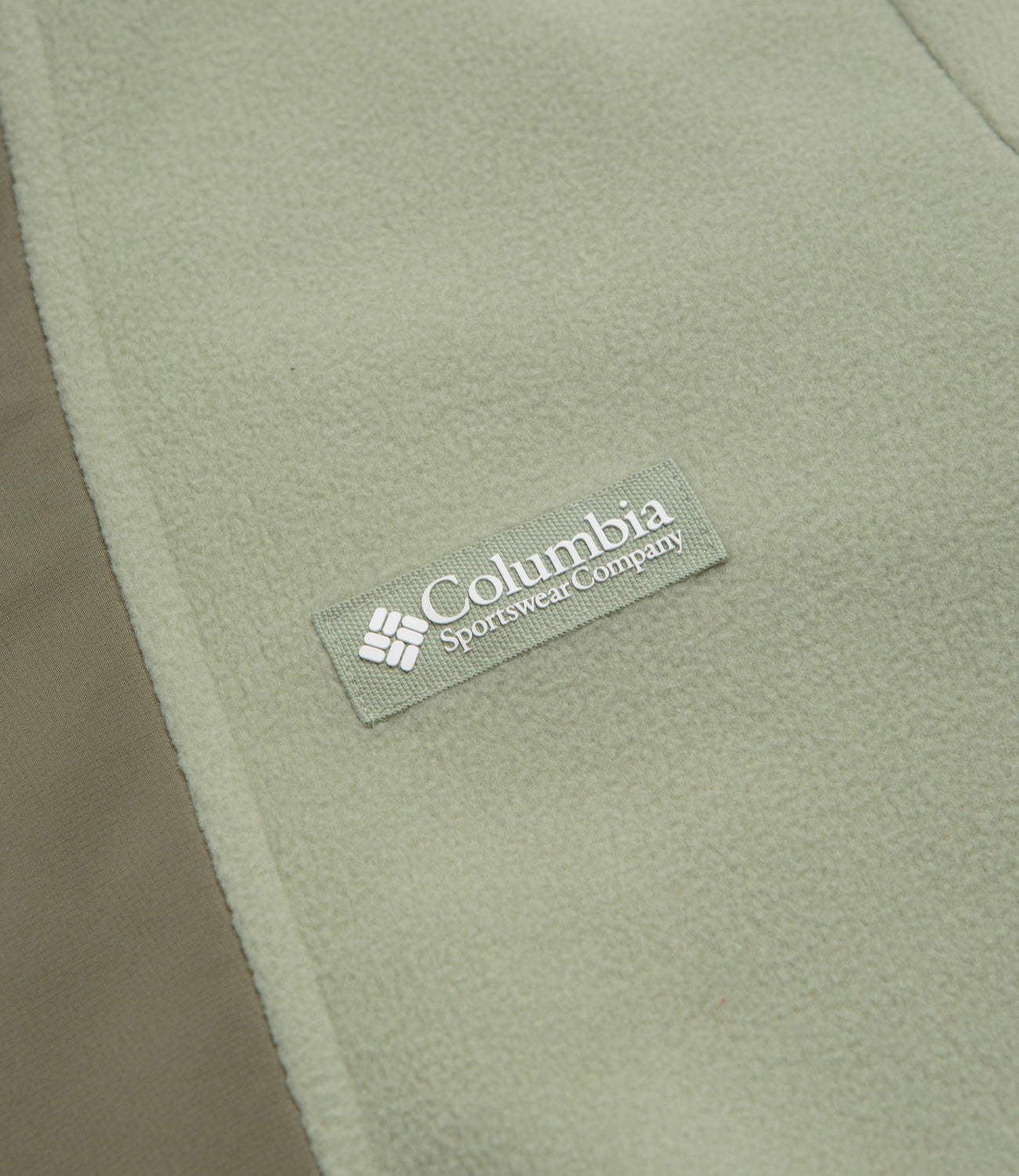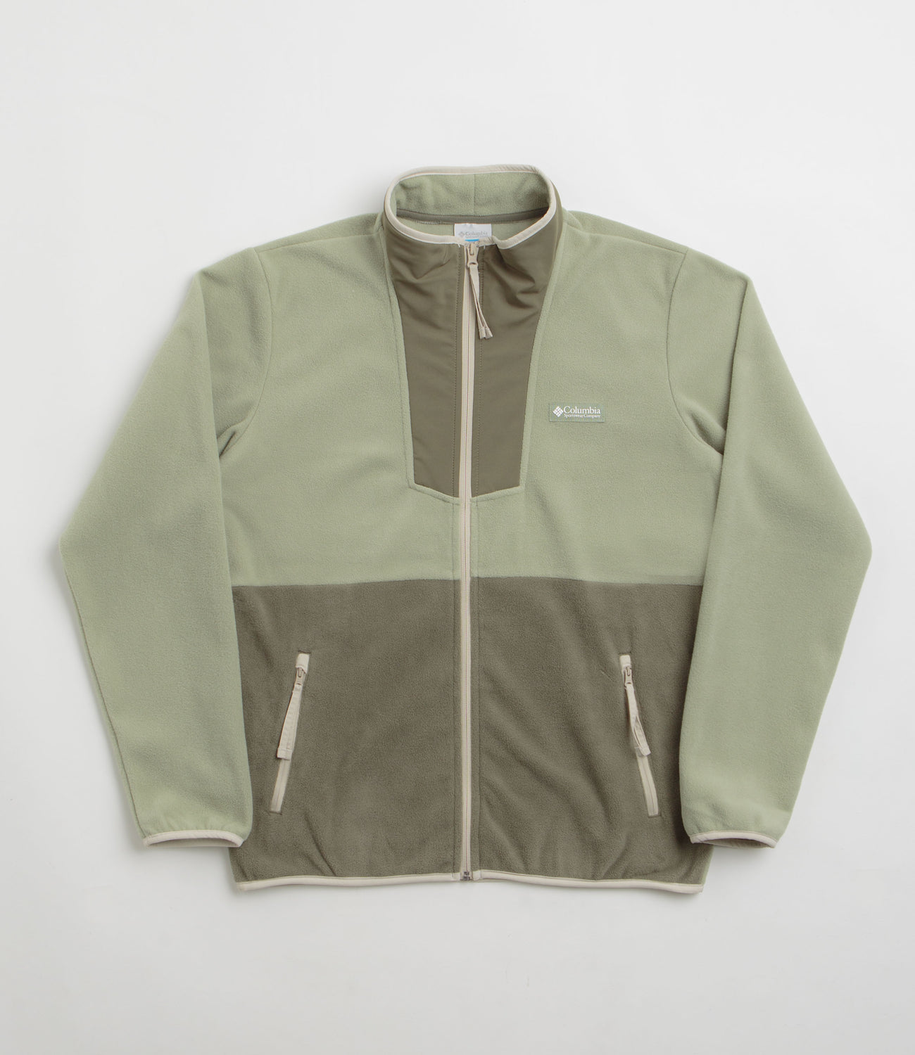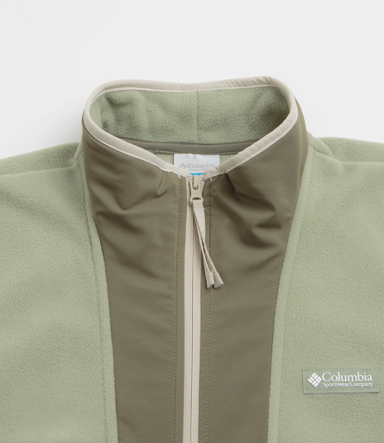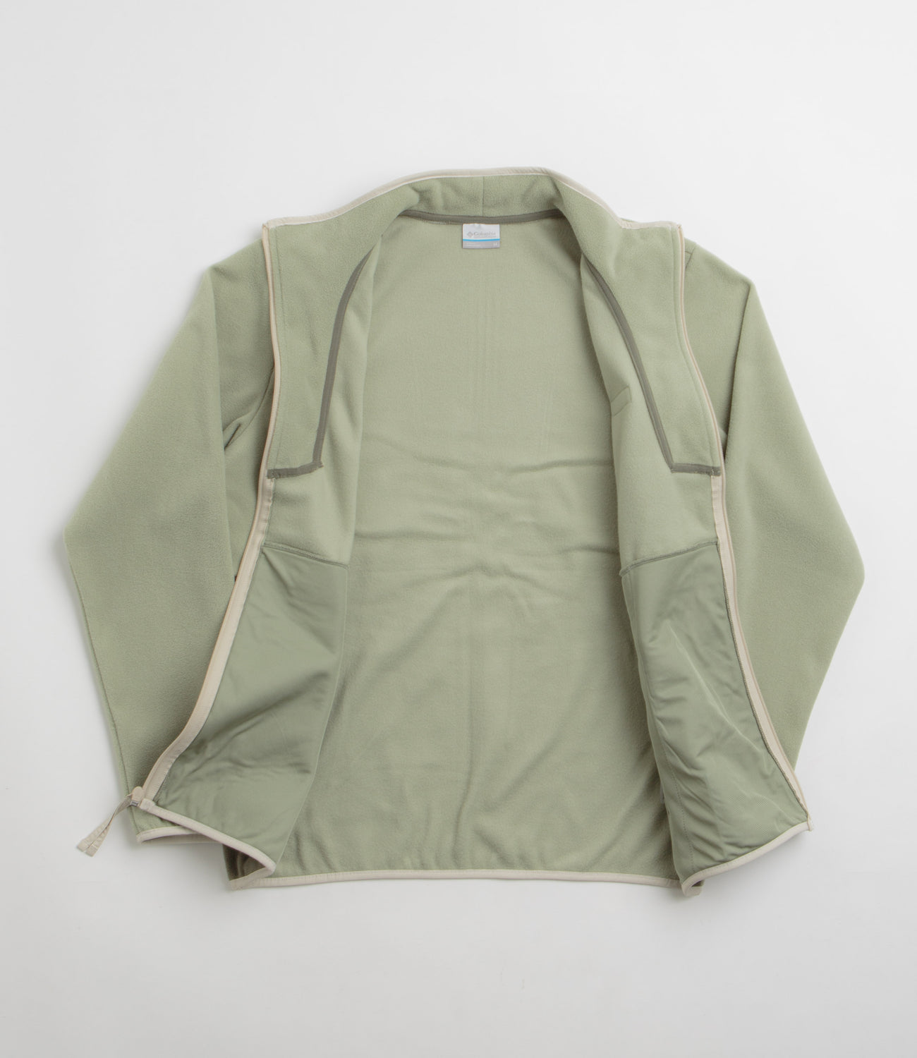 Columbia Sequoia Grove Full Zip Fleece in Safari and Stone Green. Made from 100% recycled polyester with contrast panelling, this regular fitting Columbia fleece is designed with a full length zipper fastening. Featuring a stand collar, elasticated cuffs and a woven elastic hem, this khaki green Columbia fleece is finished with two zippered front pockets and woven flag label branding.