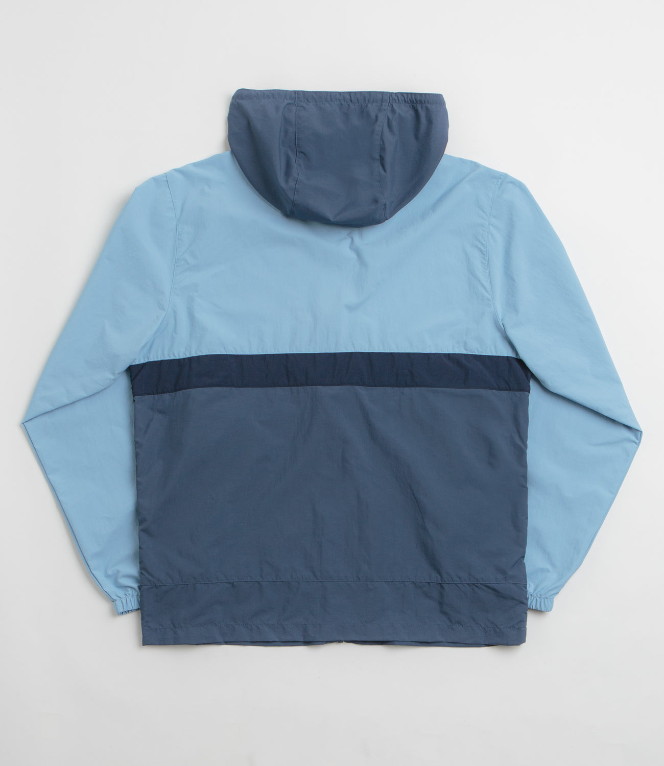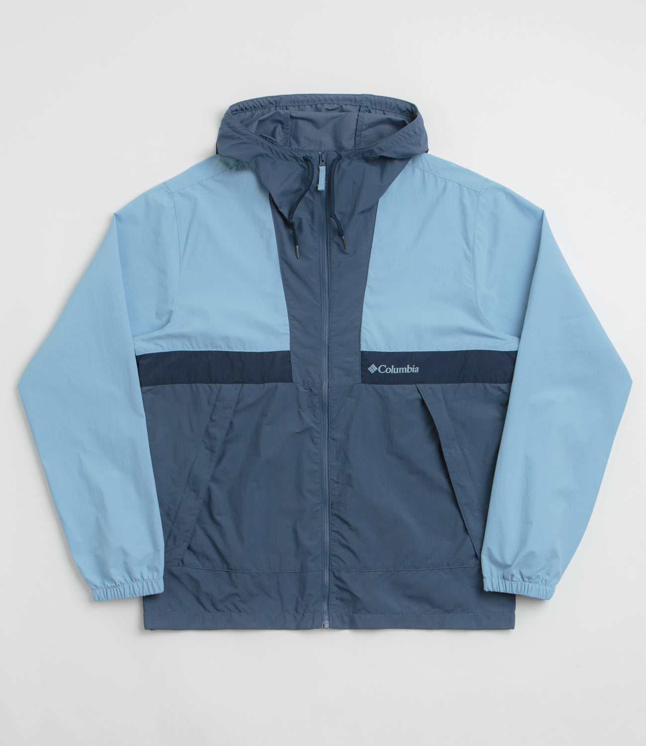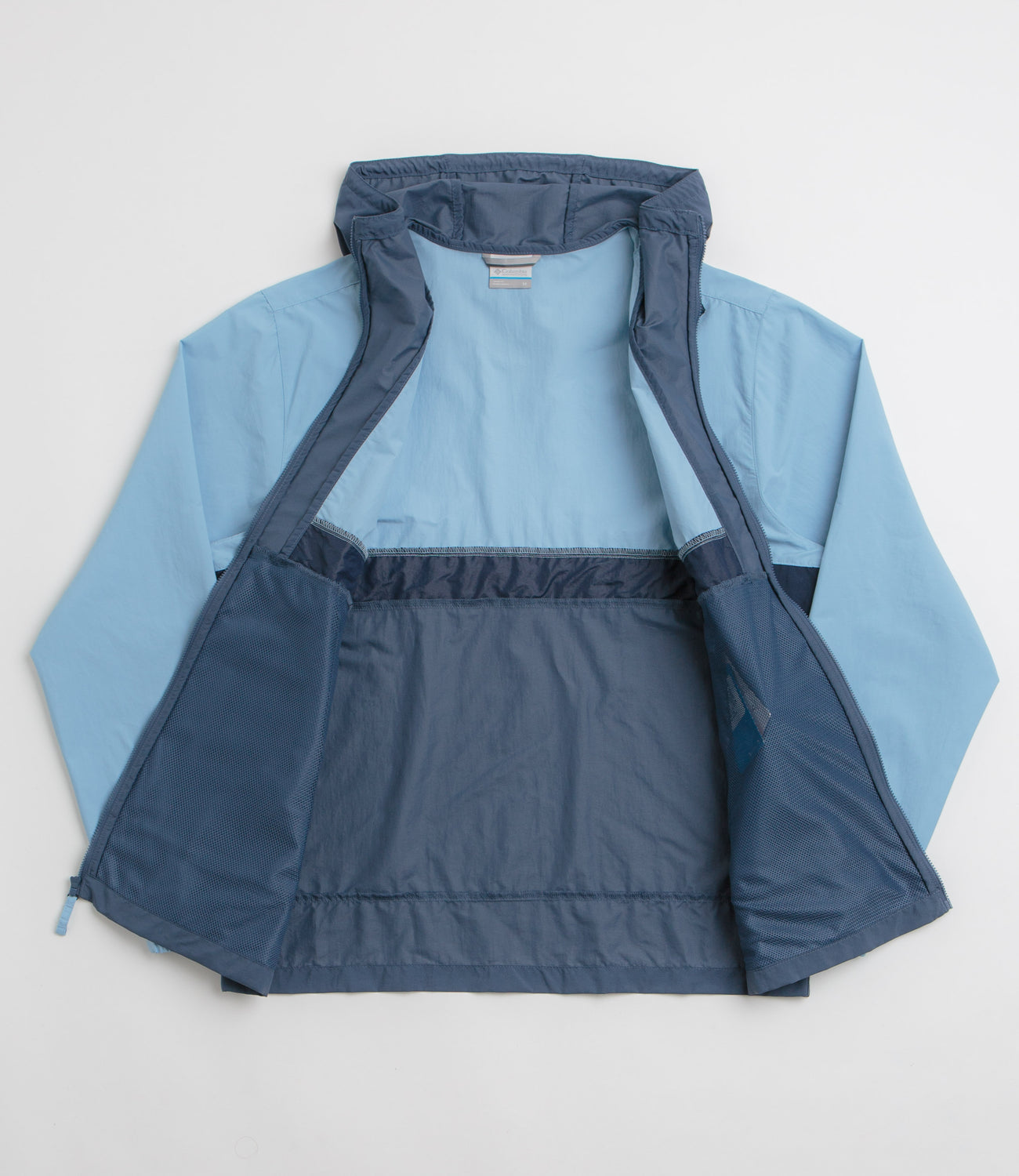 Columbia Spire Valley Hooded Windbreaker Jacket in Ripple Blue, Dark Mountain and Collegiate Navy. Made from 100% nylon, this regular fitting Columbia jacket is designed with Omni-Shield™ technology and Omni-Shade™ Broad Spectrum protection. Finished in light blue with an adjustable drawcord hood, a full length zipper fastening, a panelled chest, two zippered front pockets and printed logo branding.