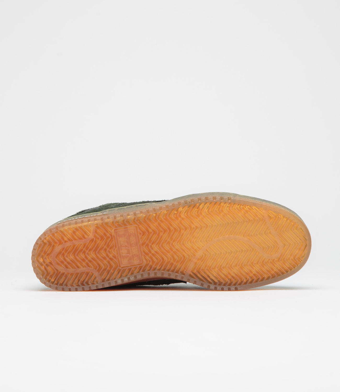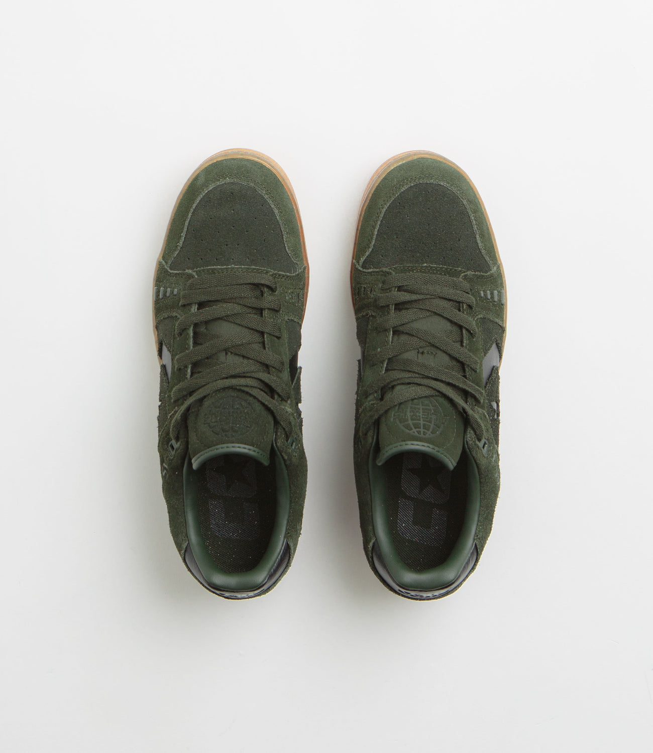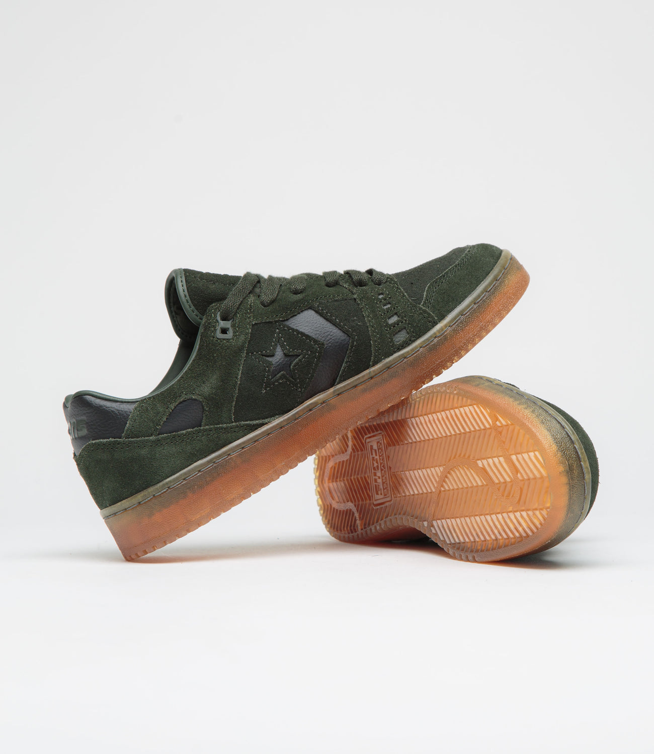 Converse AS-1 Pro Ox Shoes in Green Onyx, Dense Canopy and Black. Skater Alexis Sablone’s pro model, this Converse AS-1 Pro Ox is designed with suede uppers and contrasting black leather underlays. Featuring engineered GRASSHOPPER coring, a perforated forefoot and a CX foam sockliner, this dark green Converse AS-1 Pro Ox also features a full length cupsole stitch. Finished with rubber pod details, a translucent gum outsole, Chevron-Star side walls and embossed AS-1 detailing.