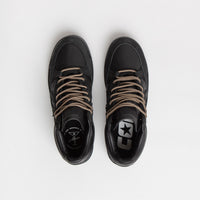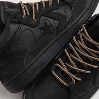 Converse x Alltimers Fastbreak Pro Mid Shoes in Black. Designed in collaboration with Alltimers, this Converse Fastbreak Pro Mid arrives in an all-black colourway inspired by an appreciation for durable, luxe aesthetics. Featuring black leather and nubuck uppers with a cushioned CX foam sockliner, a traction rubber outsole and an elongated caged toe overlay for maximised durability, this co-designed and reworked Converse x Alltimers Fastbreak Pro Mid is finished with tonal Chevron Star side wall details, printed insoles, a flat style lacing system and with an embroidered ‘A’ Alltimers logo sewn across each heel.