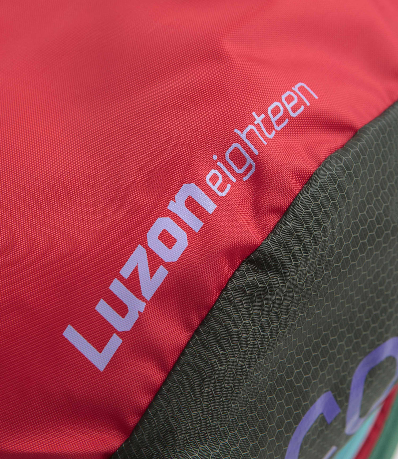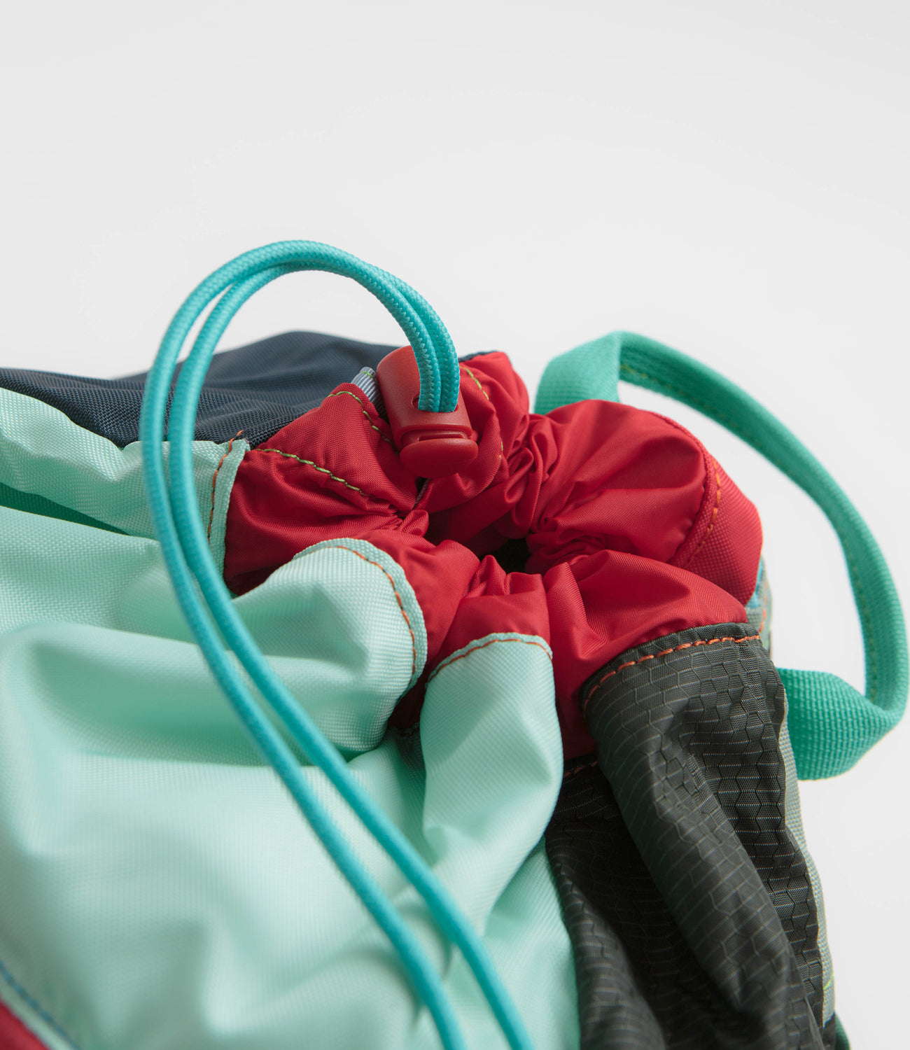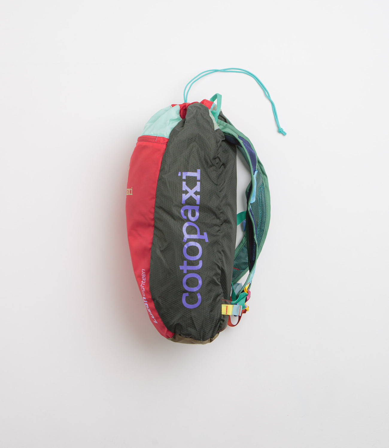 Cotopaxi Luzon 18L Backpack in Del Dia. Single sized with a storage capacity of up to 18-litres, this Cotopaxi backpack is designed with a ripstop nylon shell. Featuring a drawstring fastened main compartment, a front zippered pocket and an internal hydration sleeve, this multicoloured Cotopaxi backpack is finished with ultralight mesh shoulder straps and printed logo branding.