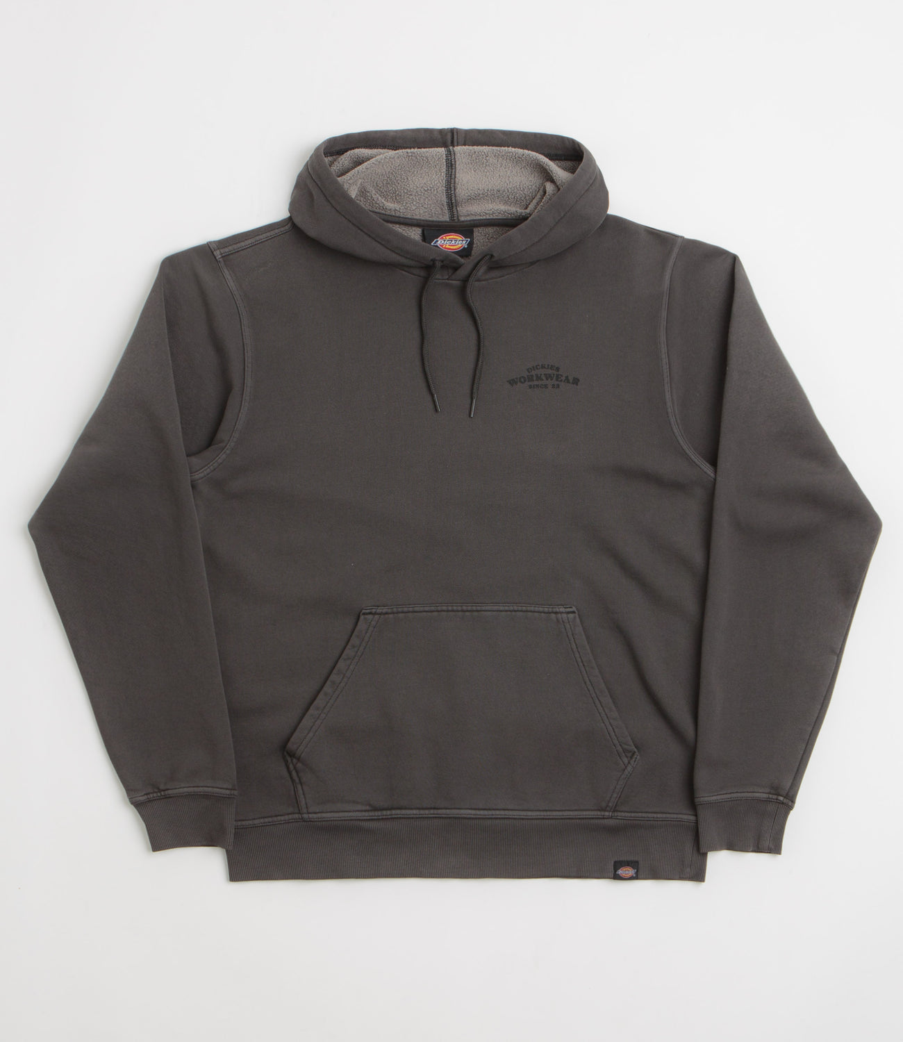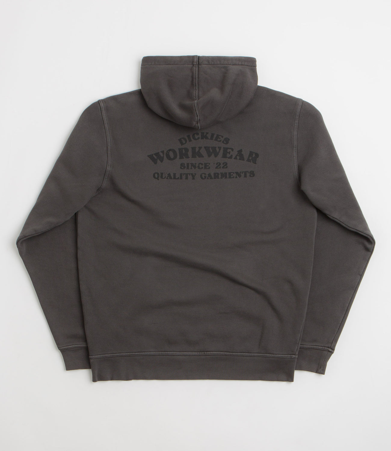 Dickies Christiana Hoodie in Black. Relaxed fitting and made from a cotton-polyester blend, this garment dyed Dickies hoodie is designed with an adjustable drawcord hood. Finished in black with a kangaroo front pocket, ribbed cuffs and printed front and rear graphics.