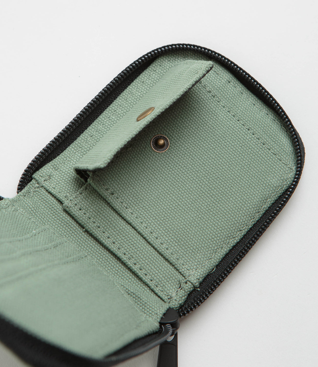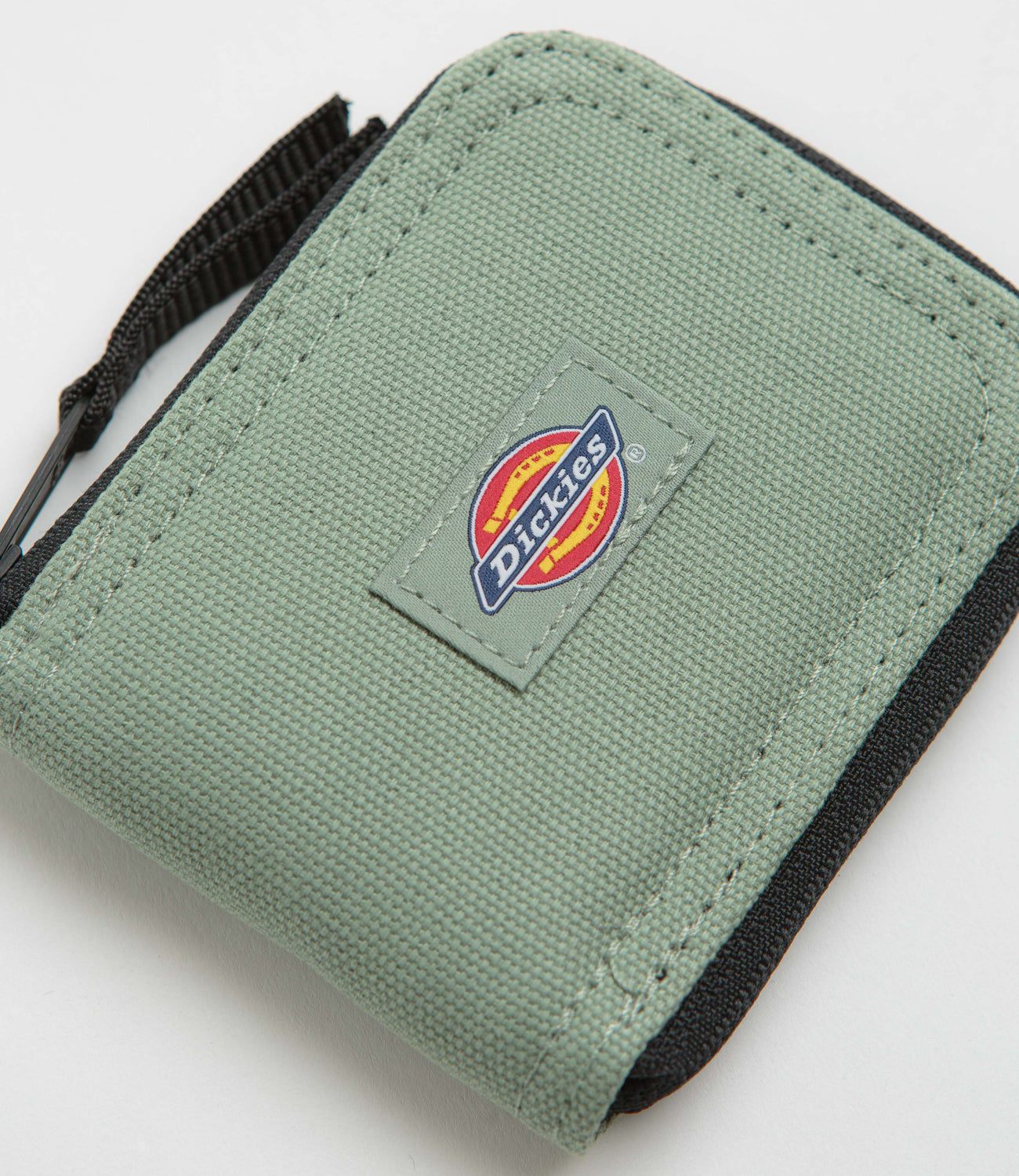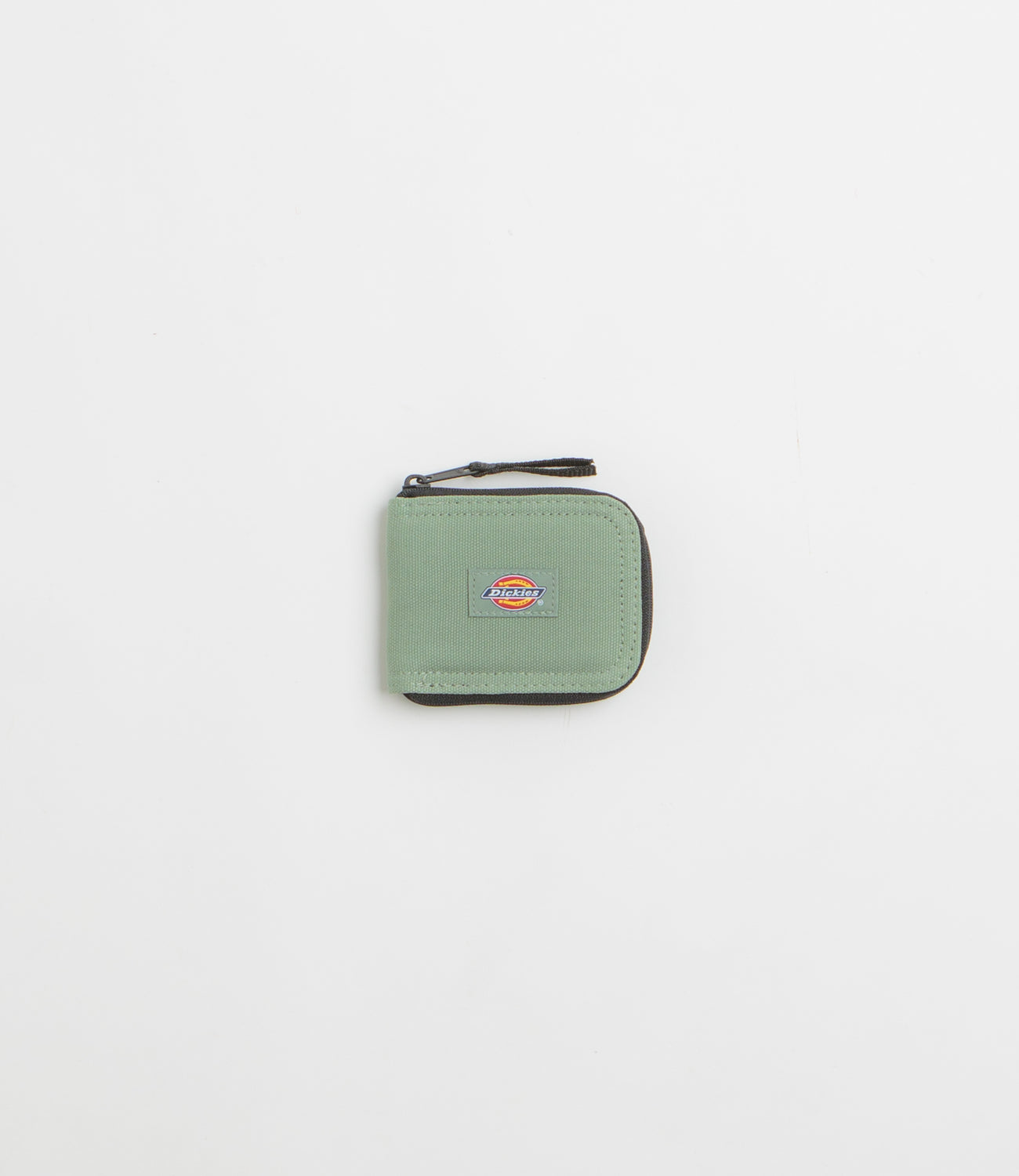 Dickies Duck Canvas Wallet in Sea Spray. Made from 100% cotton canvas, this single sized Dickies wallet is designed with zippered fastening and an internal coin pocket. Finished in green with additional ID and card pockets, a press-stud fastening and flag label branding.