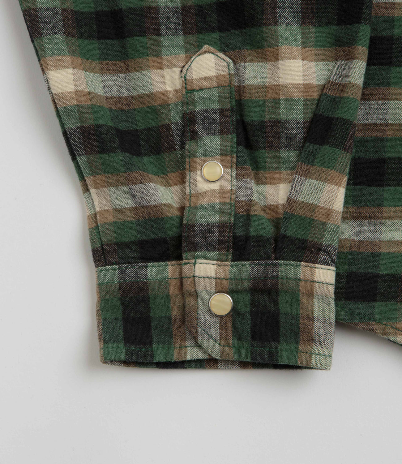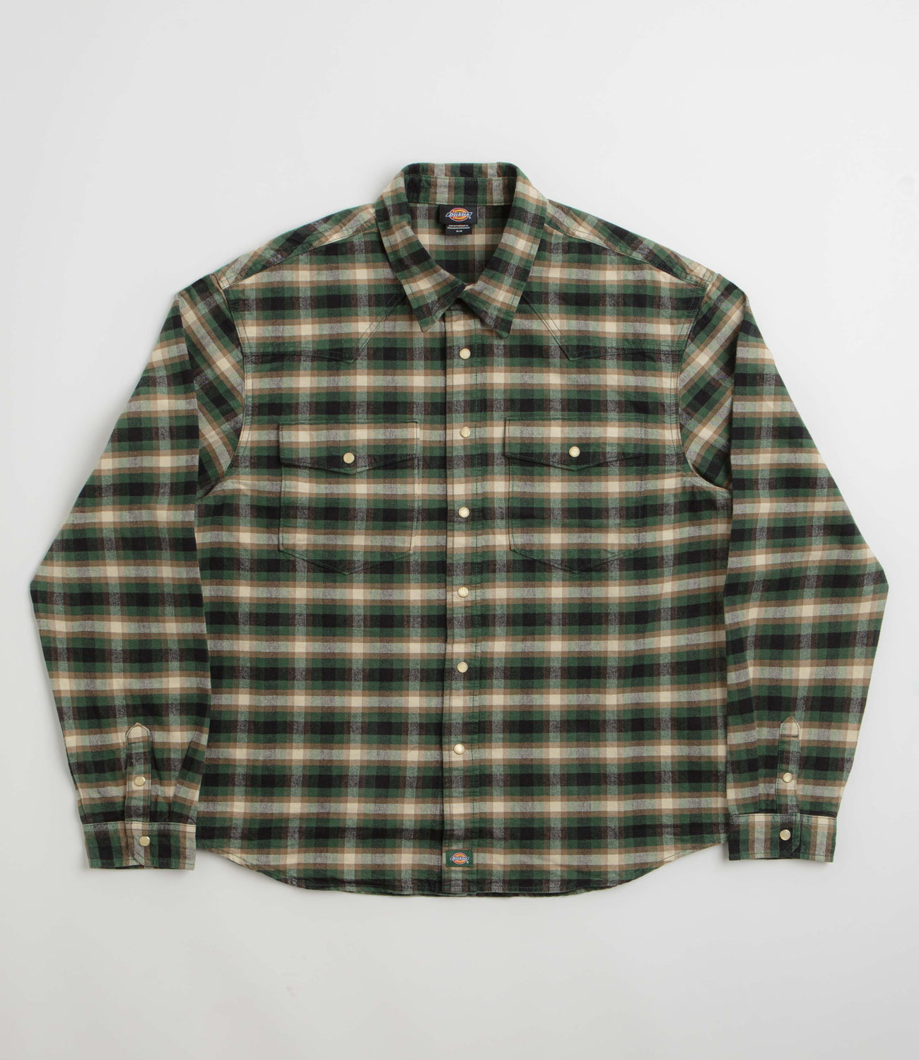 Dickies Johnsonville Shirt in Pine Needle Green. Made from 100% cotton flannel, this boxy fitting Dickies shirt is designed with a two-piece collar and a full length snap fastening. Featuring Western-style yoke detailing, two chest pockets and bevelled cuff corners, this green Dickies shirt is finished with a scooped hem and flag label branding.