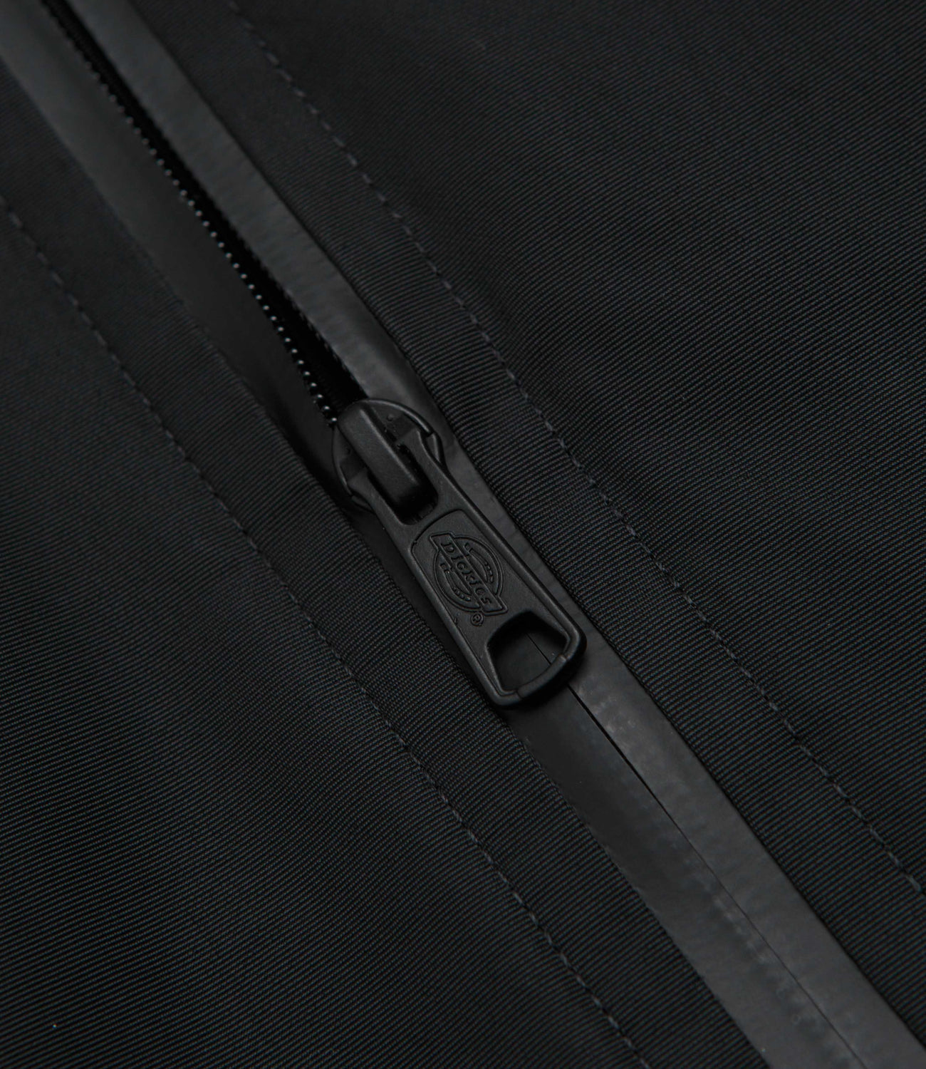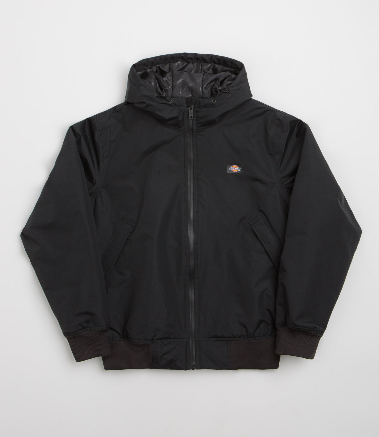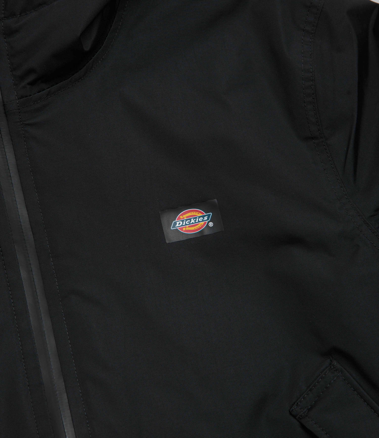 Dickies New Sarpy Jacket in Black. Regular fitting and made from 100% polyamide, this water-resistant Dickies jacket is designed with an adjustable toggle-cord hood and a full length zipper fastening. Finished in black with ribbed cuffs, a woven elastic rib knit hem, two front pockets and woven flag label branding.