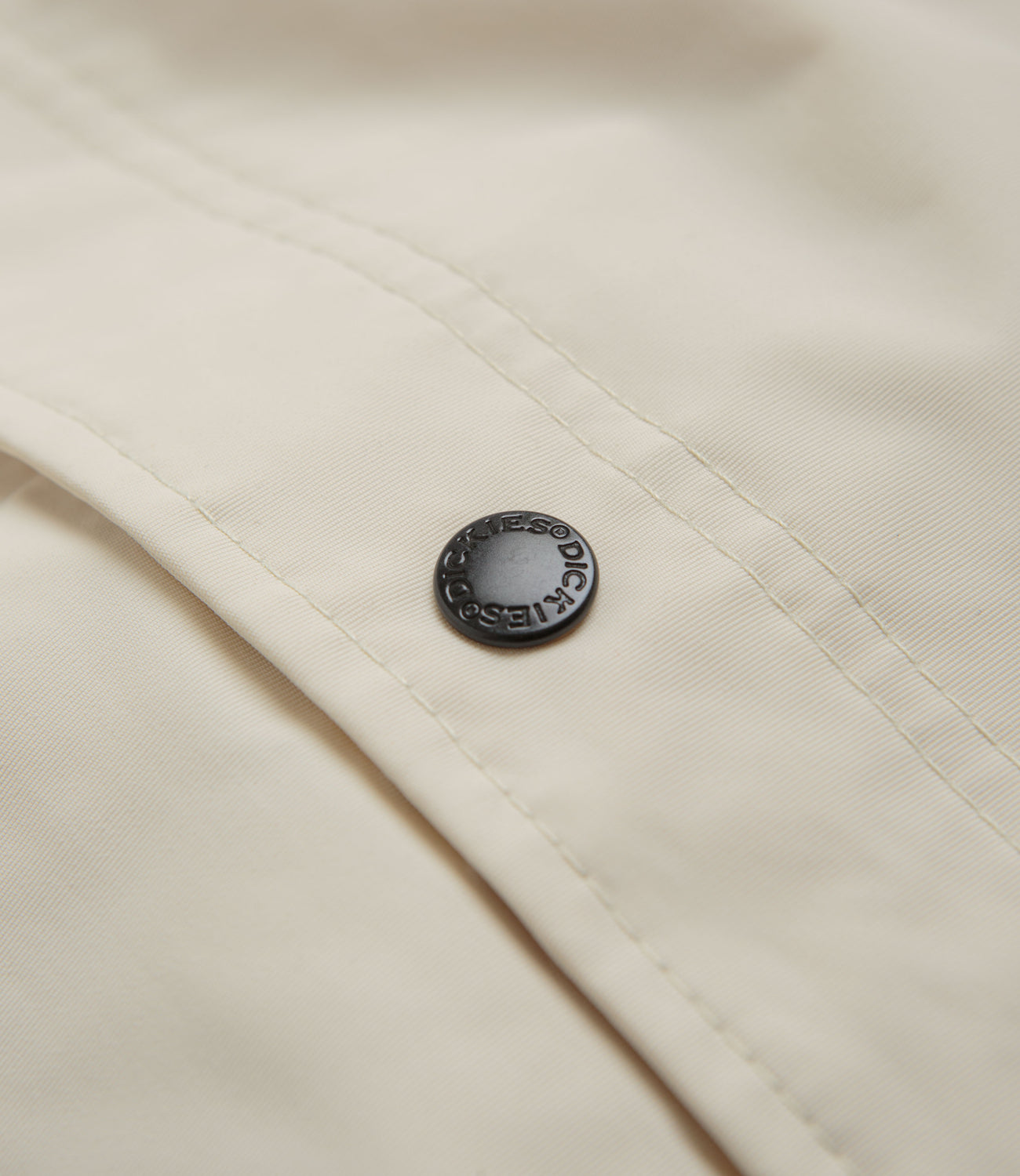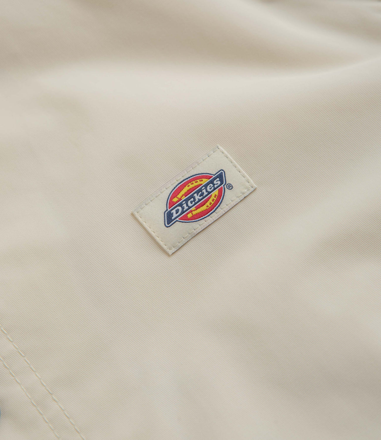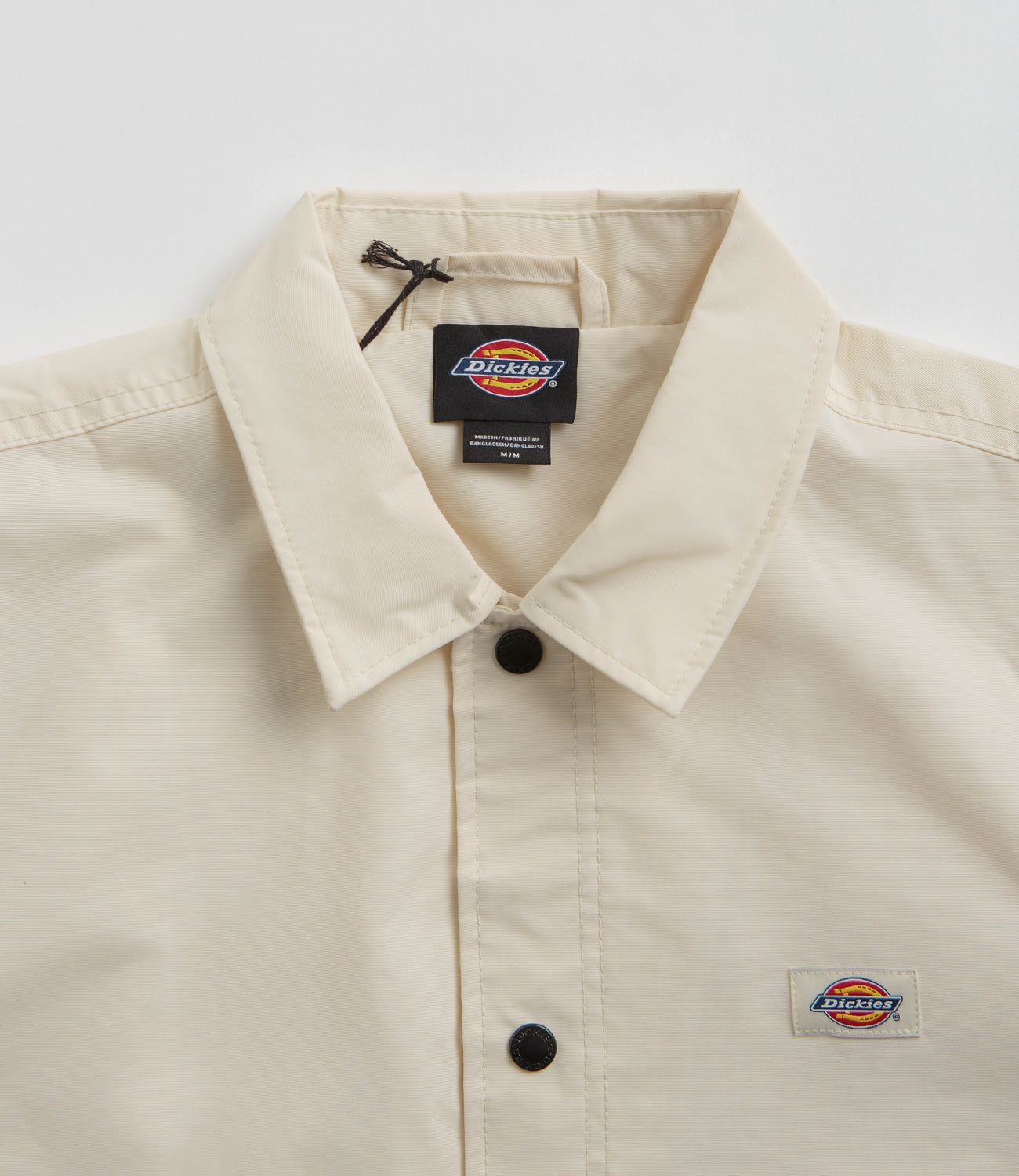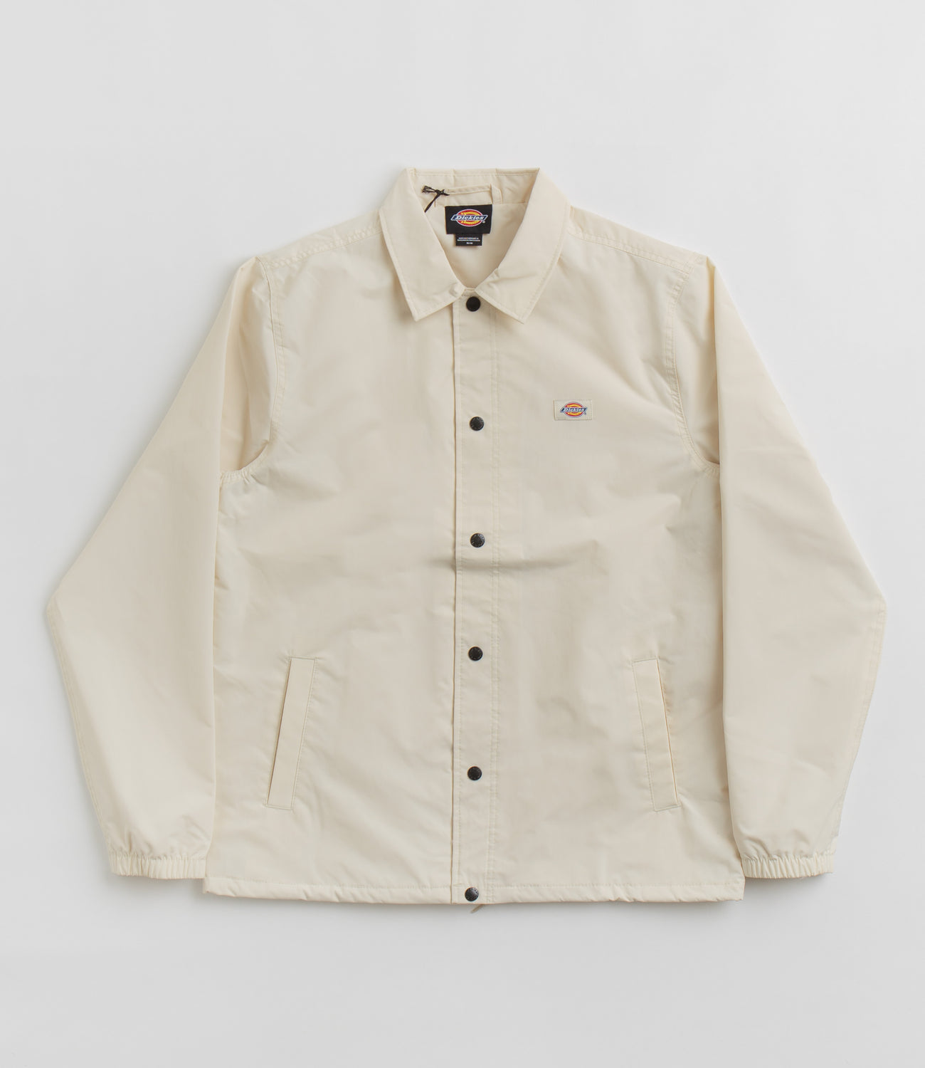 Dickies Oakport Coach Jacket in Whitecap Grey. Varsity inspired and tailored to a unisex fitting, this colour block Dickies jacket is made from 100% nylon with a coated ottoman construction. Featuring a classic stand collar, a full length snap button fastening, elasticated cuffs and a drawstring waist, this beige Dickies jacket is finished with two side pockets and with woven flag label branding.