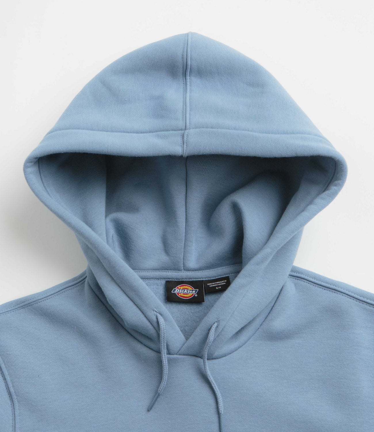 Dickies Oakport Hoodie in Country Blue. Relaxed fitting and made from a cotton-polyester blend, this Dickies hoodie is designed with an adjustable drawstring hood and flat-locked seams. Finished in blue with a kangaroo front pocket, ribbed cuffs and woven flag label branding.