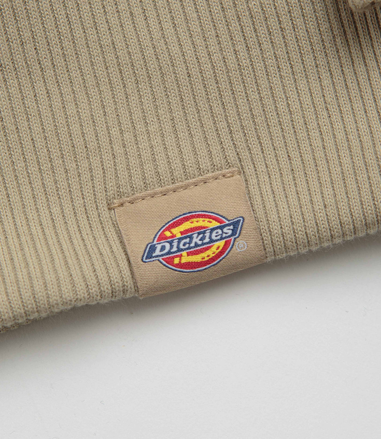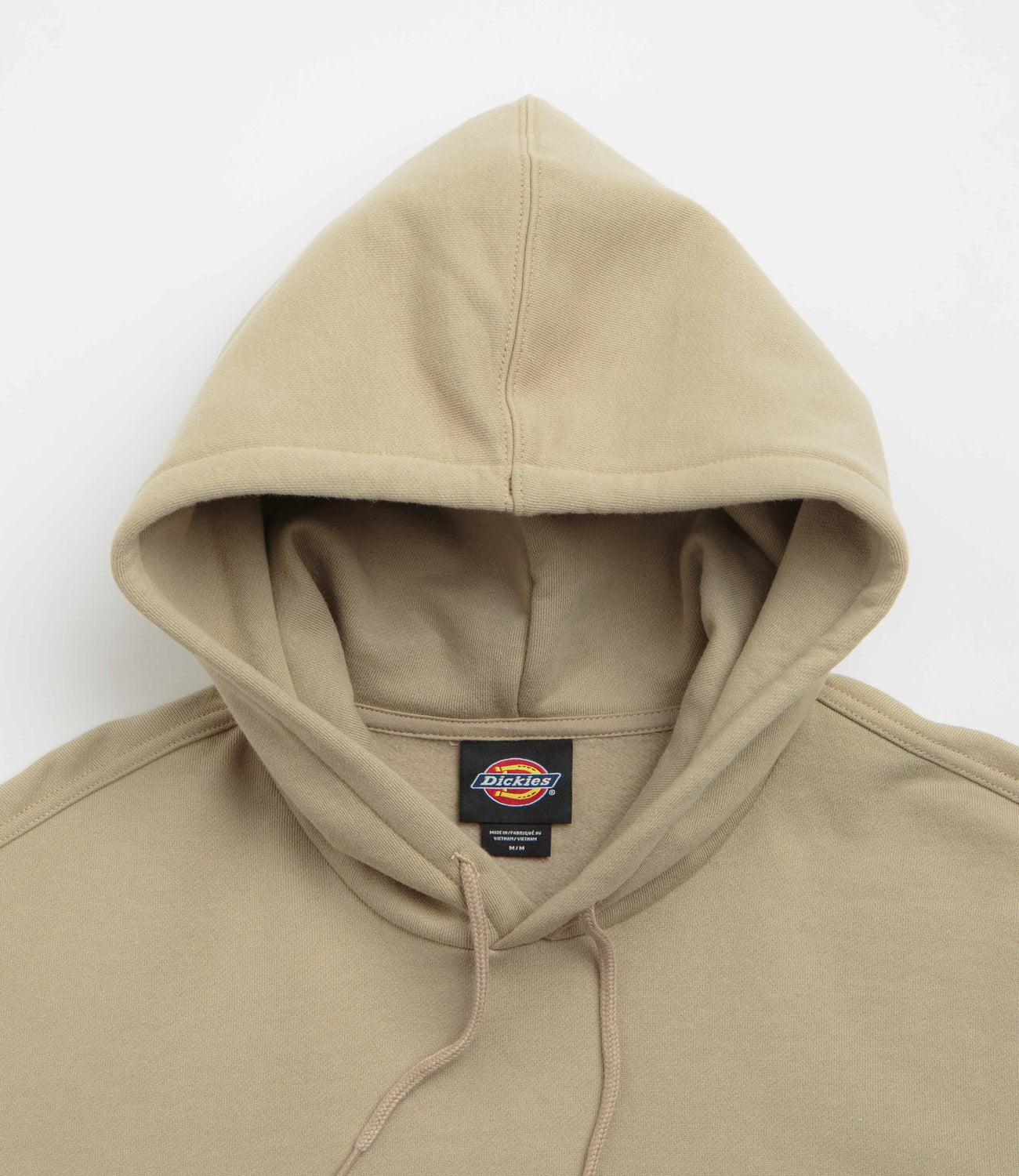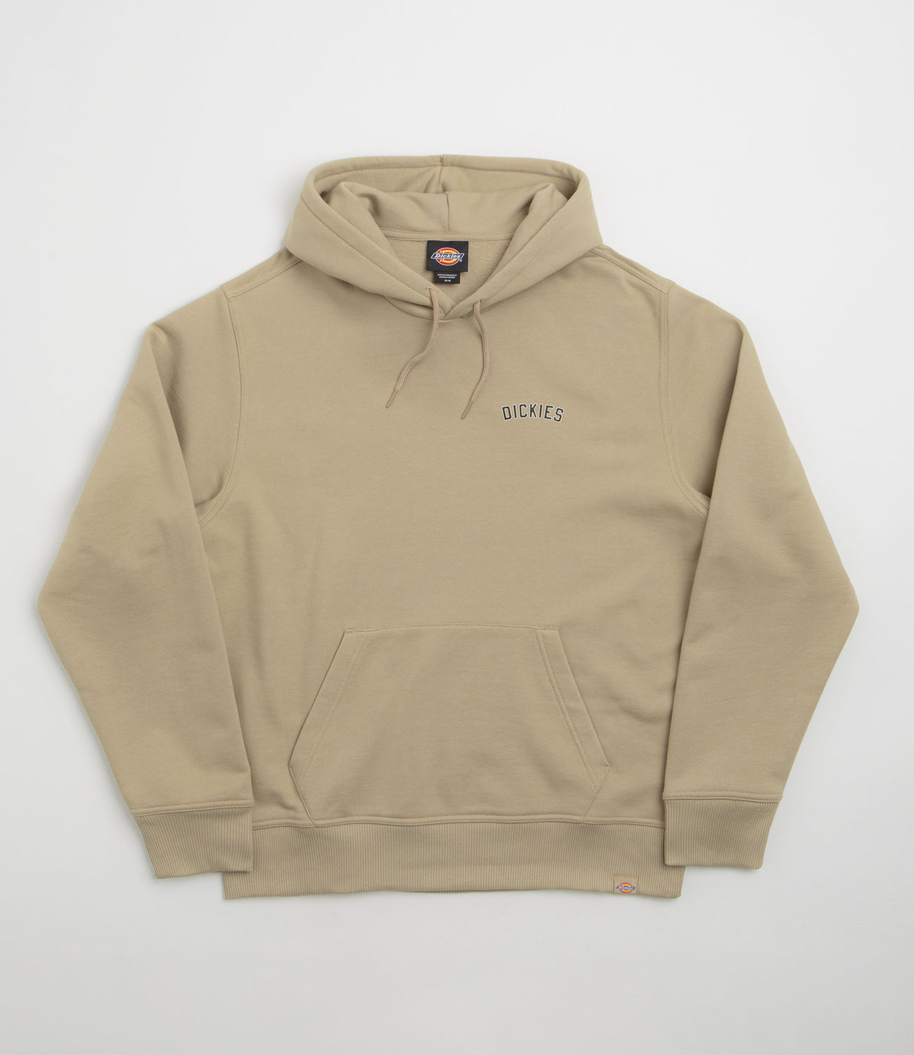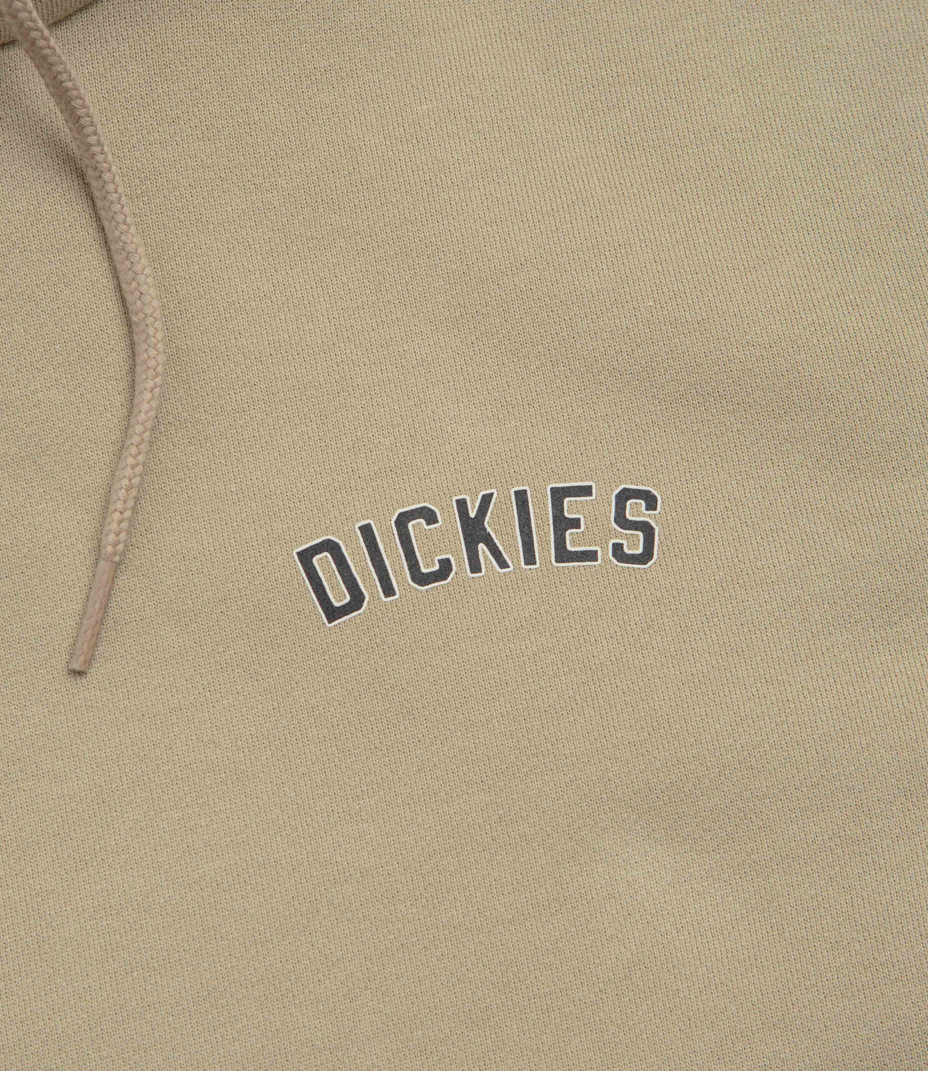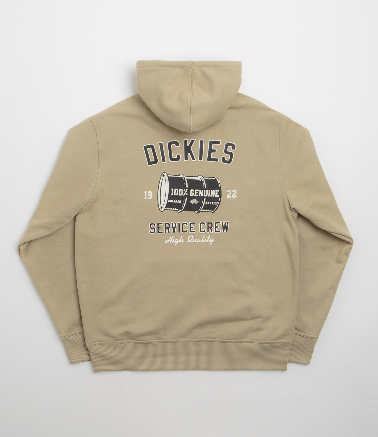 Dickies Service Crew Hoodie in Desert Sand. Regular fitting and made from a cotton-polyester blend, this block tone Dickies hoodie is designed with an adjustable drawstring hood. Finished in khaki beige with ribbed cuffs, a kangaroo front pocket and printed front and rear graphics.