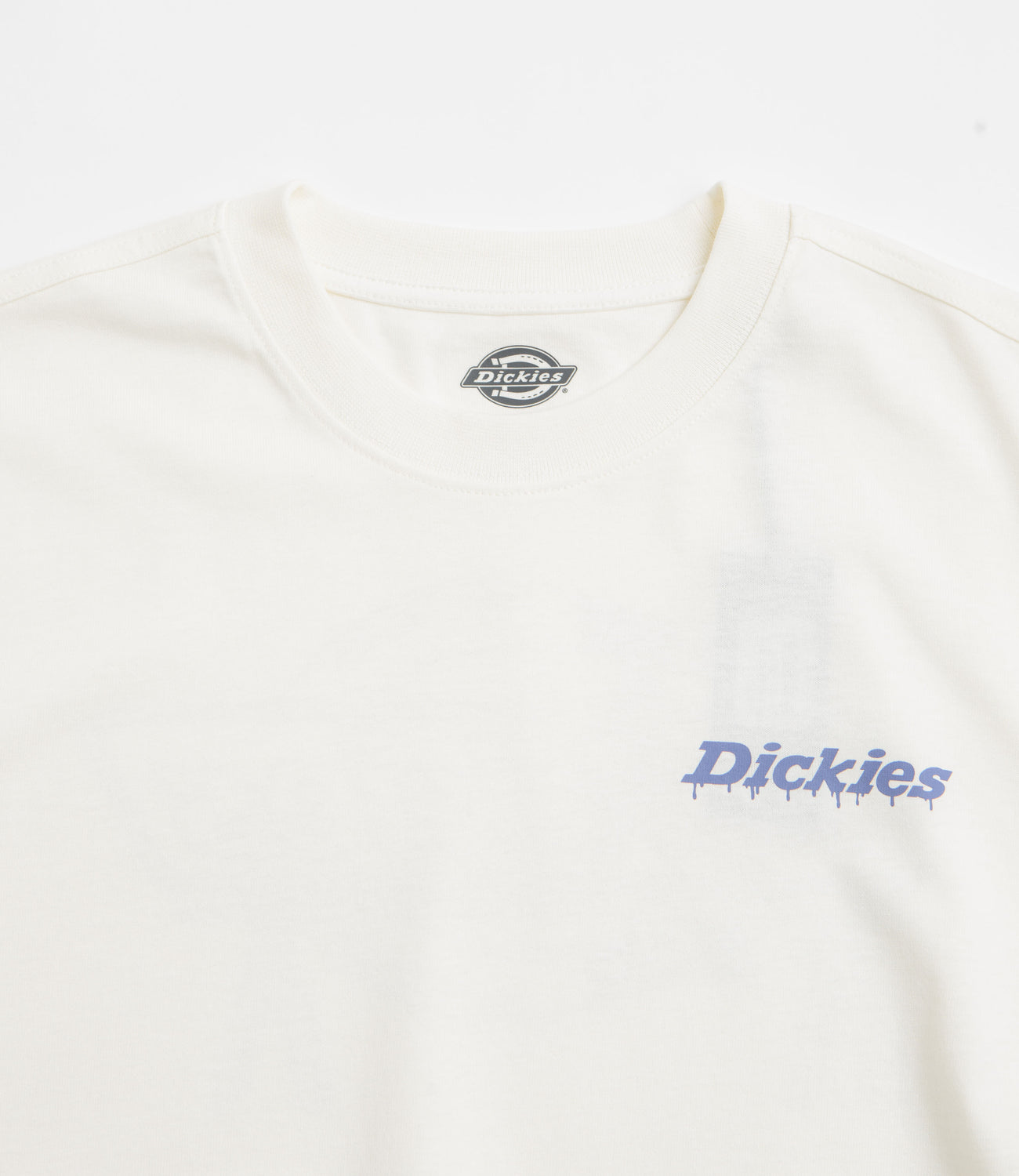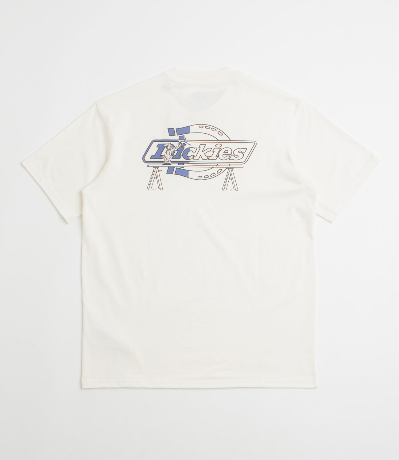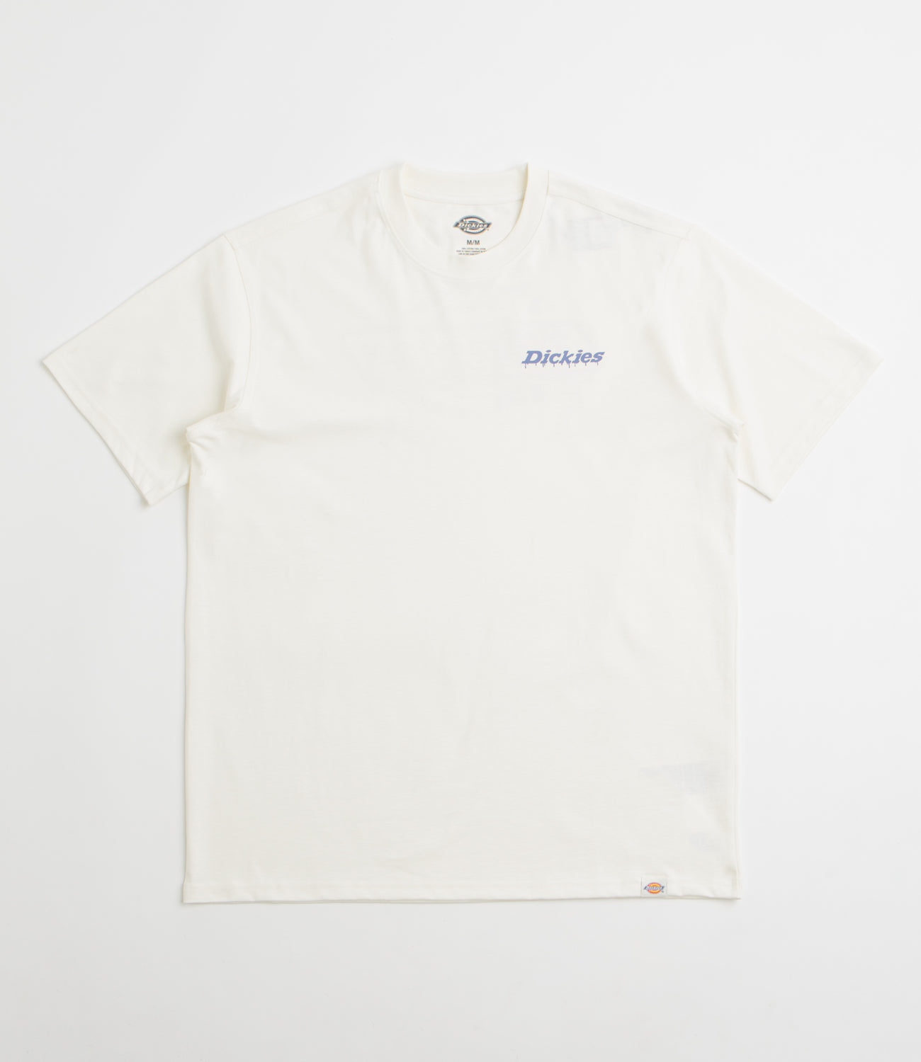 Dickies Statesville T-Shirt in Egret. Relaxed fitting, this Dickies t-shirt is designed with a classic crew collar and a flag labelled hem. Made from 100% cotton and finished in white with screen printed front and rear graphics.