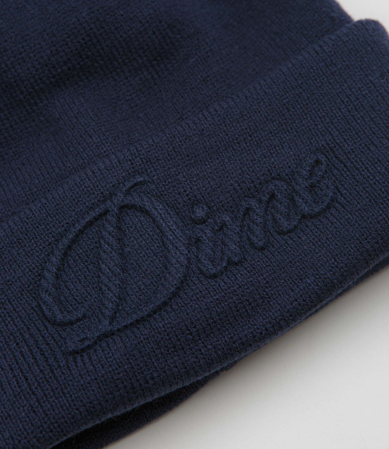 Dime Cursive Fold Beanie in Navy. Single sized and made from 100% acrylic, this Dime beanie is designed with a rib knit face and a fold-over cuff. Finished in navy with embroidered logo branding.