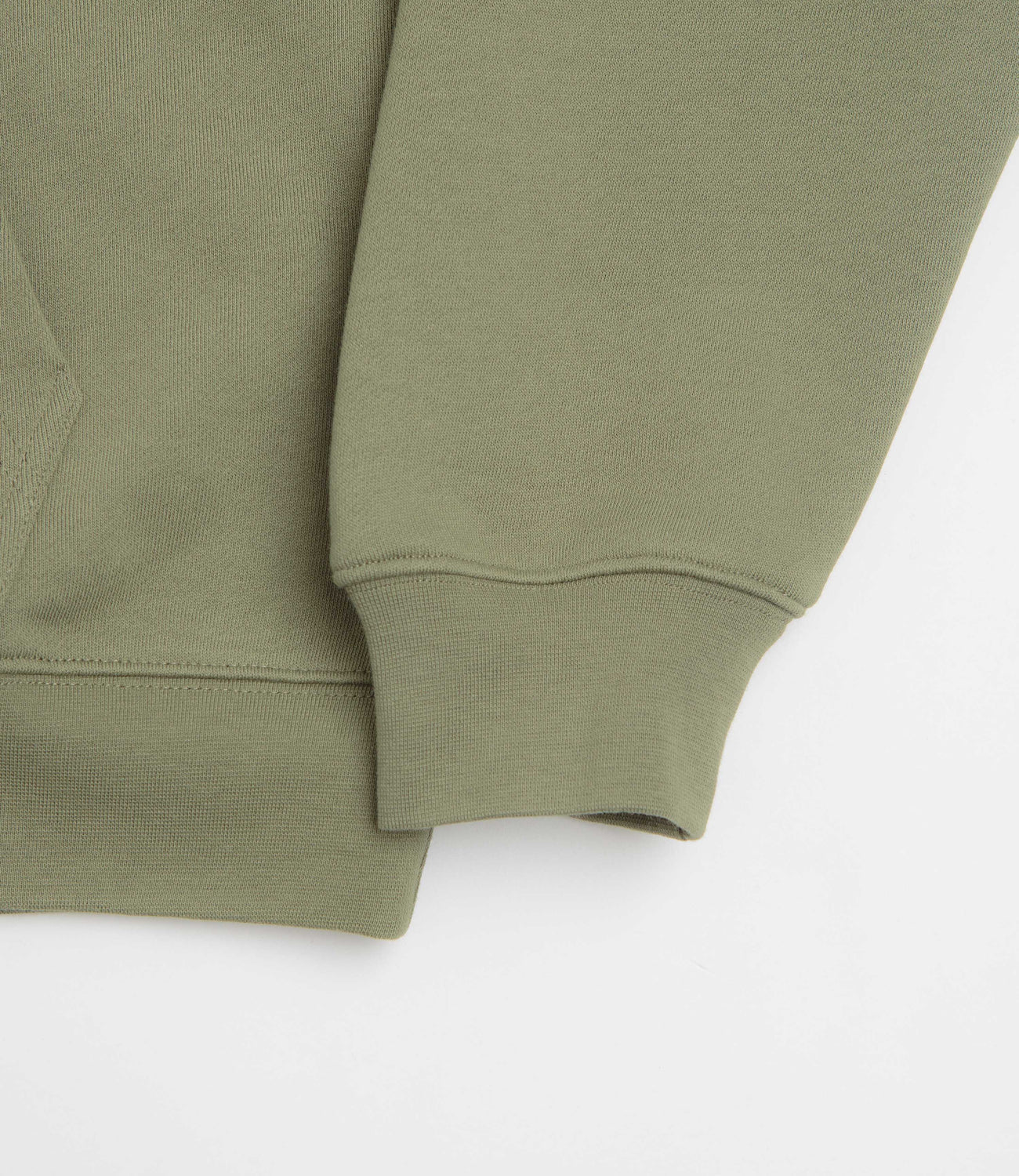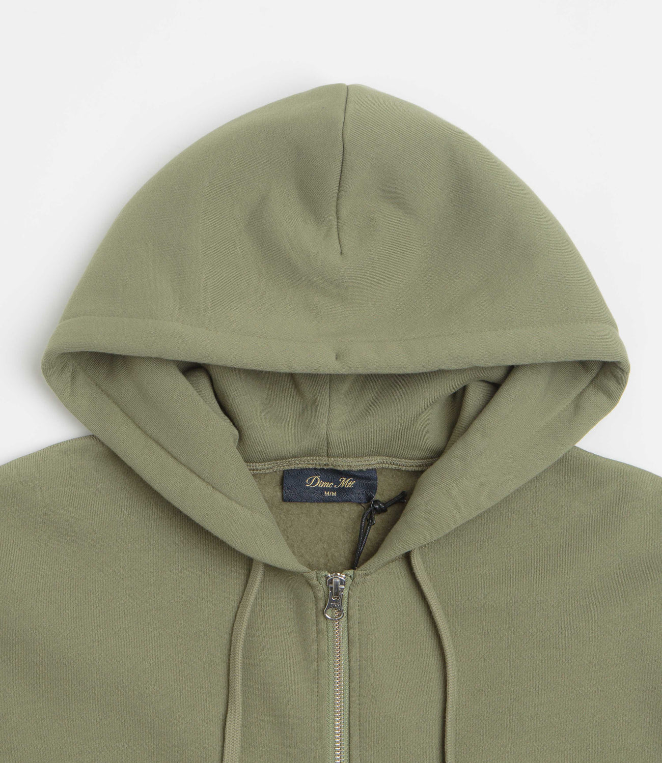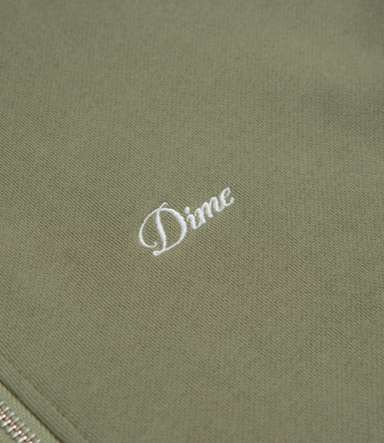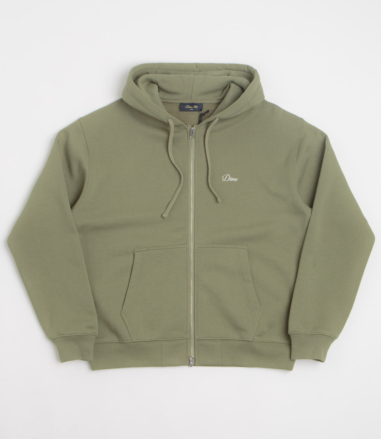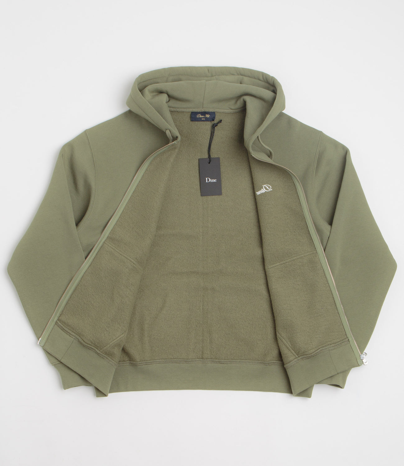 Dime Cursive Full Zip Hoodie in Army Green. Designed with a two-way zipper fastening, this block tone Dime hoodie is made from a cotton-polyester blend. Featuring an adjustable drawstring hood, two front pockets and ribbed cuffs, this green Dime hoodie is finished with embroidered logo branding.