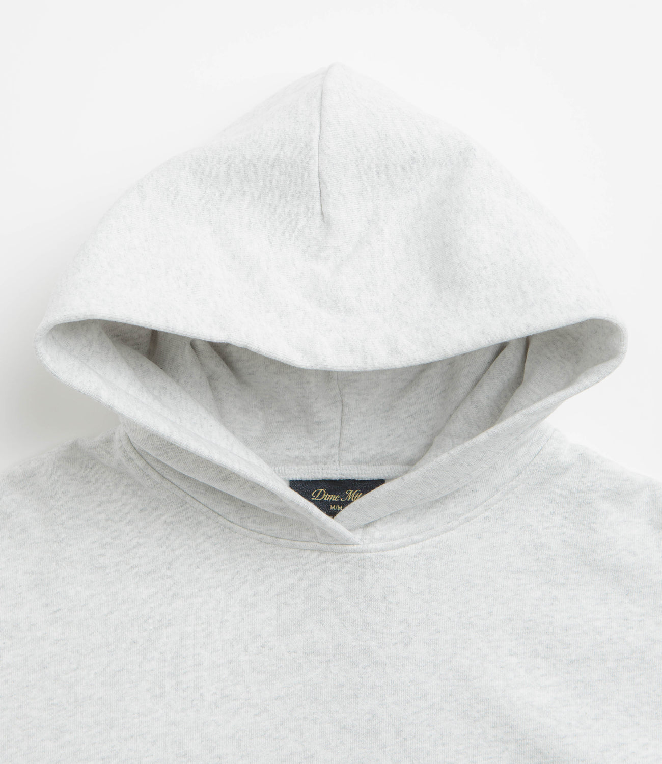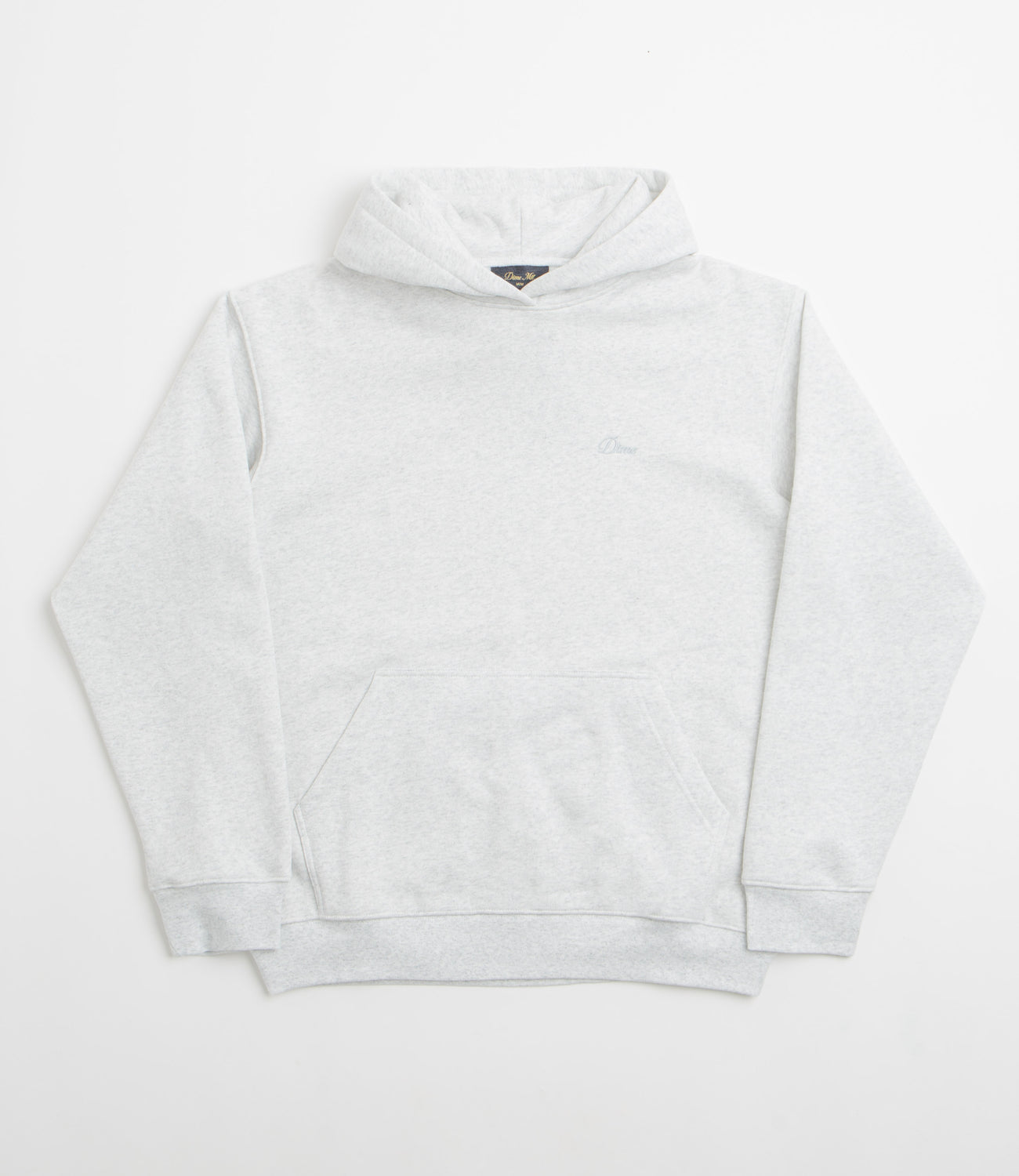 Dime Cursive Small Logo Hoodie in Ash. Regular fitting and made from 100% heavyweight cotton, this block tone Dime hoodie is designed with a split panel hood and a kangaroo front pocket. Finished in ash grey with ribbed cuffs, a woven elastic hem and an embroidered chest logo.