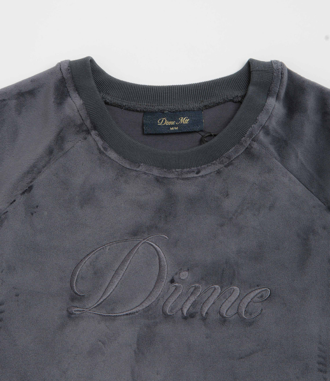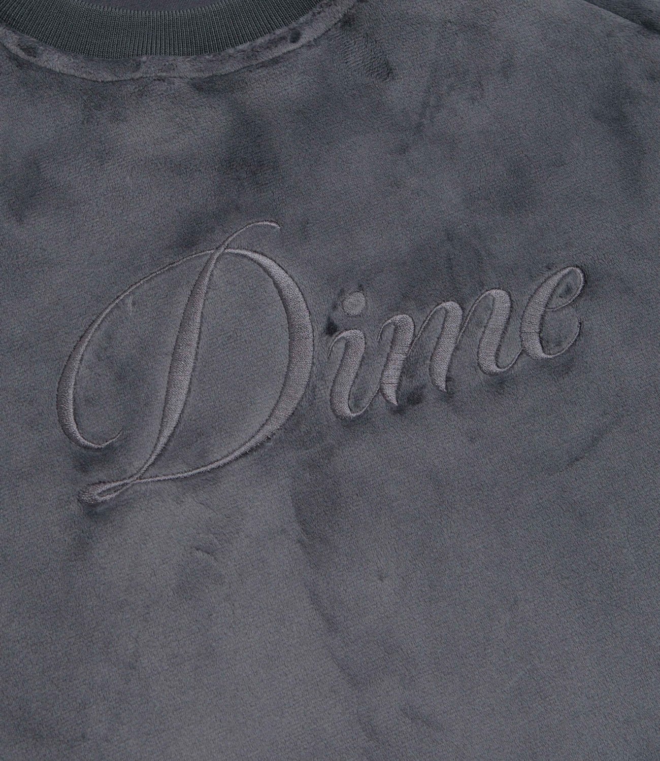 Dime Cursive Velvet Crewneck Sweatshirt in Smoke. Designed with a soft velvet exterior made from 100% polyester, this Dime sweatshirt is styled with a rib knit collar and raglan sleeves. Finished in grey with ribbed cuffs, a woven elastic hem and an embroidered logo.