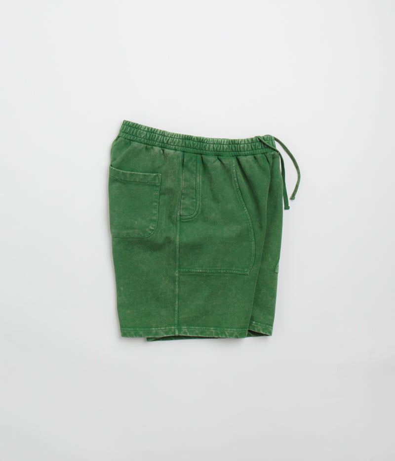 Dime Cyclone French Terry Shorts in Evergreen Snow Washed. Relaxed fitting and cut to an above-knee length, these Dime shorts are made from 100% cotton French terry. Featuring an elasticated waistband, wavy front pockets and a snow washed construction, these green Dime shorts are finished with embroidered logo branding.