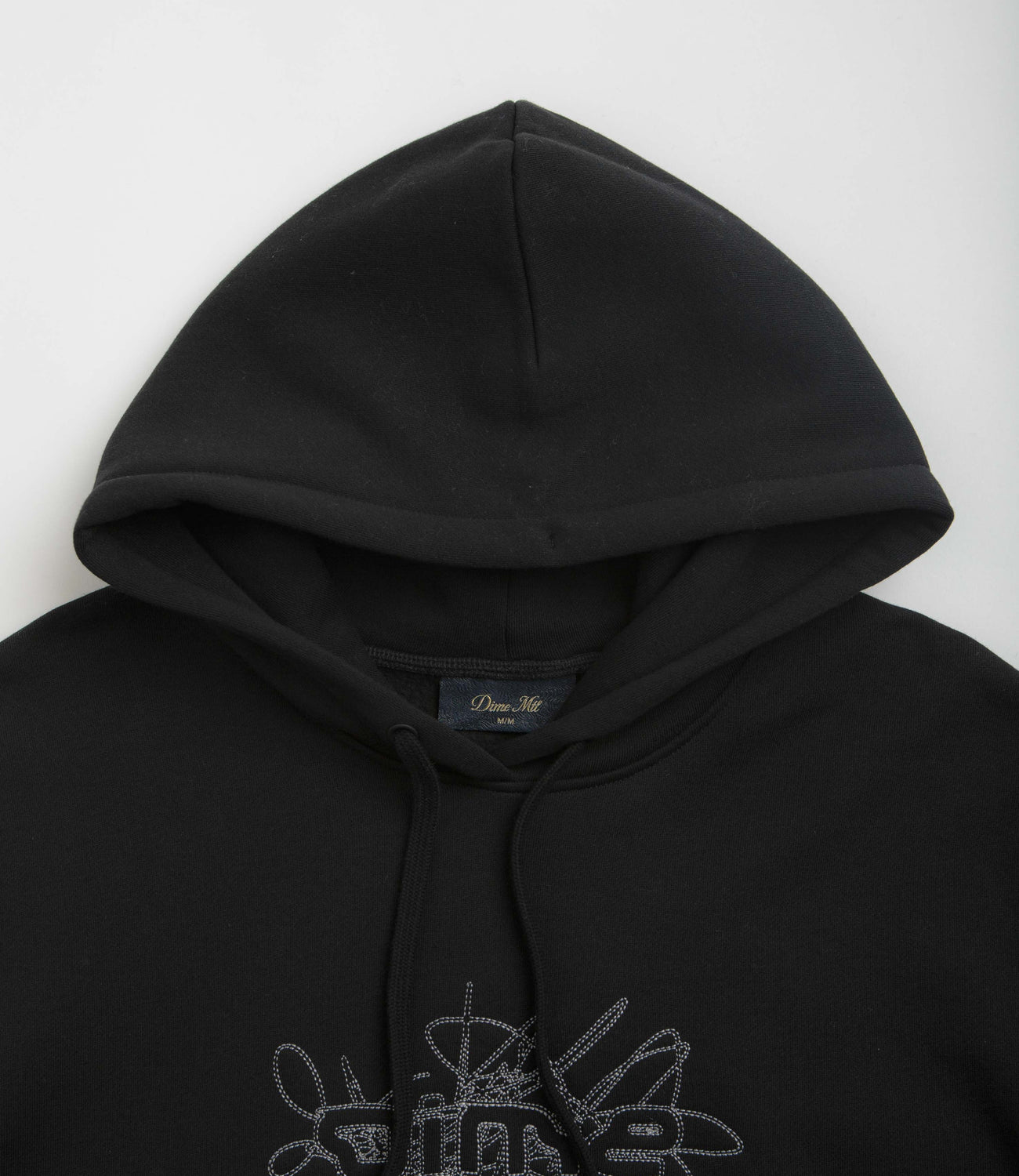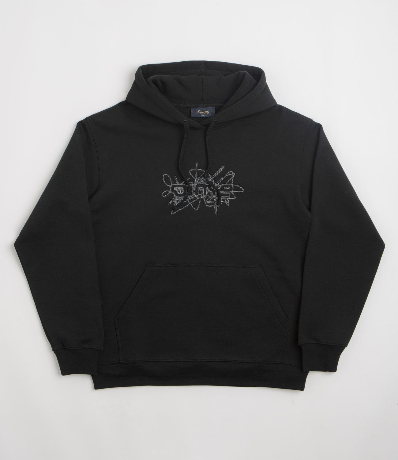 Dime Glyph Hoodie in Black. Made from a midweight cotton-polyester blend, this regular fitting Dime hoodie is designed with an adjustable drawstring hood and a kangaroo front pocket. Finished in black with ribbed cuffs, a woven elastic hem and an embroidered graphic.