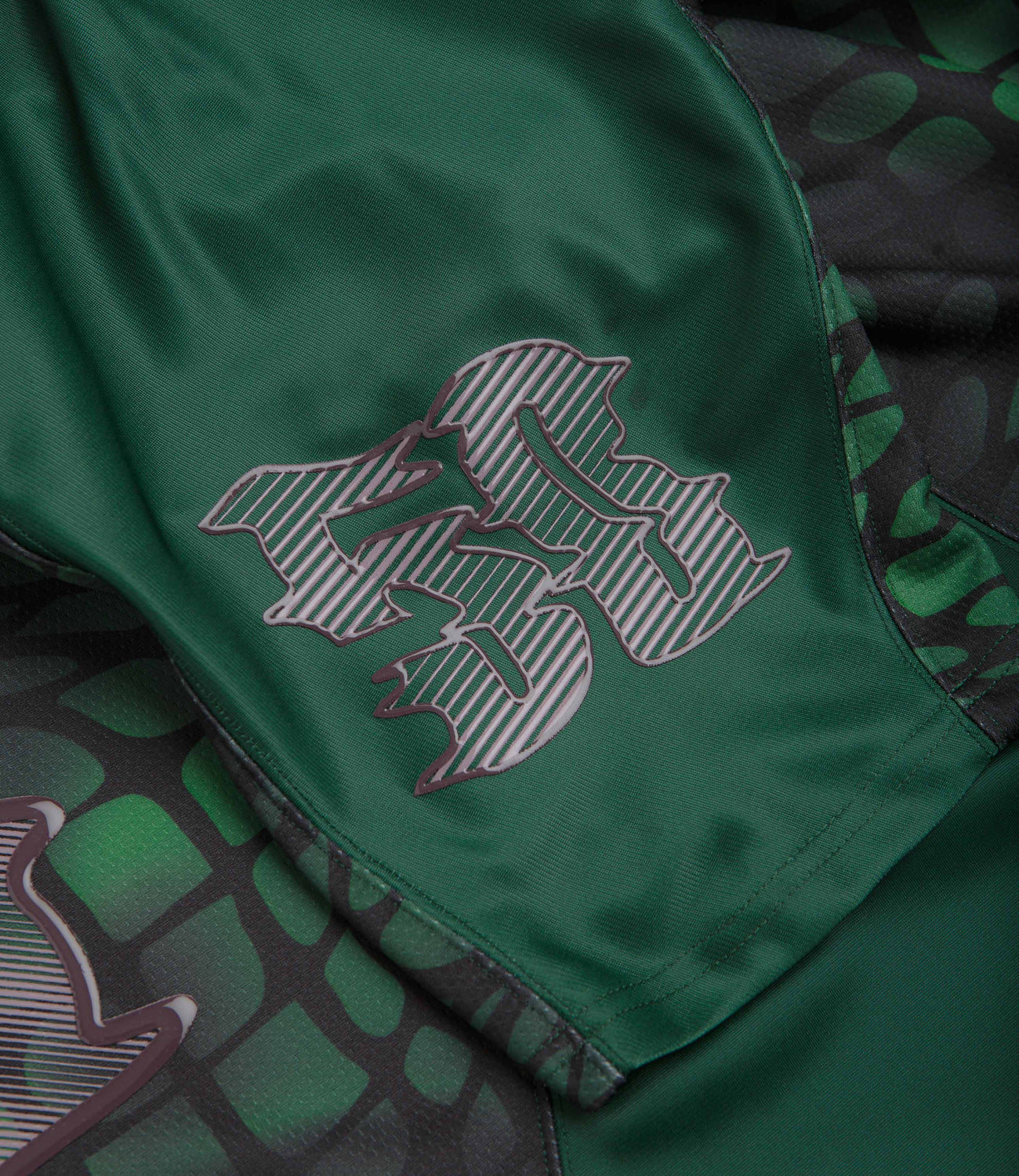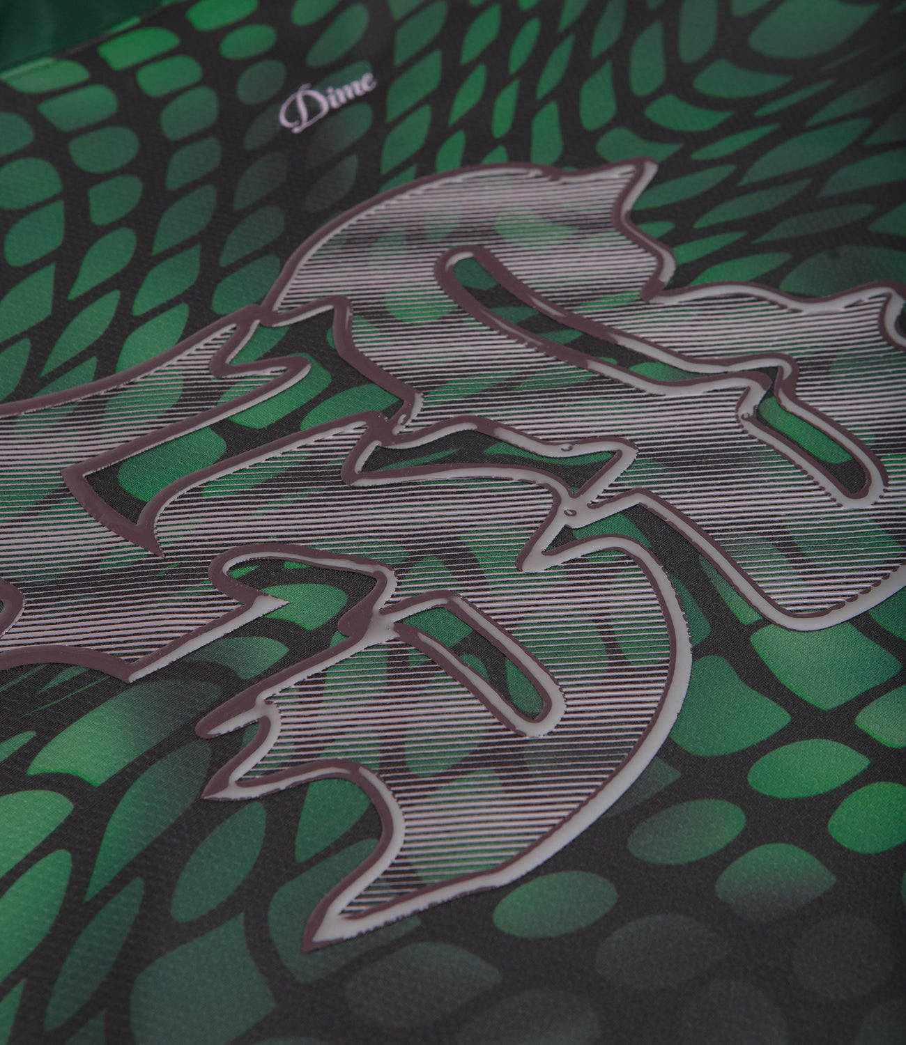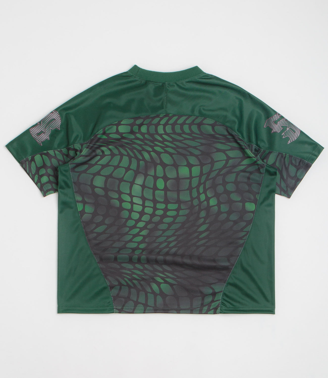 Dime N50 Jersey in Dark Green. Regular fitting with all-over artwork, this Gramicci jersey is made from 100% polyester with a rib knit collar. Featuring satin fabric details, side panels and shoulder yoke accents, this green Dime jersey is finished with an embroidered logo and a silicone printed graphic.